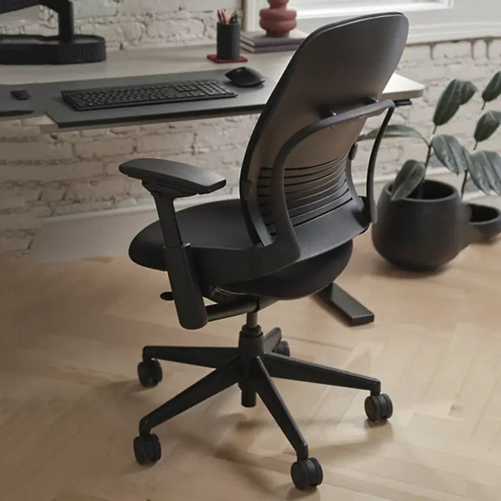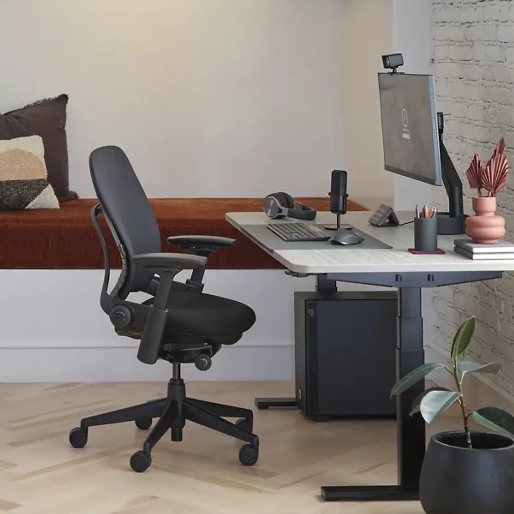 Discover the Leap Upholstered Adjustable Chair from Steelcase. With a keen focus on design, this chair offers 4-way adjustable arms, enabling you to customize the height, width, pivot, and depth to your specifications. It also features adjustable seat depth for a customized feel. Leap is made in part recyclable and recycled materials. Additionally, this chair provides extra lumbar support for your comfort, augmented by the metal framework and comfortable fabric cushion.