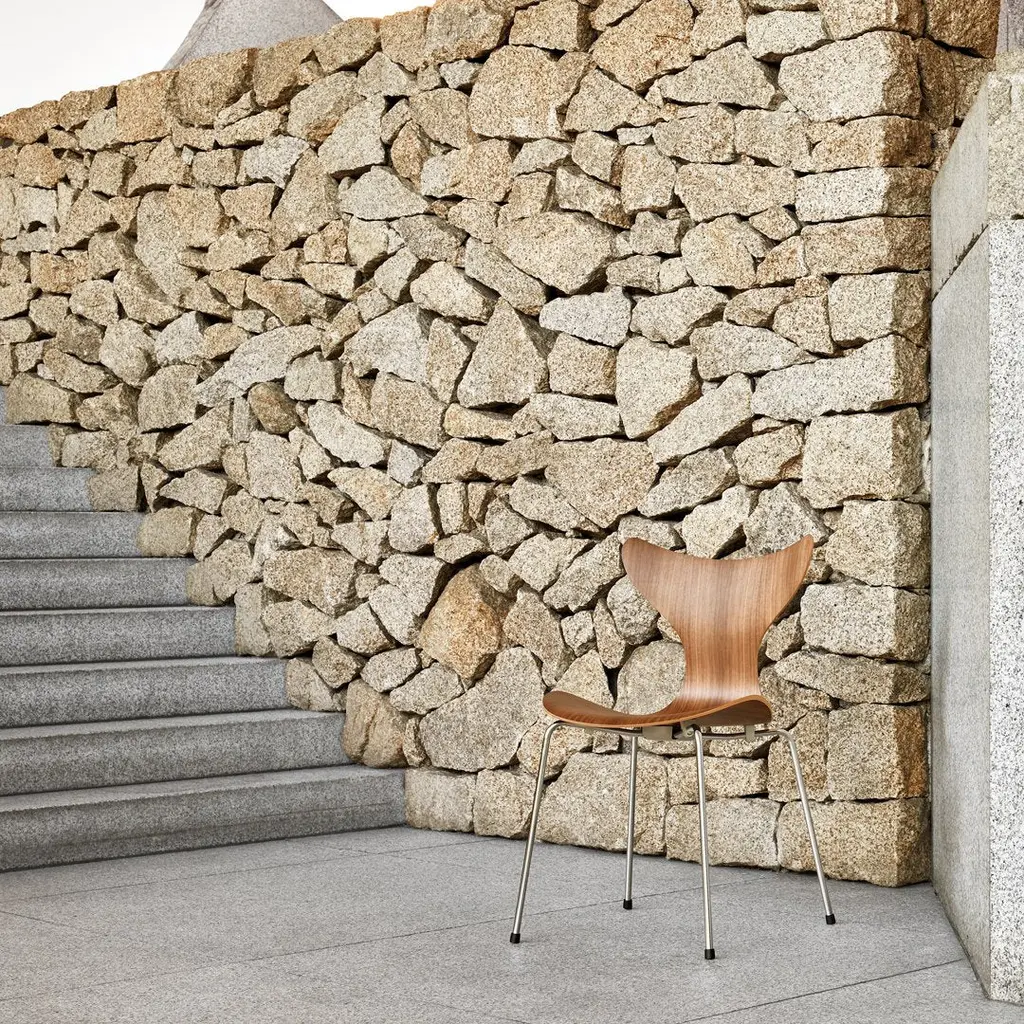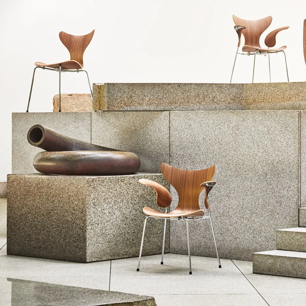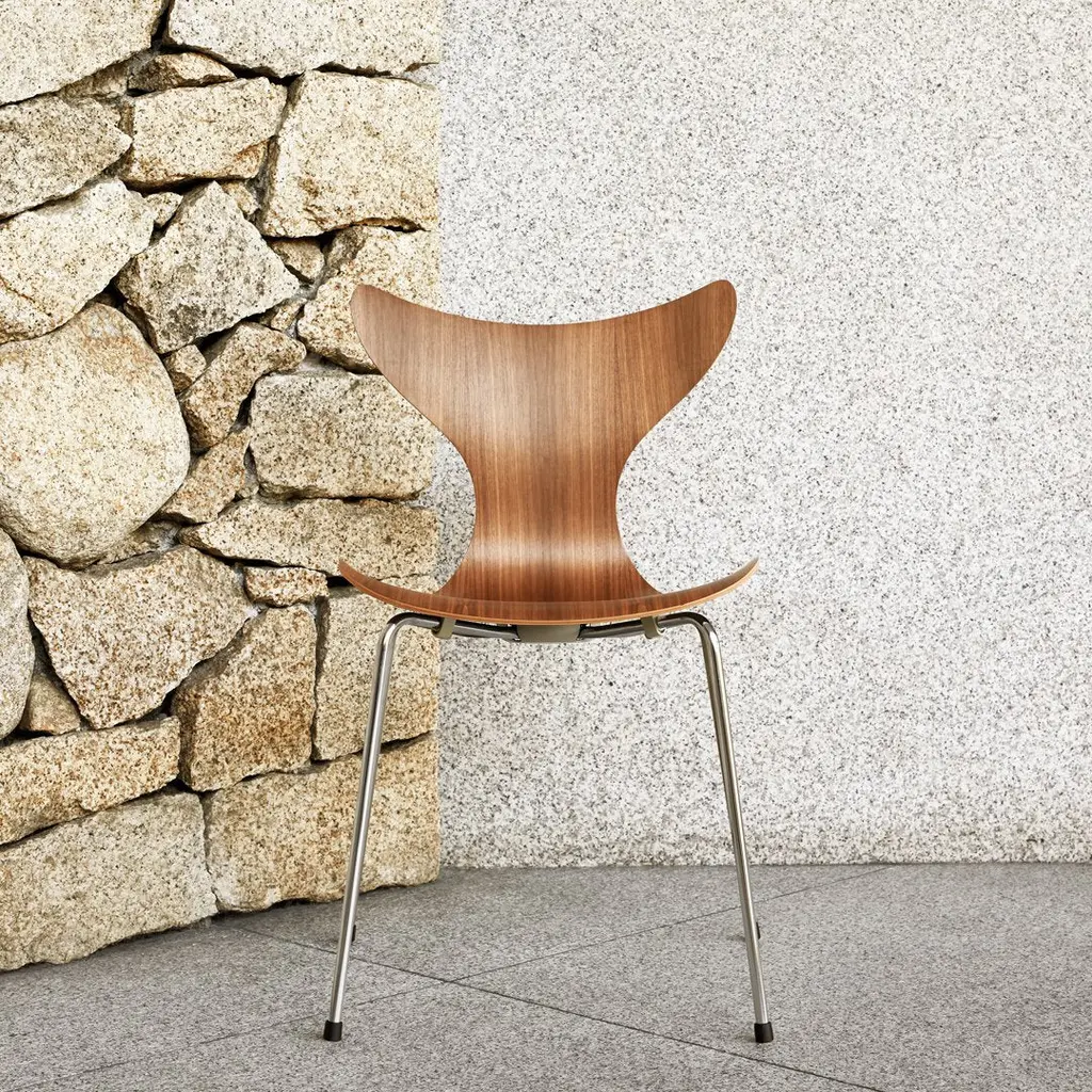 The Lily was originally designed for the Danish National Bank. The first model was 3108 from 1968, and the chair was introduced to the market with arms, model 3208, at the Danish Furniture Fair in 1970. The chair is made from laminated sliced veneer and is the result of an extremely complicated moulding process that ensures the perfect curves and the best comfort. To celebrate the 50th anniversary of The Lily, the last chair Arne Jacobsen ever designed, we are now relaunching the original version in walnut veneer. Each anniversary chair will feature a special tag mounted underneath the chair.