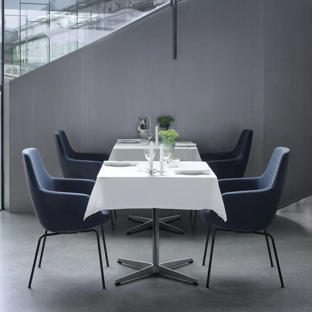 The Giraffe which earned its name because of its high backrest, dates back to 1959. Arne Jacobsen is the designer behind this beauty, and it was part of his total design of SAS Royal Hotel in Copenhagen. Jacobsen played around with the Giraffe and made different versions, and the one we know today is the Little Giraffe, characterised by a lower back and a four-legged base. The Little Giraffe caters for daily use in hotel lobbies, canteens or meeting rooms as well as working beautifully around any dining table at home. No matter the space surrounding the Little Giraffe, it tells a tale of original Arne Jacobsen design, of impeccable Fritz Hansen upholstery skills and of a sculpture that simultaneously embodies both aesthetics and comfort. Like Arne Jacobsen's many other pieces of furniture created with Fritz Hansen, the Little Giraffe is an example of genuine mid-century Danish design which is known for its timelessness, craftsmanship and adaptability to many different interior styles.