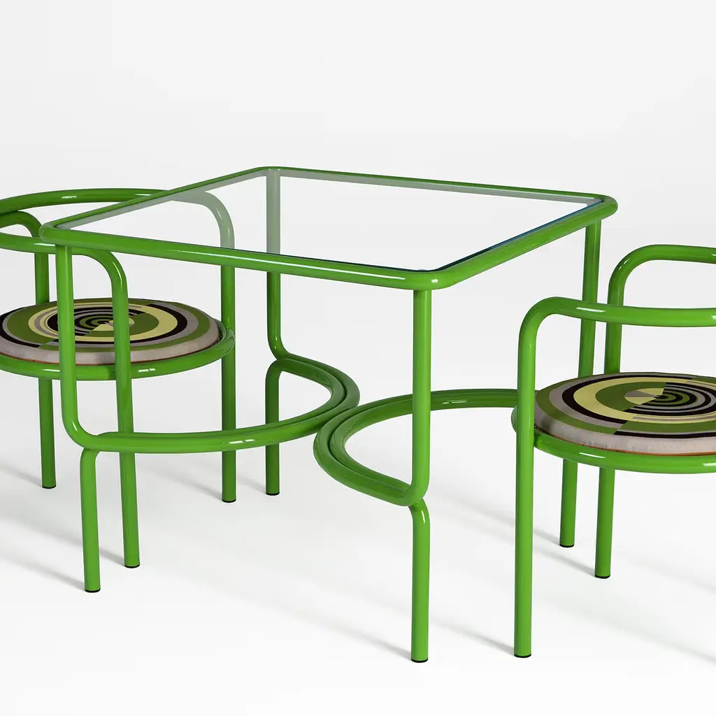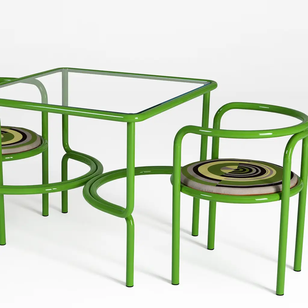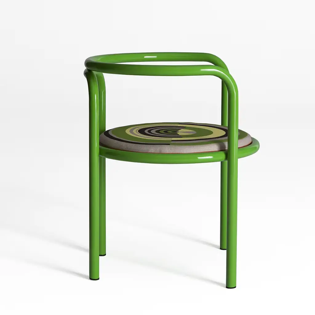 Marked by a streamlined silhouette, this chair makes an indispensable addition to any outdoor area, bringing a functional element with a colorful soul. The bright green tubular steel structure provides the perfect frame for the round padded seat upholstered with a removable fabric cover boasting an exclusive abstract print. This chair is part of the iconic Locus Solus Collection designed in 1964 by Gae Aulenti, which Exteta reintroduced in 2016 to pay homage to the late Italian architect's penchant for color and architectural style. If the products are placed completely outside, nightcovers that can be purchased at an extra price are recommended. Please contact the Concierge for further information and options.