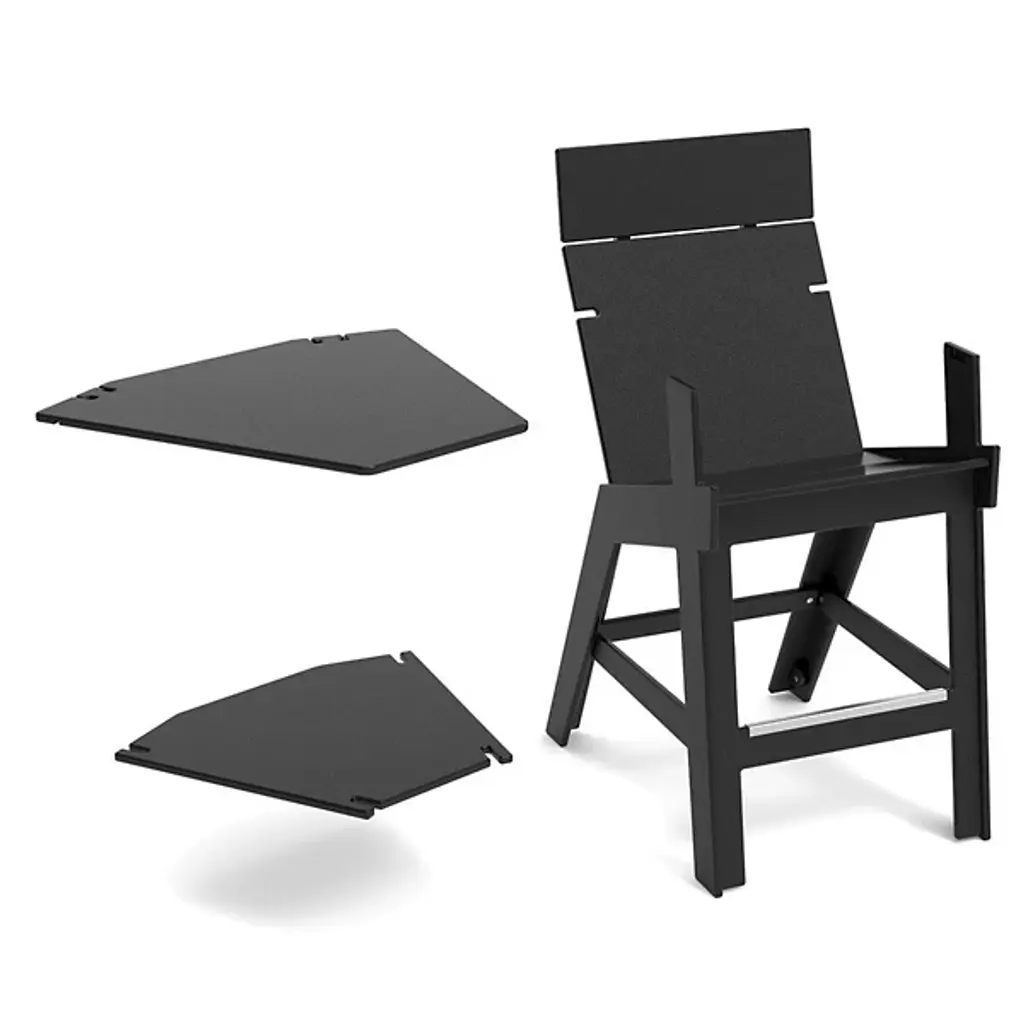 The Lollygagger Outdoor Hi-rise Chair with Bridge from Loll Designs offers a contemporary collaboration for elevated lounging. Part of the Eco-Friendly Lollygagger Collection, each element is made in the USA from recycled and re-dyed HDPE, primarily sourced from recycled milk jugs. The angular seat and footrests offer comfortable reclining, while a flat plastic bridge allows several chairs to connect at a slight angle. The seat is strong and sustainable, offering guilt-free lounging, as 1% of all sales is donated to charity.