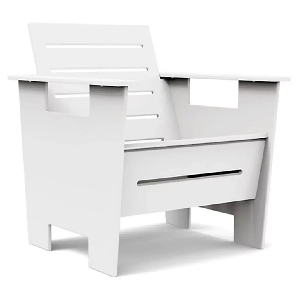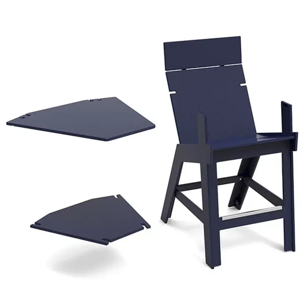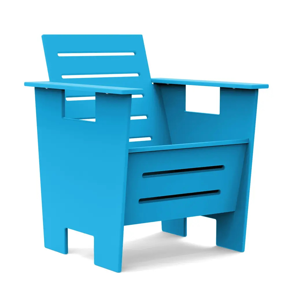The Lollygagger Outdoor Hi-rise Chair with Bridge from Loll Designs offers a contemporary collaboration for elevated lounging. Part of the Eco-Friendly Lollygagger Collection, each element is made in the USA from recycled and re-dyed HDPE, primarily sourced from recycled milk jugs. The angular seat and footrests offer comfortable reclining, while a flat plastic bridge allows several chairs to connect at a slight angle. The seat is strong and sustainable, offering guilt-free lounging, as 1% of all sales is donated to charity.