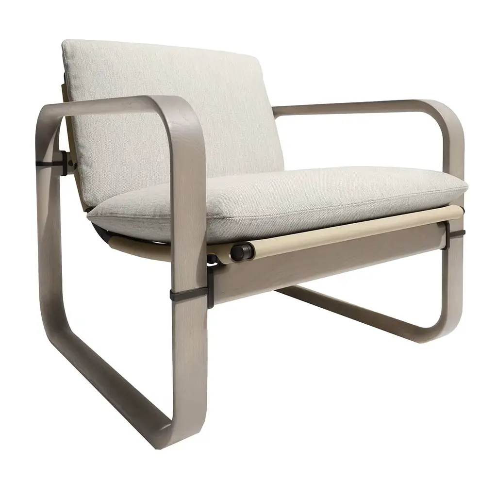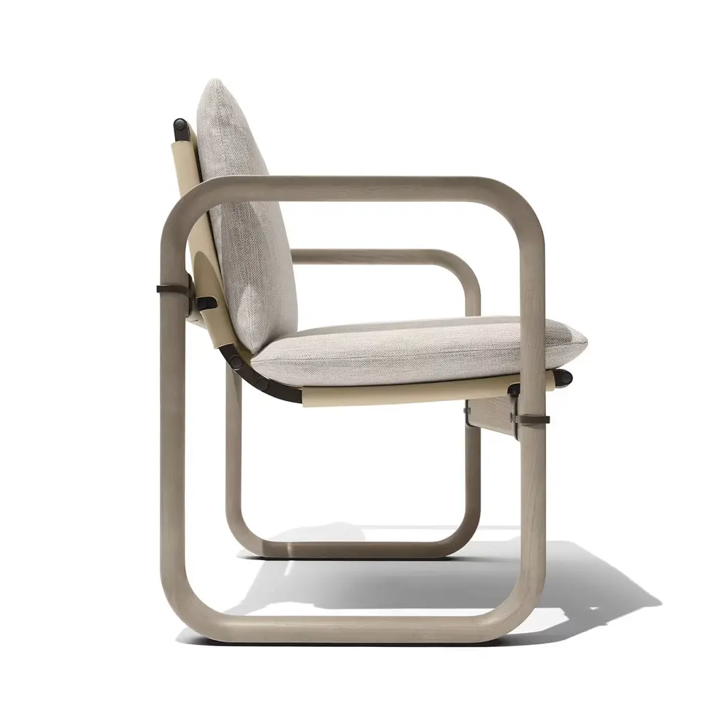 Loop outdoor small chair is born from the intersection of pure geometric shapes, refined by soft elements. The char is made of ash wood and aluminum, available in two heights. The wide cushions are covered with a removable waterproof cover.