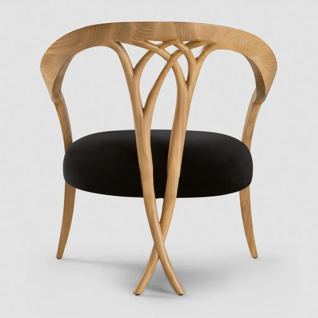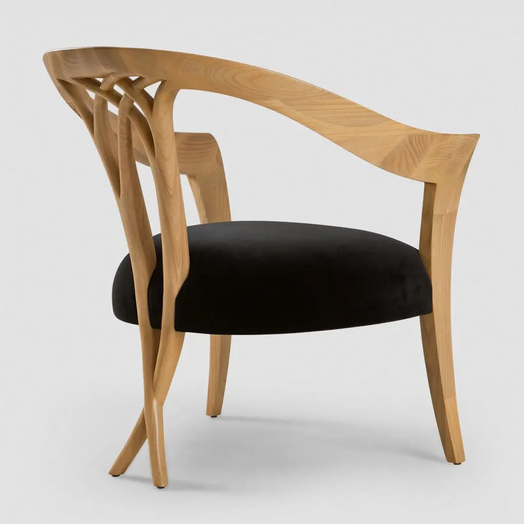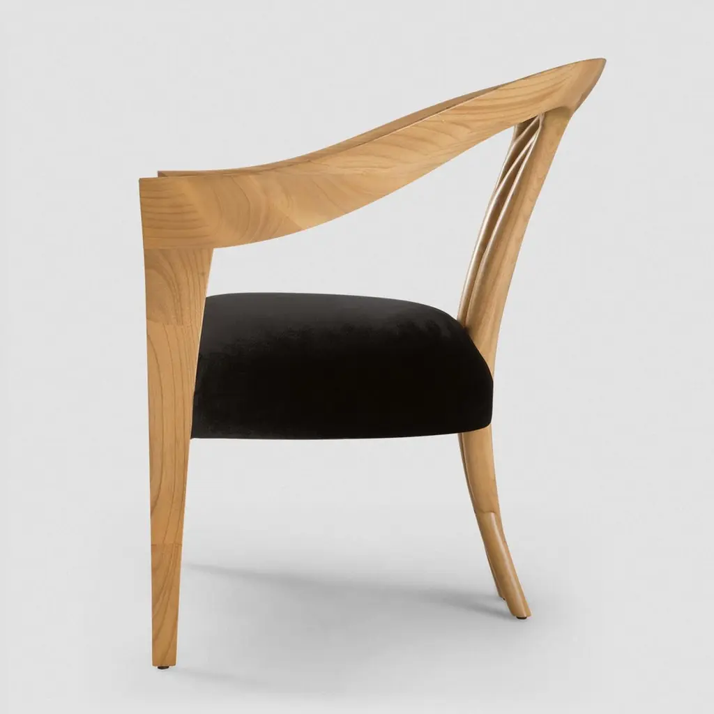 Chair Lord with hand carved structure in solid woodpolished and natural varnished, with upholstered seat covered with black Jet fabric.Also available in black or white lacquered or in naturaltabac finish. Also available with other fabrics on request.