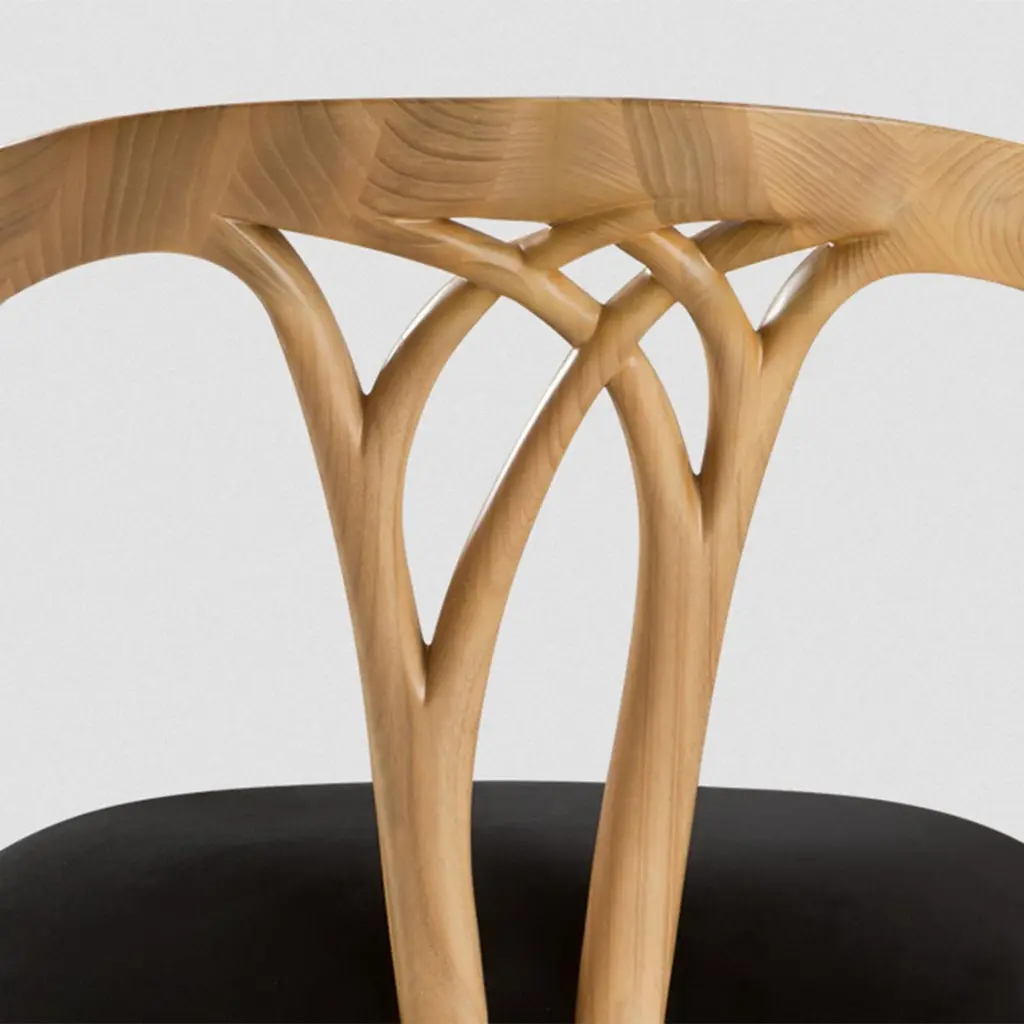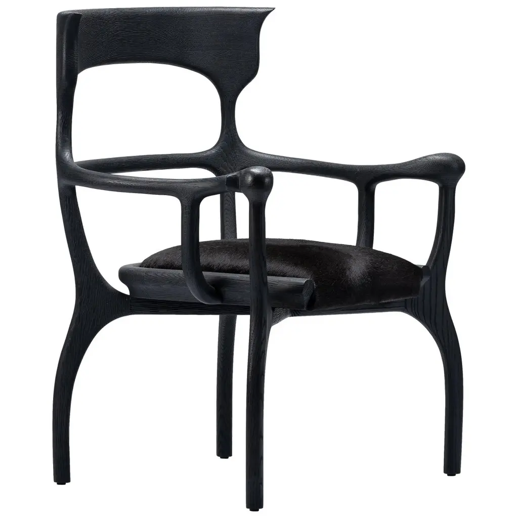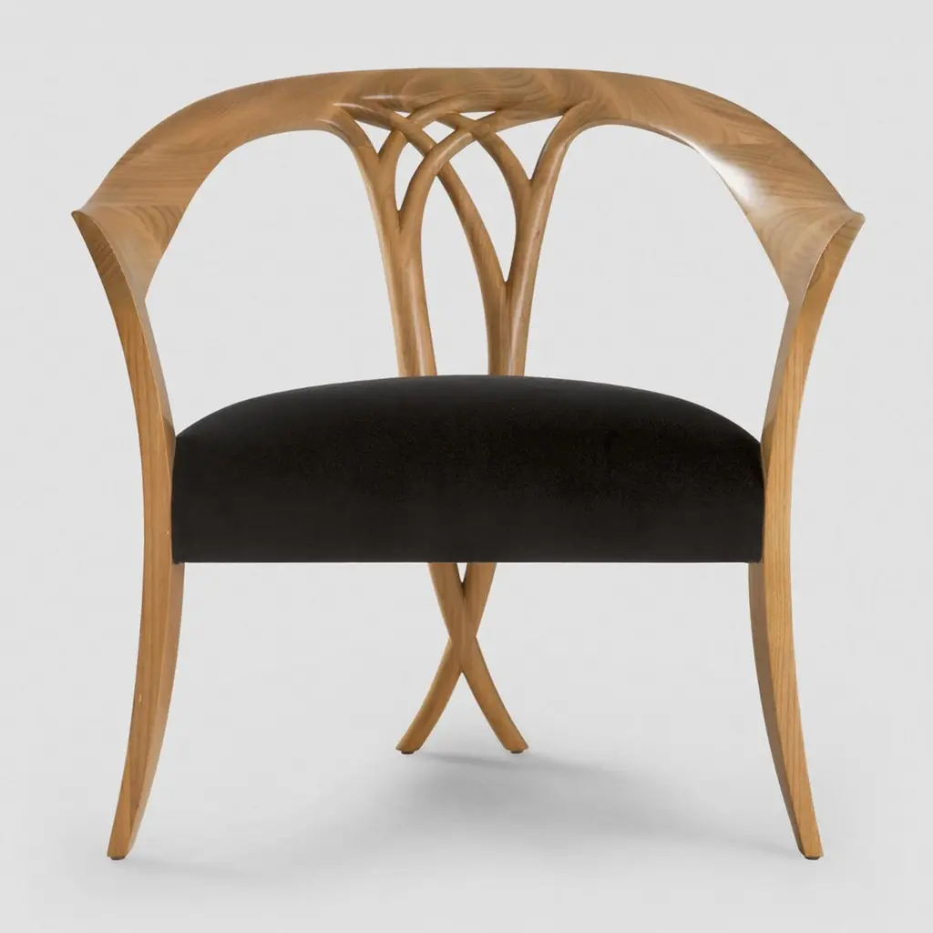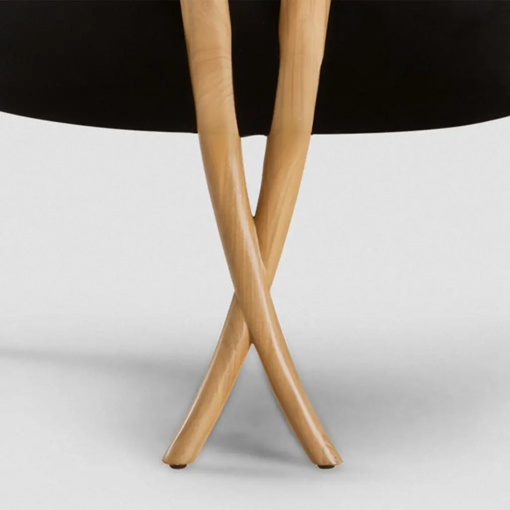 Chair Lord with hand carved structure in solid woodpolished and natural varnished, with upholstered seat covered with black Jet fabric.Also available in black or white lacquered or in naturaltabac finish. Also available with other fabrics on request.