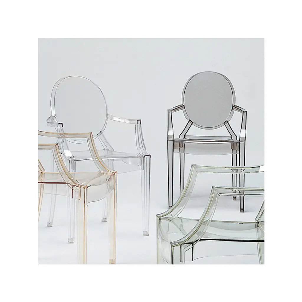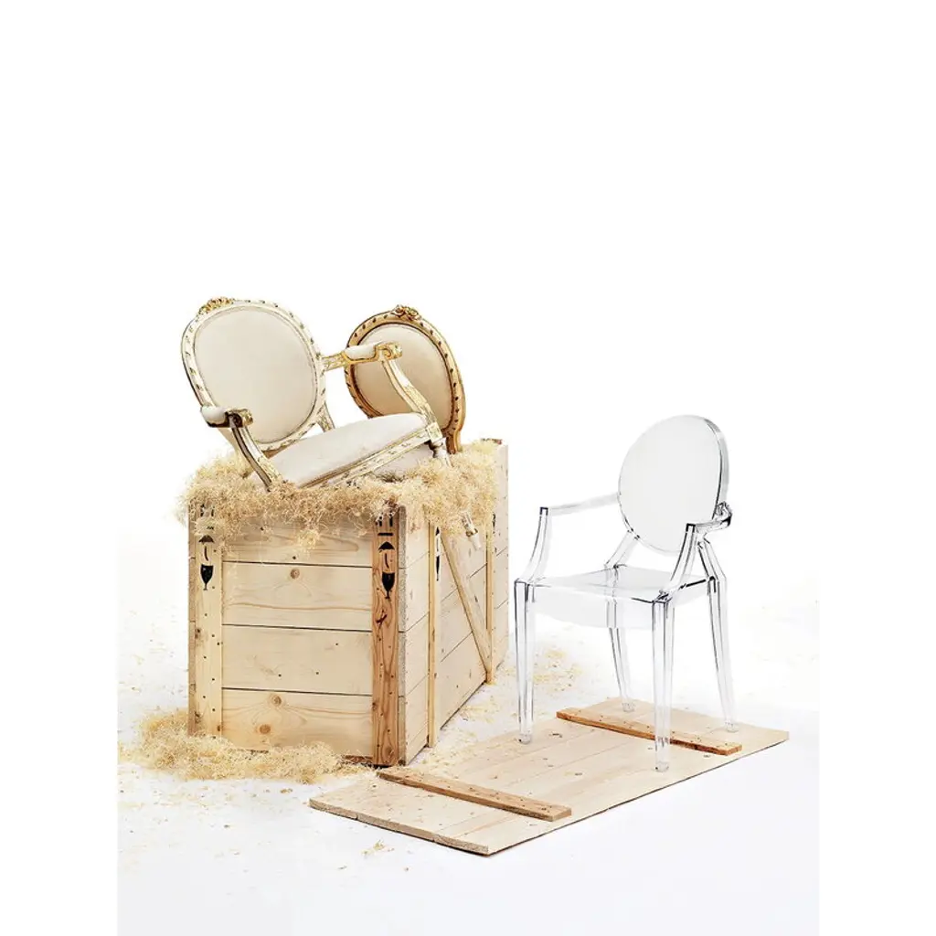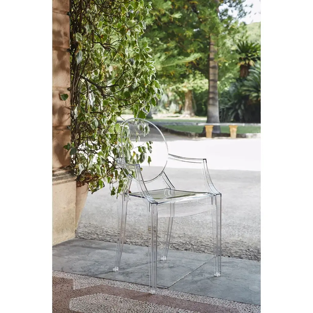 Kartell's Louis Ghost chair, designed by Philippe Starck in 2002, is an iconic interpretation of the neoclassical style armchair. Louis Ghost chair has an airy and lightweight appearance yet stable and durable structure that is extremely comfortable to sit on. The classic silhouette and modern material make Louis Ghost perfect for all types of interiors and uses. The chair is stackable and also suitable for outdoor use.