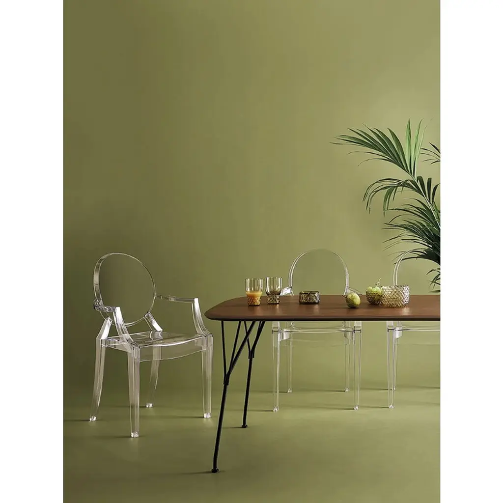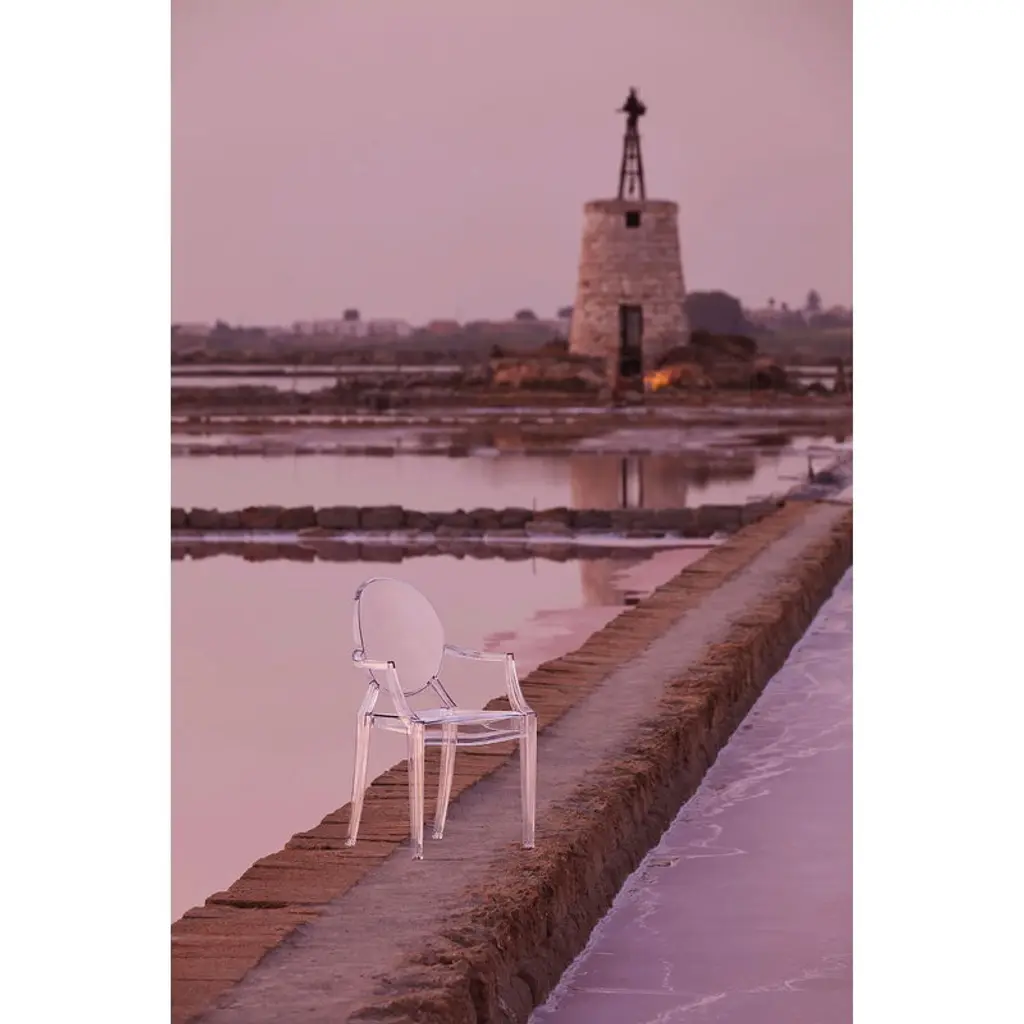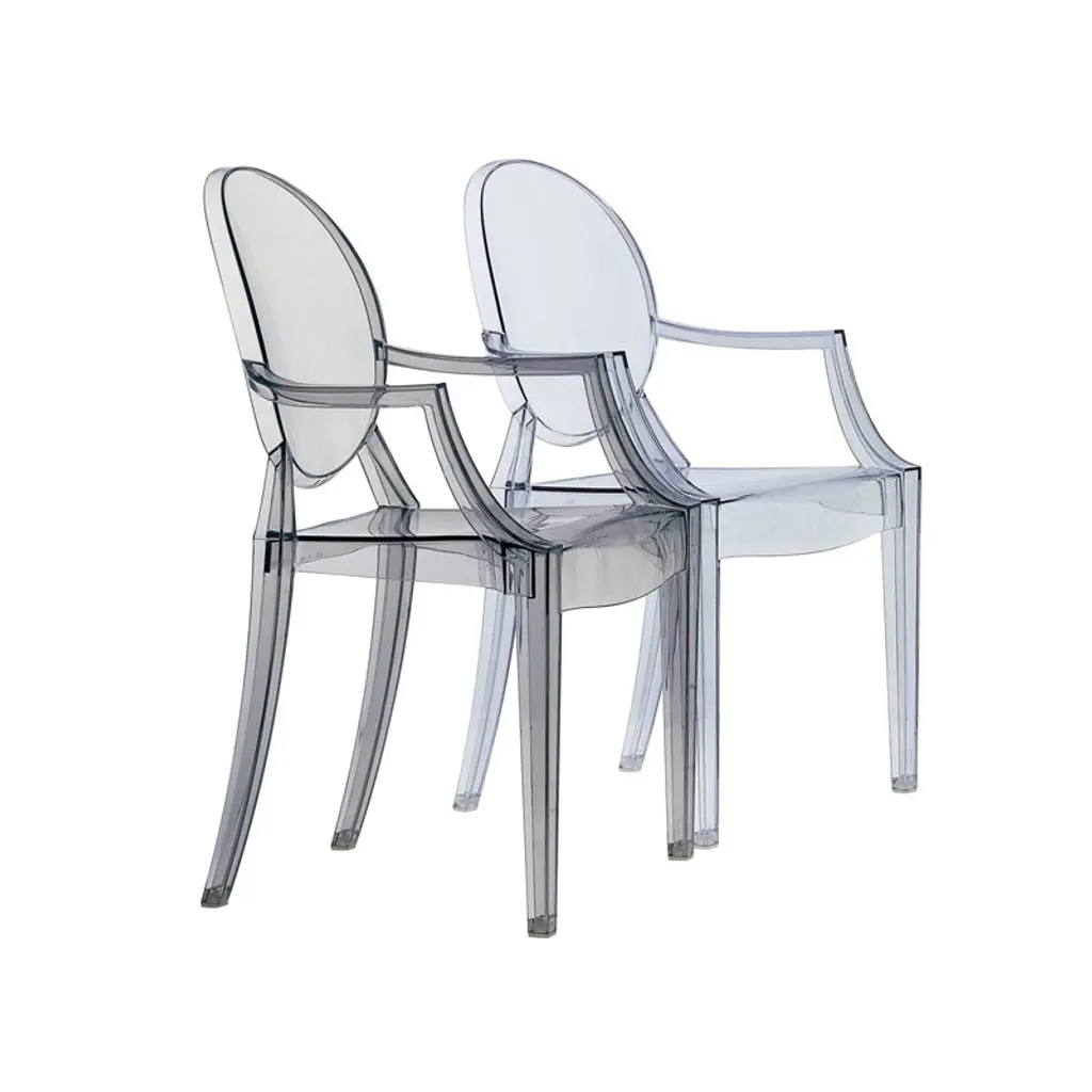 Kartell's Louis Ghost chair, designed by Philippe Starck in 2002, is an iconic interpretation of the neoclassical style armchair. Louis Ghost chair has an airy and lightweight appearance yet stable and durable structure that is extremely comfortable to sit on. The classic silhouette and modern material make Louis Ghost perfect for all types of interiors and uses. The chair is stackable and also suitable for outdoor use.