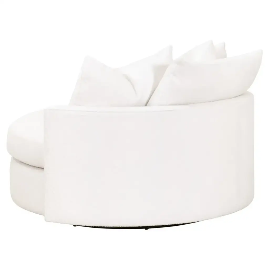 This posh swivel sofa seat is the perfect place to nestle into. With its wide and deep frame, curling up and settling in will be a delight. The uniquely curved design resembles a modern style that will elegantly round out any room. It is crafted with a sinuous spring construction and upholstered with a snow boucle performance fabric. The performance fabric is stain-resistant, making it easier to clean and stay tidy. It contains a 360-degree swivel base for moving about and viewing all corners of the room at your convenience. It also includes three throw pillows filled with 100% down to cozy up to.