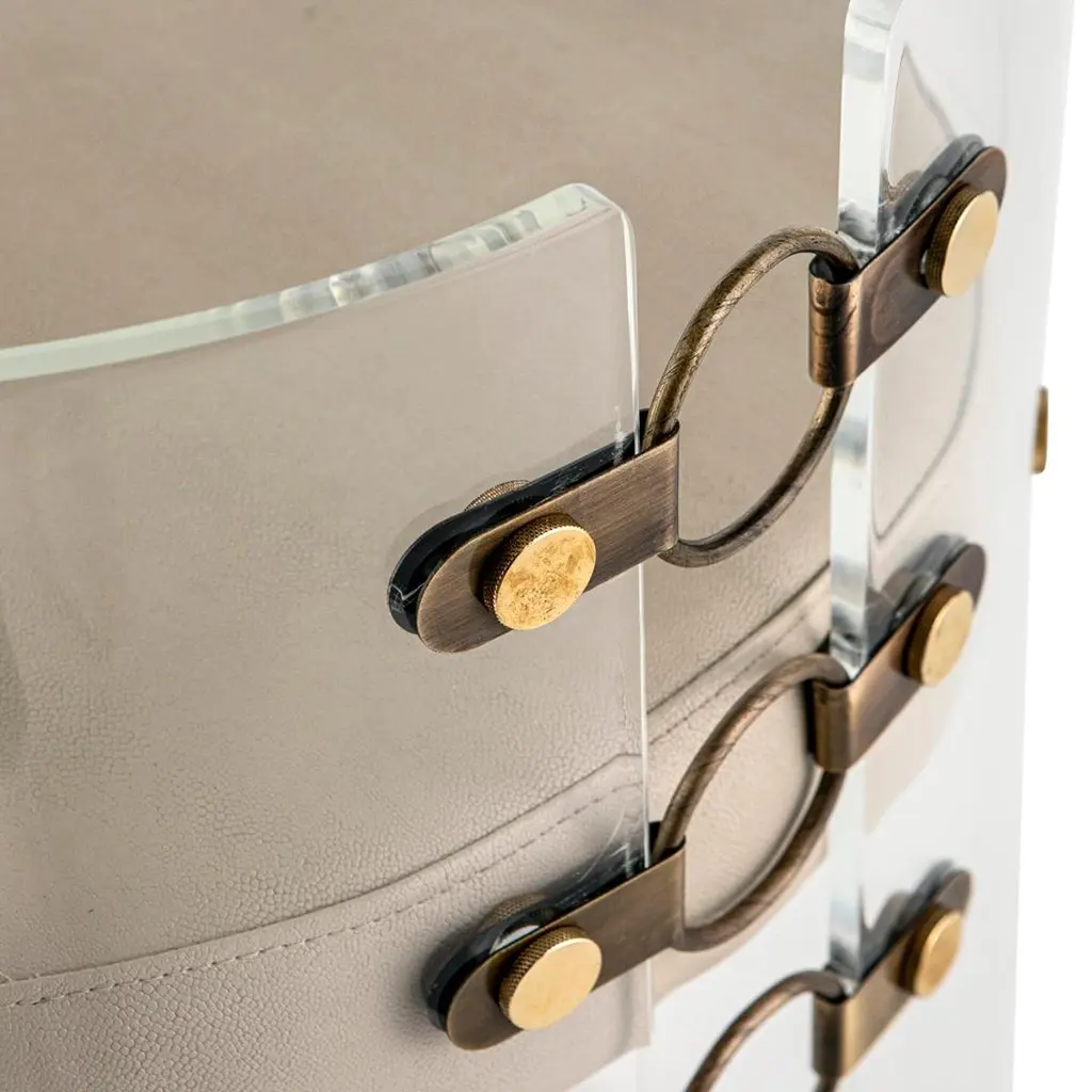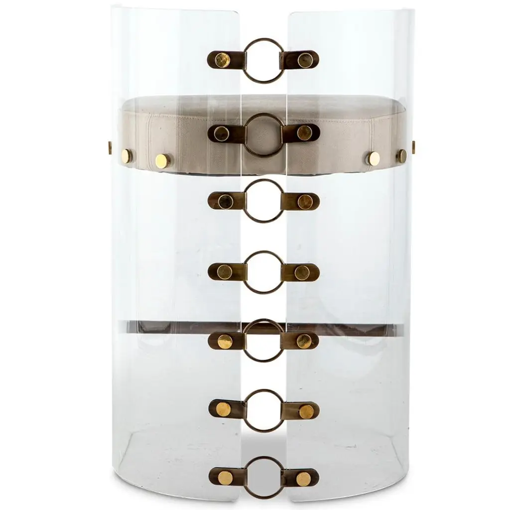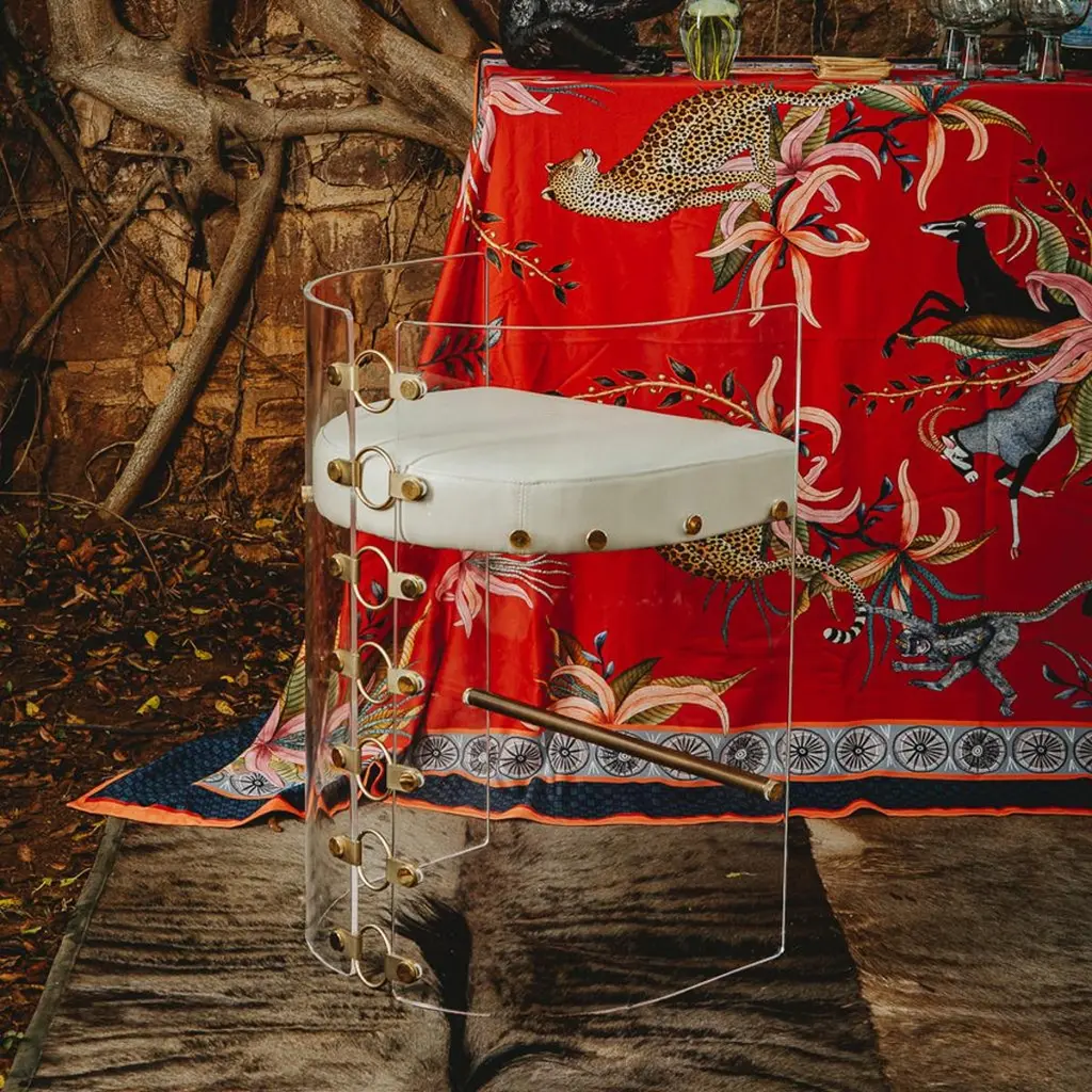 The Jetson bar chair is part of the Tala collection designed by Egg designs and manufactured in South Africa.This Futuristic style bar chair has a clear Lucite Acrylic shell structure in two sections. These two sections are connected with a bronzed steel bracket with rings that create a decorative back spine. When viewed from behind this bar chair boasts both beautiful and interesting details to the viewer.Solid brass pin details add further detail and chair is finished with a leather seat.