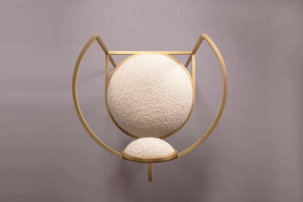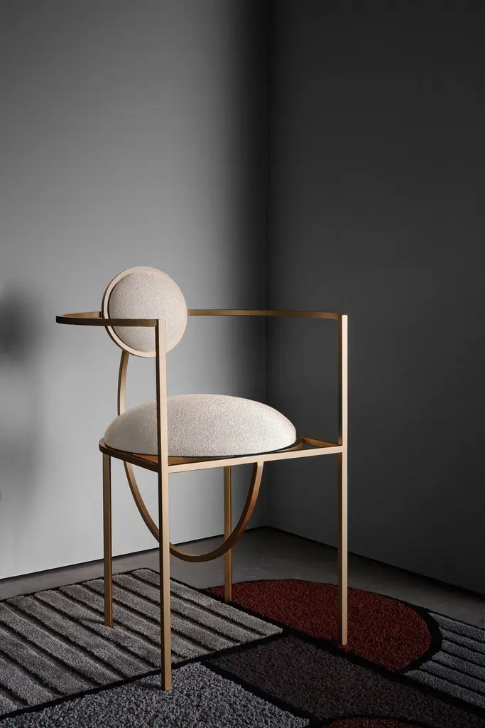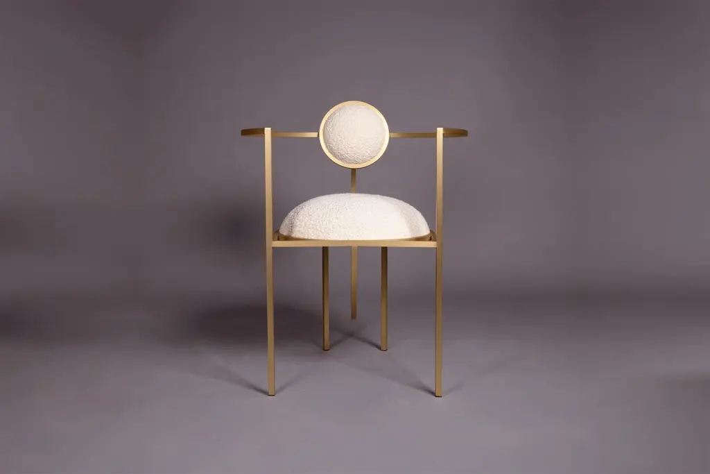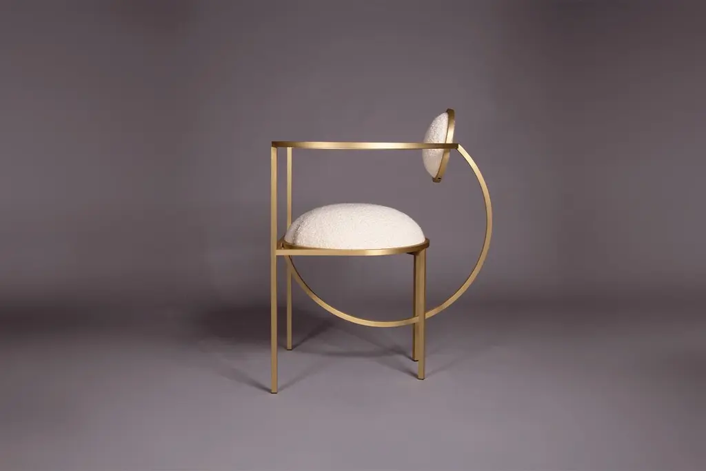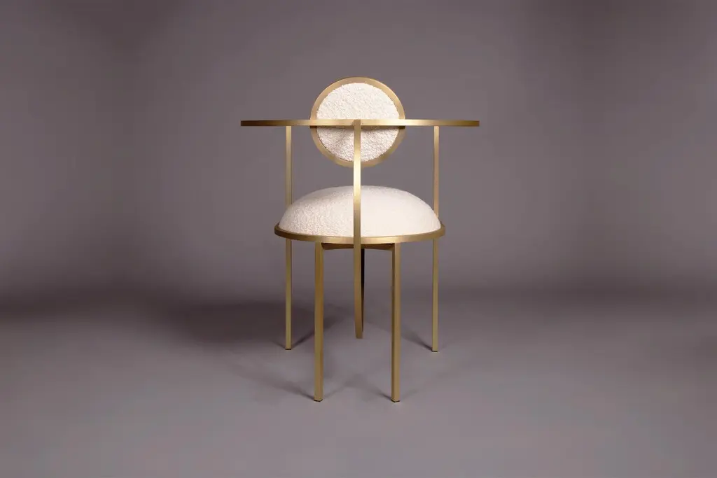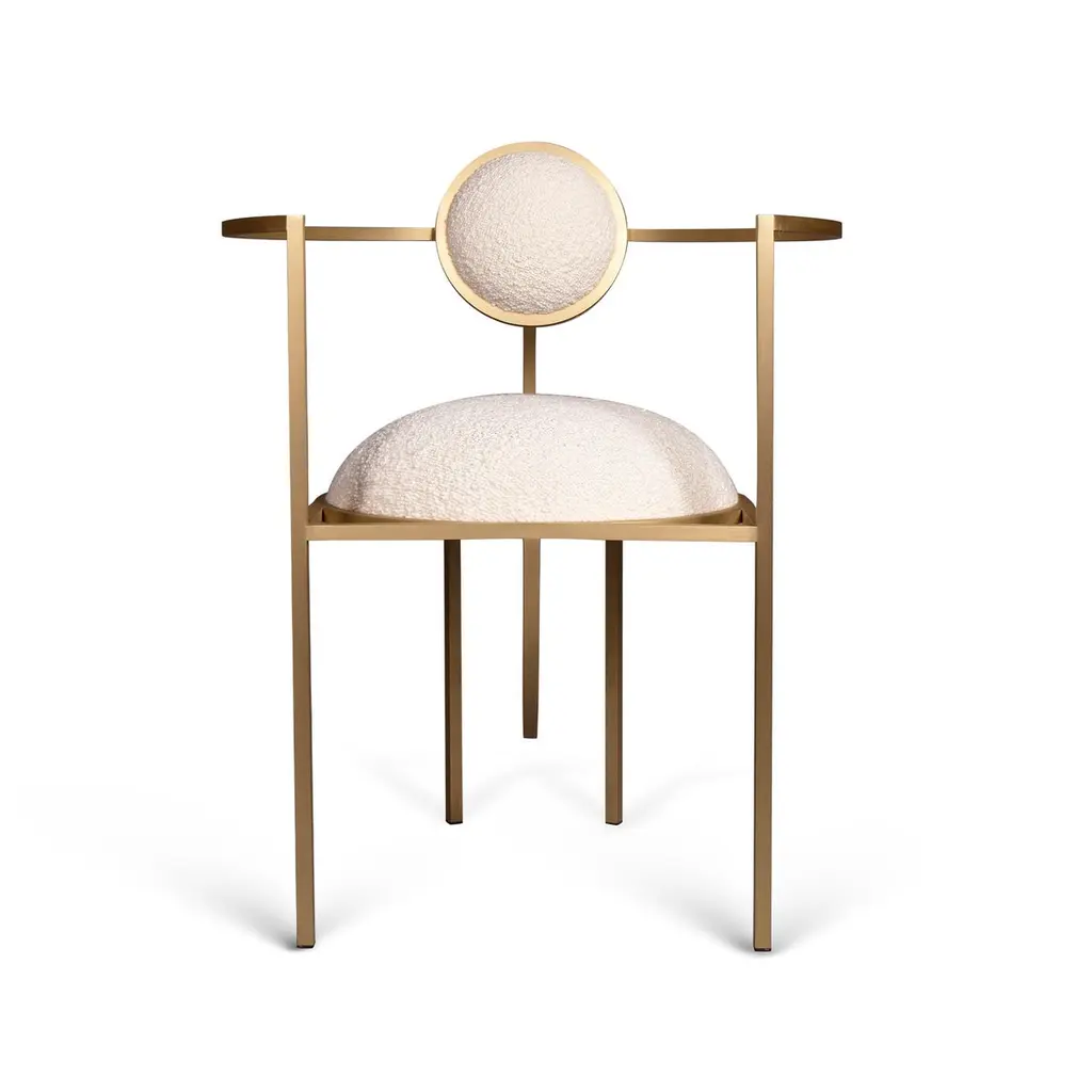 With Lunar chair, Lara Bohinc develops her stellar themes, finding inspiration in planetary and lunar orbits, whose gravitationally curved trajectories drive the lines and shapes of the chairs. Constructed from thin square rod, the chairs are elegant, minimal and delicate.The Lunar chair is distinguished by two enveloping crescents for armrests, and a smaller backrest which, like a moon, circles its planet on an orbit of its own.The chair is made from brushed brass and upholstered in Dedar boucle wool and viscose fabric. Please note that even though brass is protected by clear varnish, it may still oxidise over the years which is a natural ageing process. The chair is made entirely by hand so slight imperfections are part of its charm.Each piece of furniture is individually numbered and comes with a signed "Certificate of Authenticity" to prove that it is Bohinc Studio original.Material: brushed brass and cream boucle Dedar wool and viscose fabricDimensions: width 63cm, height 84cm, depth 66cmWeight: 15kg.