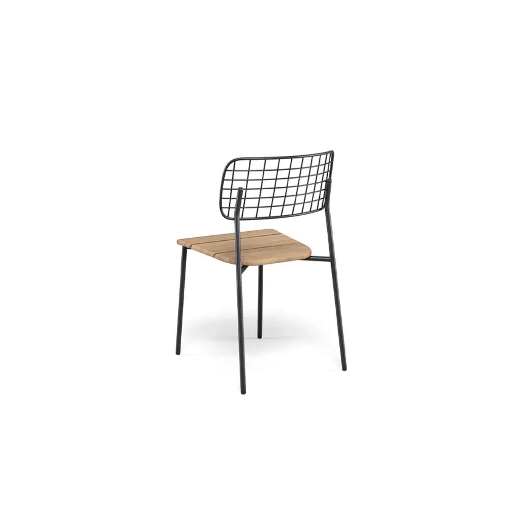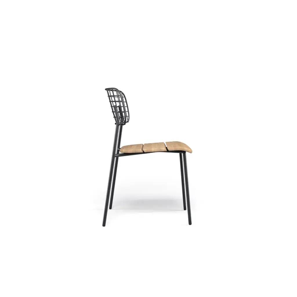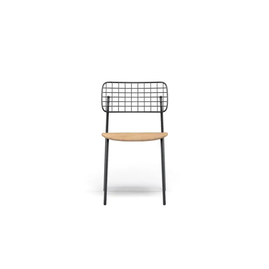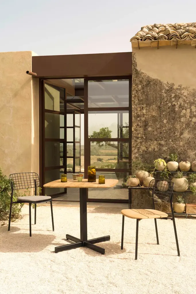 Lyze is an aluminium and steel chair. Available version with teak seat.A light touch and a novel combination of shapes provide the inspiration for Lyze by Florent Coirier, a collection that teams aluminium with steel. The framework of the chairs, in extruded aluminium, is combined with a seat in die-cast aluminium and a backrest formed by a pattern of stainless steel circles. The frame and the backrest are fixed mechanically, using screws, to allow for the creation of numerous colour combinations between the seat and the backrest. The coffee table, with aluminium structure and fibre-cement top, completes the collection. Colours: Black frame-black backrest; black frame-stainless steel backrest; white frame-white backrest; white frame-taupe backrest; red frame-red backrest; grey-green frame-stainless steel backrest; green frame-white backrest.