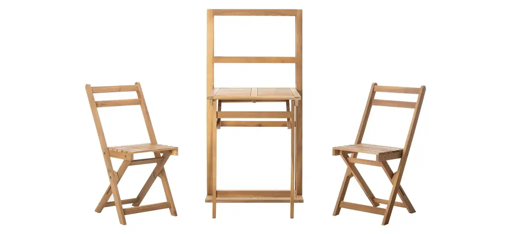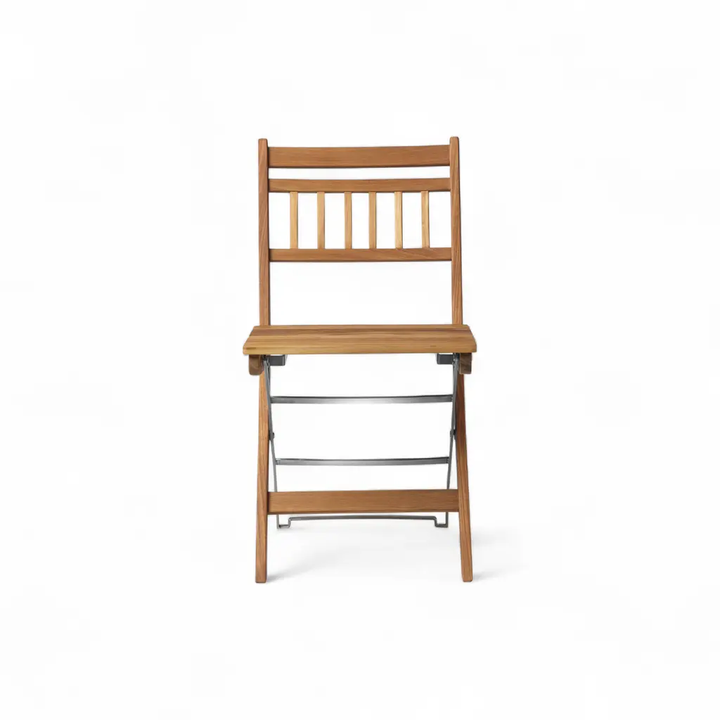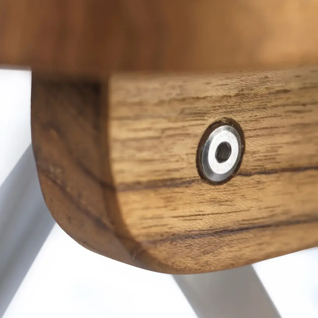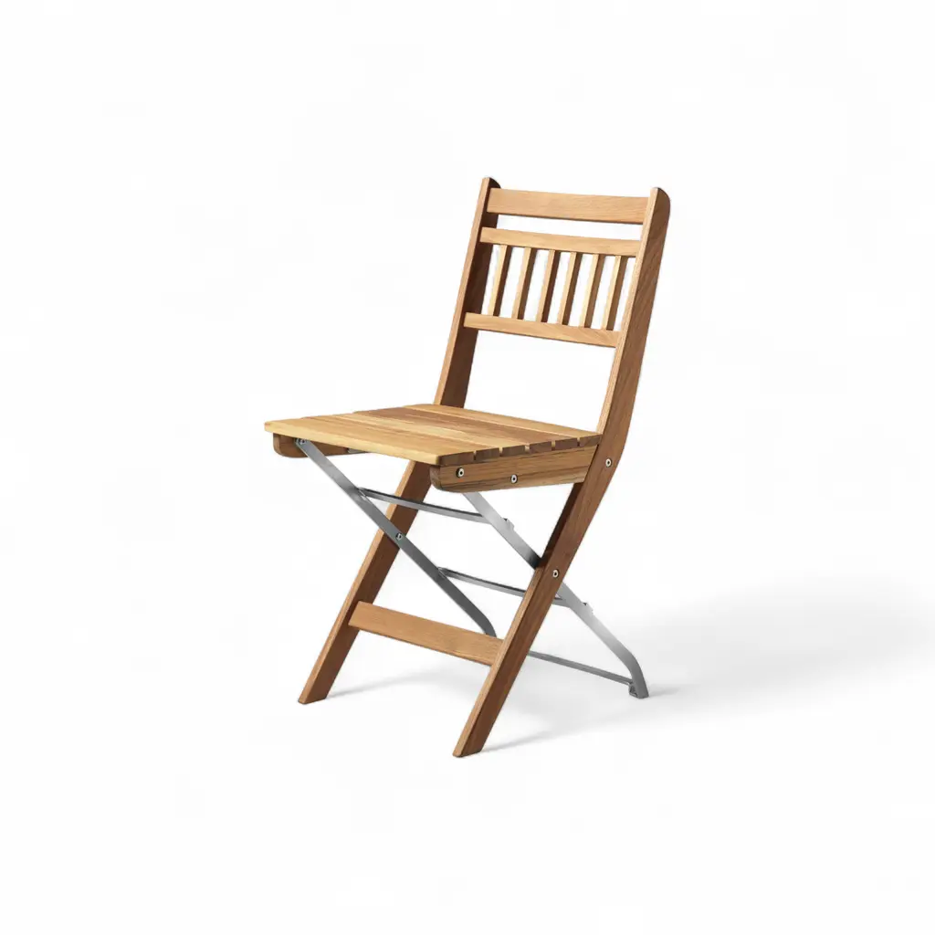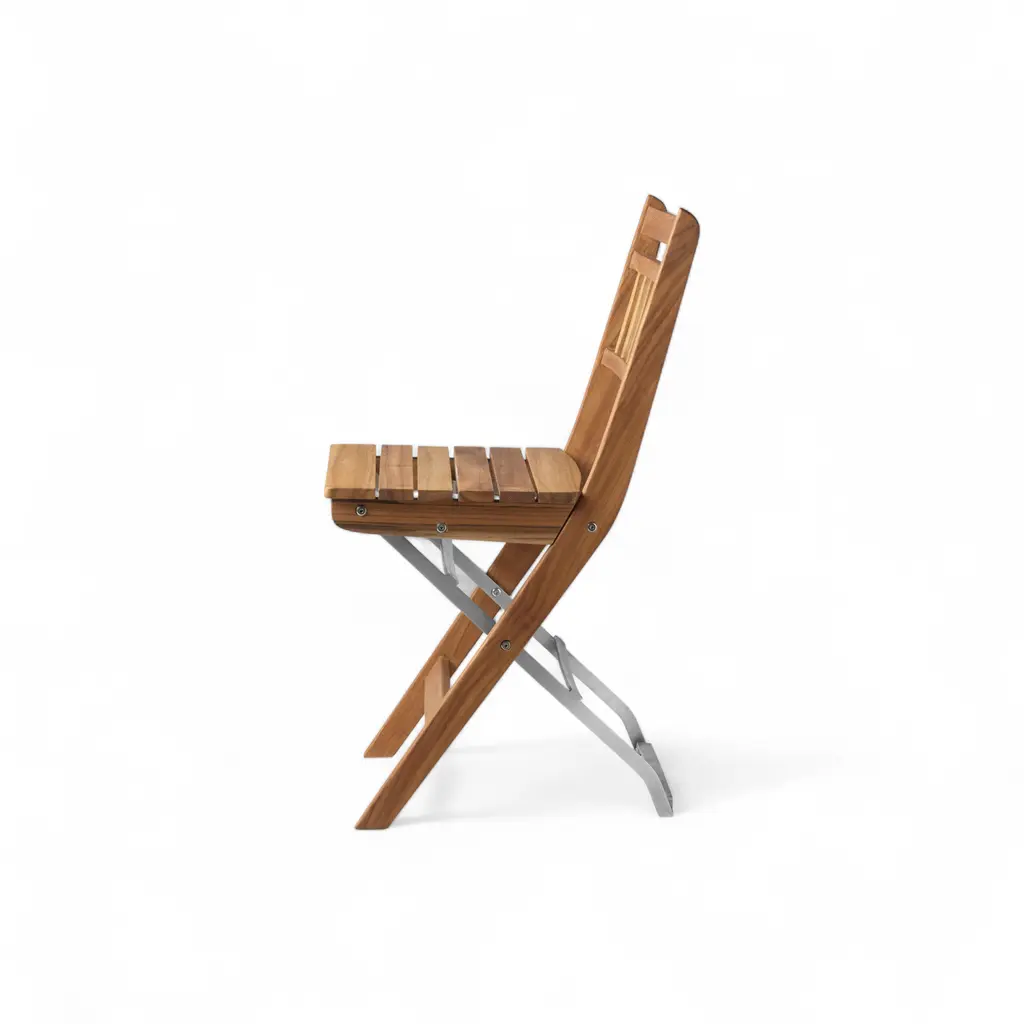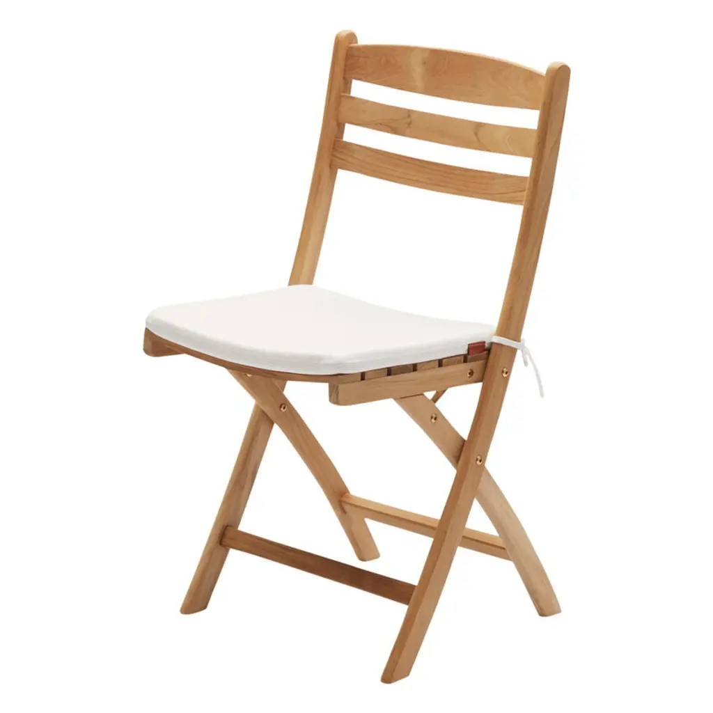 The M23 Lilleø chair is built for small spaces, but doesn’t feel like a compromise. It folds up easily, tucks away without fuss, and when it’s open, it’s sturdy, balanced, and surprisingly comfortable. The seat and back are solid teak, the frame is slim steel, and the whole thing has a quiet presence—nothing showy, just well-proportioned and thoughtfully made. It works just as well on a narrow balcony as it does at a garden table or outside a café.