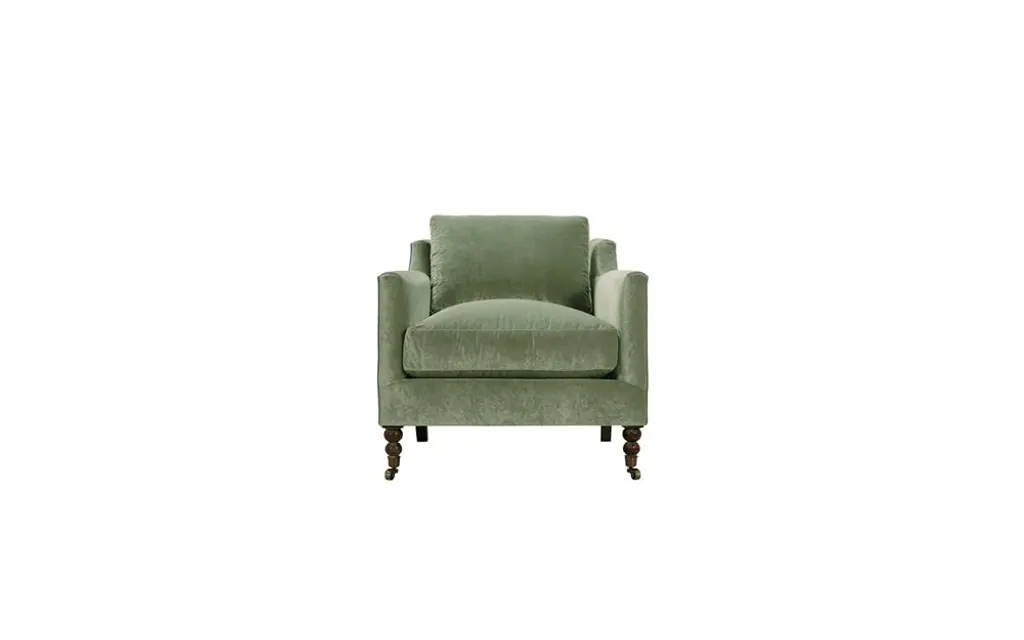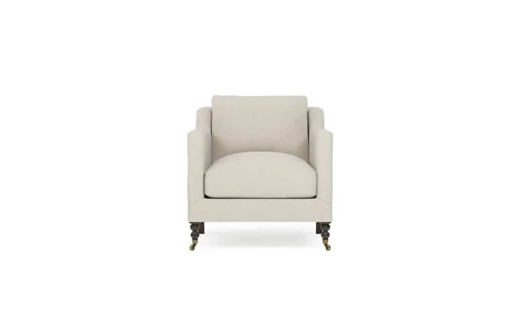 Classically inspired with modern appeal, the Madeline chair brings a stylish touch to any modern or traditional home. Turned wood legs with brass casters in the front pair beautifully with curved legs in the back, dressing up the silhouette. Soft yet supportive, the seat cushion is designed for supreme comfort, with a foam core surrounded by a blend of fiber, down, and feather fill. Choose from a variety of upholstery options, including linen, velvet, and performance fabrics.