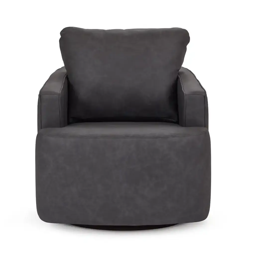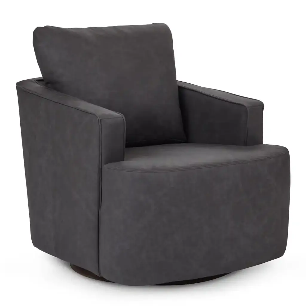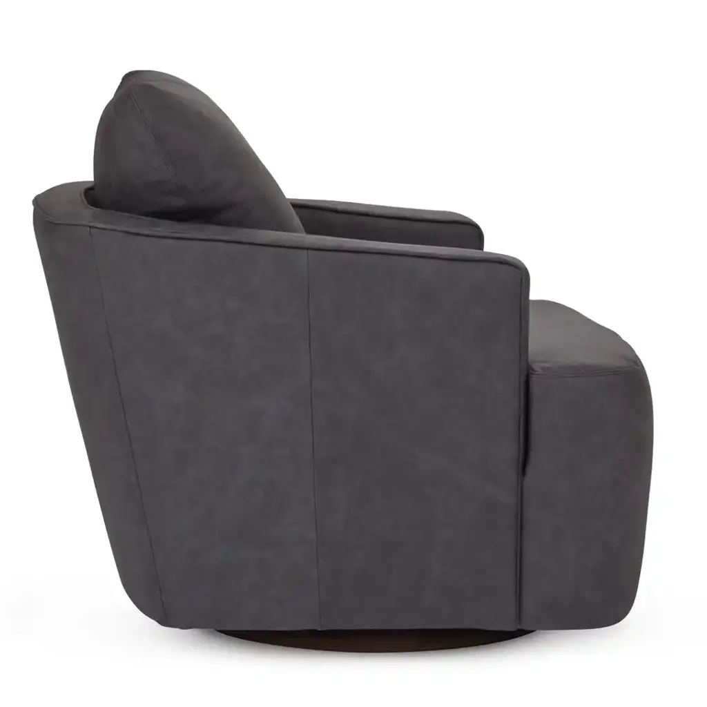 The sleek, modern barrel design of the Maeve Swivel Gliding Chair is offset by a plush back cushion and deep, cozy seat. Slim track arms with welt trim encircle you as you gently glide. A 360-degree swivel base lets you engage with the entire room.
