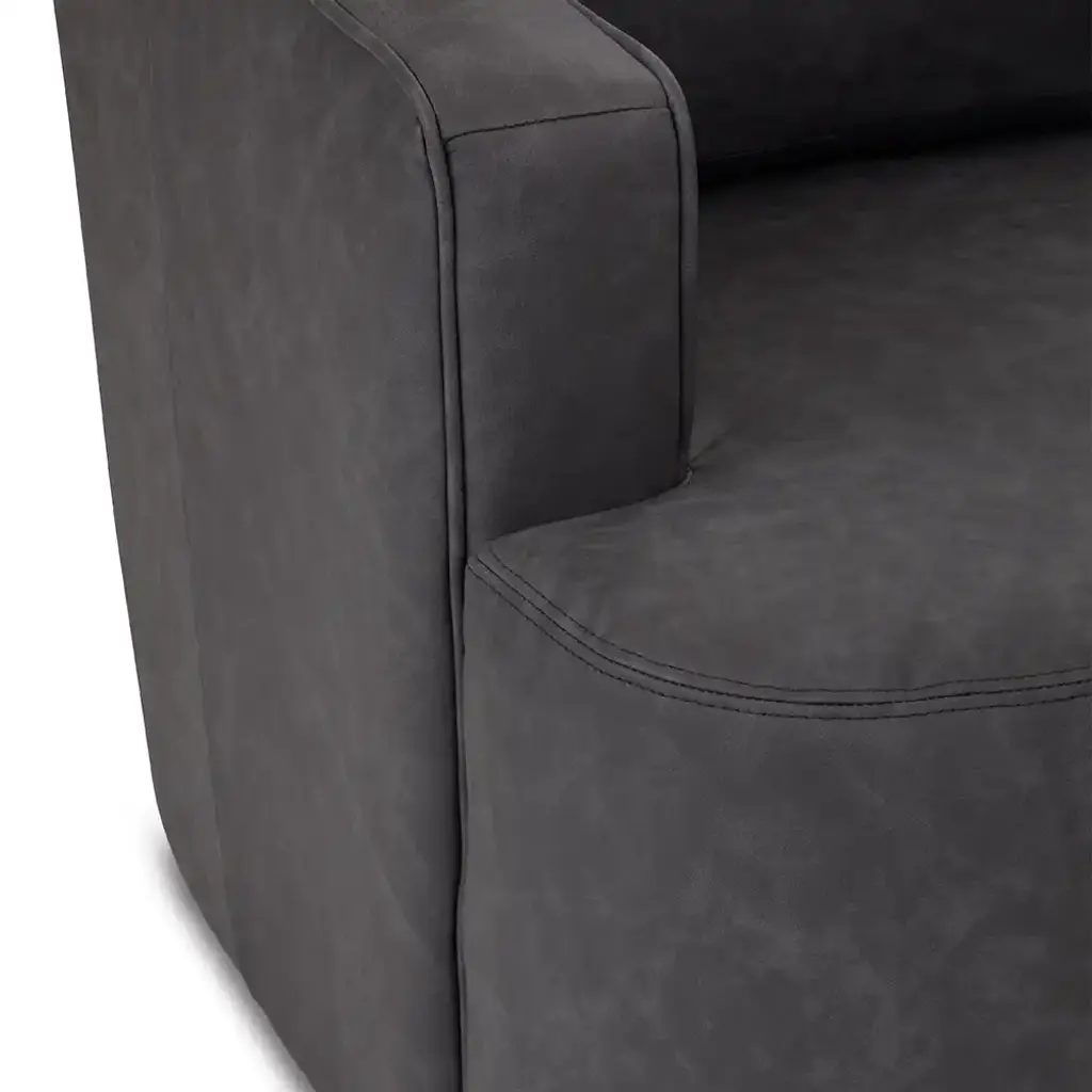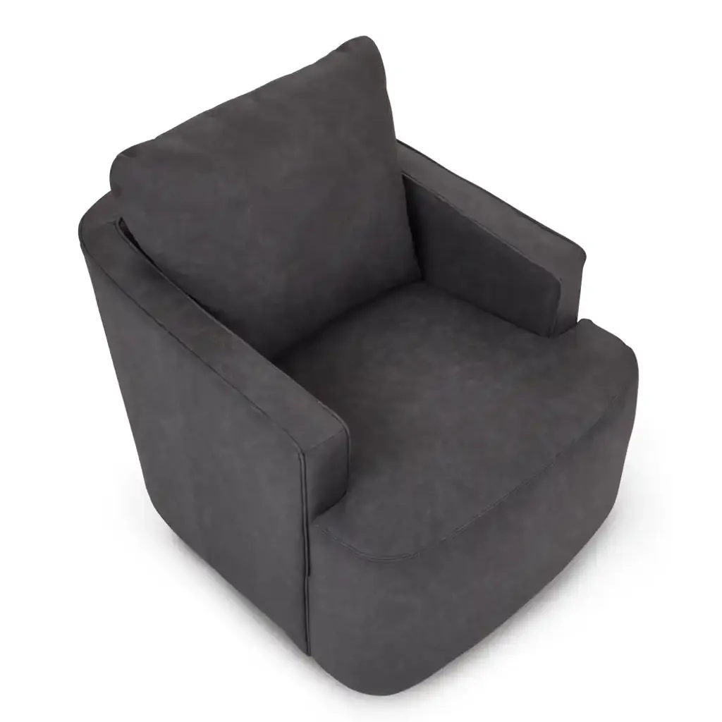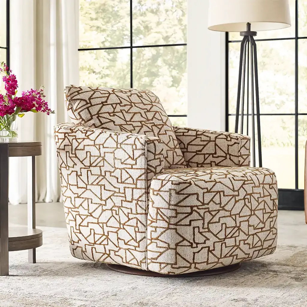 The sleek, modern barrel design of the Maeve Swivel Gliding Chair is offset by a plush back cushion and deep, cozy seat. Slim track arms with welt trim encircle you as you gently glide. A 360-degree swivel base lets you engage with the entire room.