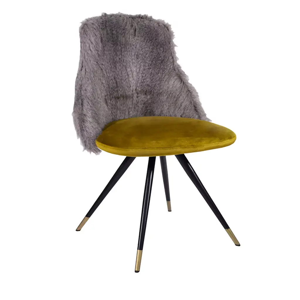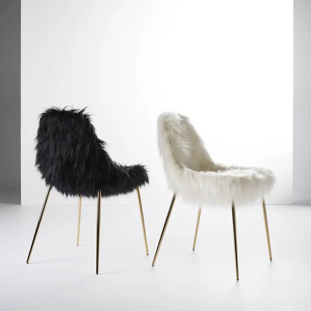 This striking chair has a structural skin in aluminum supported by a 24k gold structure. The seat and back are upholstered in eco-friendly black fur. This chair is not stackable and its lining cannot be removed.