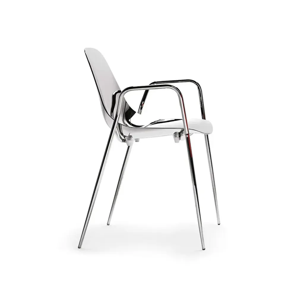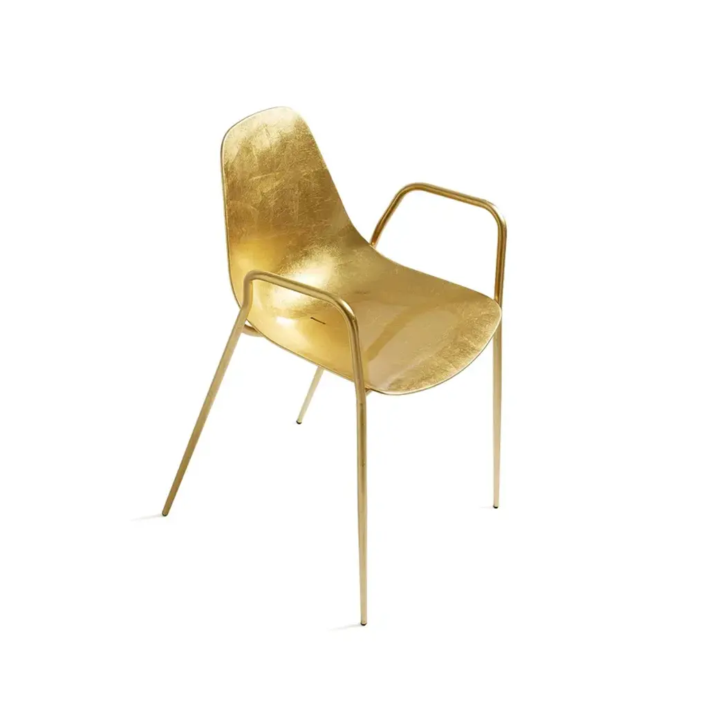 Sedia impilabile con scocca in pressofusione d’alluminio e struttura in acciaio. Per uso indoor/outdoor. Disponibile con o senza braccioli.Finiture metallizzate: argento, oro.Finiture opache: verniciature materiche effetto cemento o bronzo.Finiture lucide: alluminio specchio, foglia oro, foglia argento, foglia rame.Accessori: piedini a cappuccio, cuscino in feltroOne, one hundred, one thousand Mammamia! You could very well say that when you realize the surprising versatility of this chair collection by Marcello Ziliani that embraces countless combinations and variants: stackable or non-stackable, with or without armrests, hard or upholstered.With its distinctive young and informal design, and its soft and sinuous lines, Mammamia has an ergonomic and welcoming seat and a light structure, features that provide the chair with a balanced, pleasant and enticing look.Glossy or matt, textured or rich, minimalist or decorated. It can be covered with light leaves – gold, silver, copper – hand-polished in the mirror version, cladded with finish that recalls materials like concrete and bronze, or give shimmering glows thanks to the new metallic gold and silver coatings.The seat also comes in soft upholstered versions with fabrics or leather, for an elegance that is second to none.A never-ending range of choices for this chair with a die-cast aluminium shell and steel structure, that has no intention of stopping surprising!Thanks to its almost infinite versions, it suits any indoor or covered outdoor environment. From the most contemporary and minimalist to the most traditional and refined Mammamia is always the perfect choice.Complied with UNI-EN 16139:2013 European Standards which determine the strenght, durability and safety requirements of chairs for contract use, it is suitable both for public and private spaces.