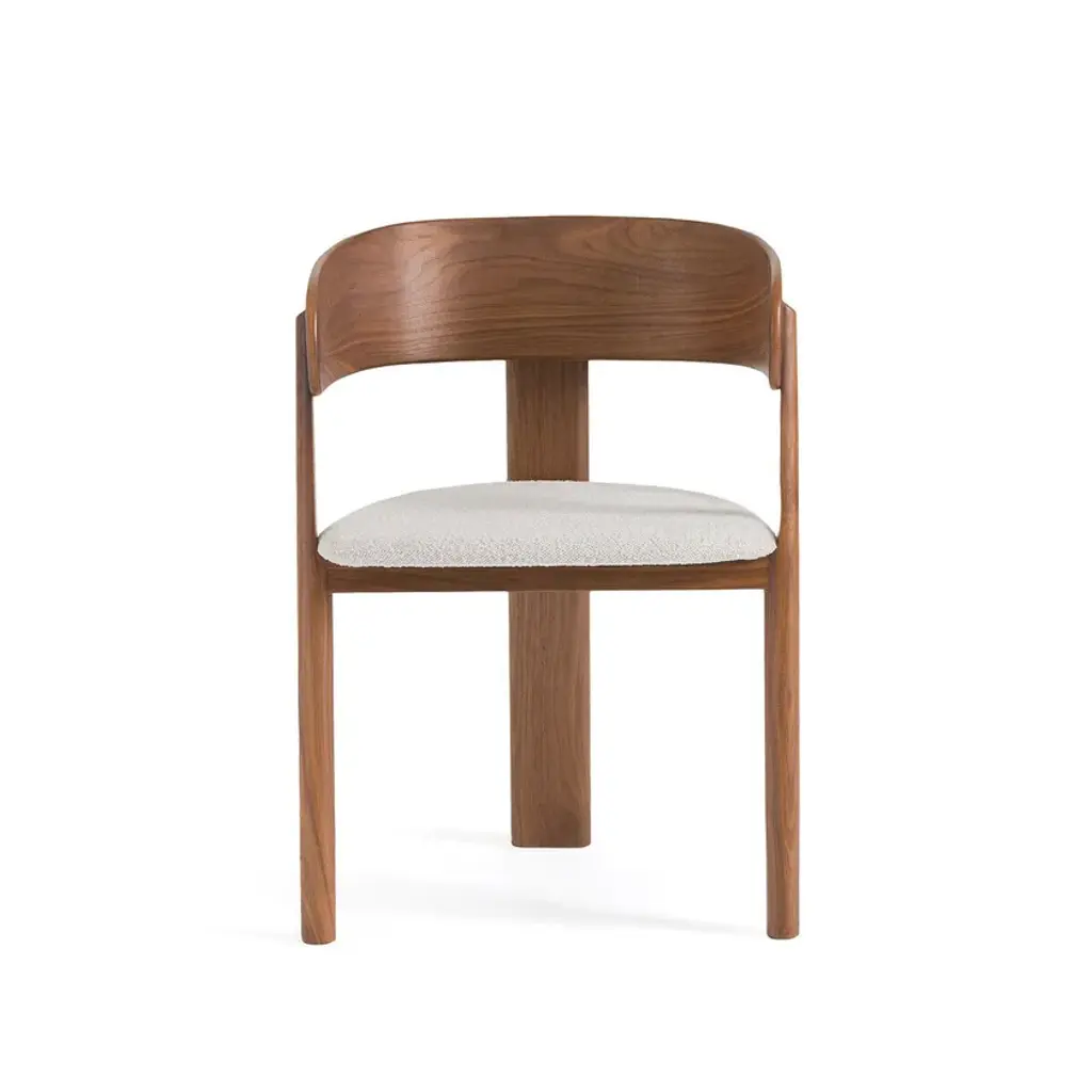 Created by Emmanuel Gallina exclusively for AMPM, Marais is an armchair with elementary shapes combined with bold details. The combination of walnut and fabric gives the chair a cosy look. The originality of its base, emphasised by its 3 legs, finds its balance in its curves and rounded cylindrical sections. The desire to work with primary lines, to offer a rounded seat.Solid walnut baseBack in walnut veneer plywoodNitrocellulose finishSeat in plywood with 30 kg/m3 polyurethane foam paddingUpholstery 100% polyester bouclé fabric