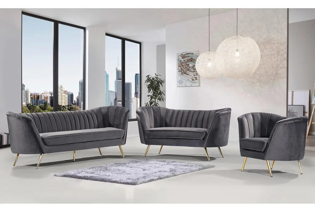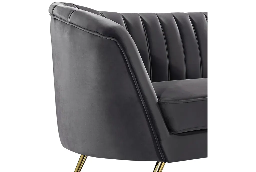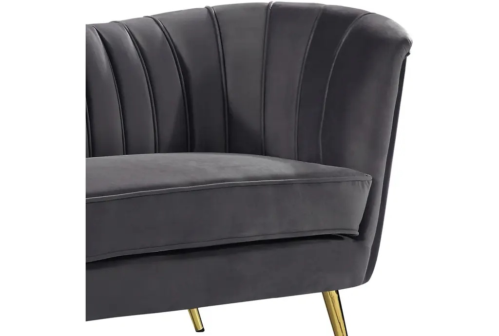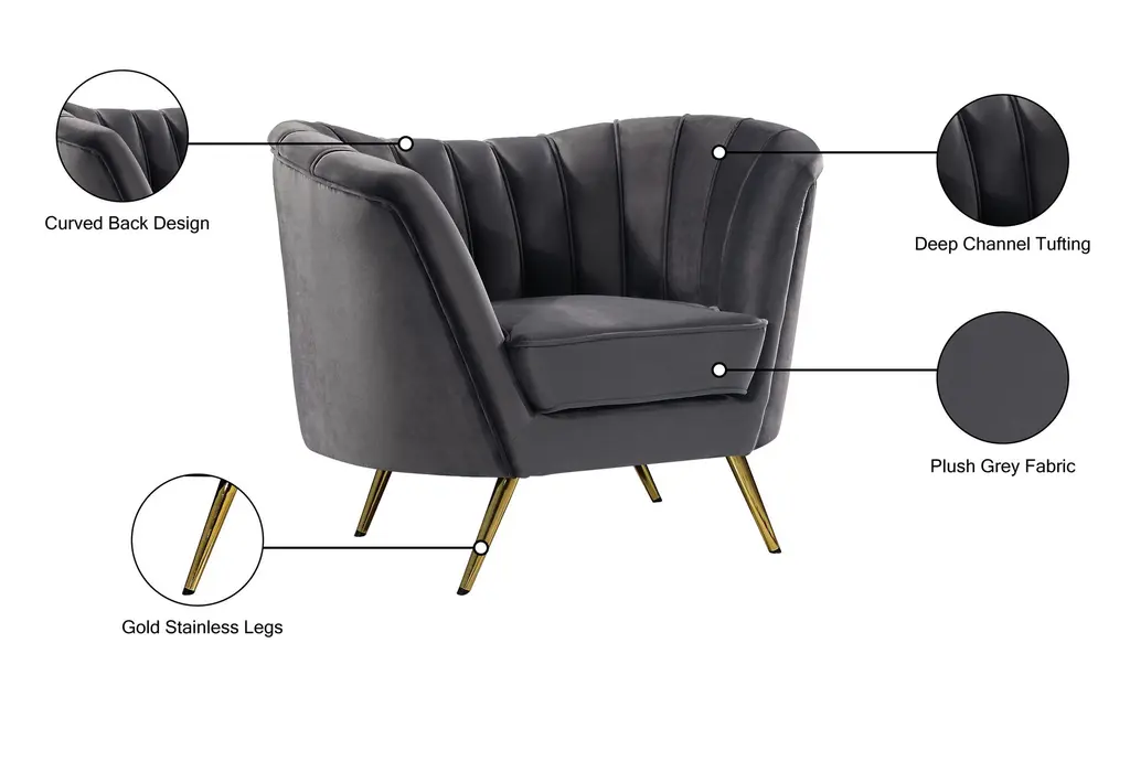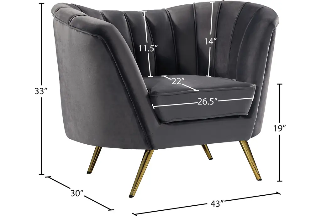 Introducing the Margo Grey Velvet Upholstered Chair, a perfect addition to your living room for a touch of comfort and sophistication. This oversized chair features a stunning velvet fabric that is both soft and durable, ensuring long-lasting use. The recessed armrests and channel-tufted back add to its luxurious appeal, making it a standout piece in any space.