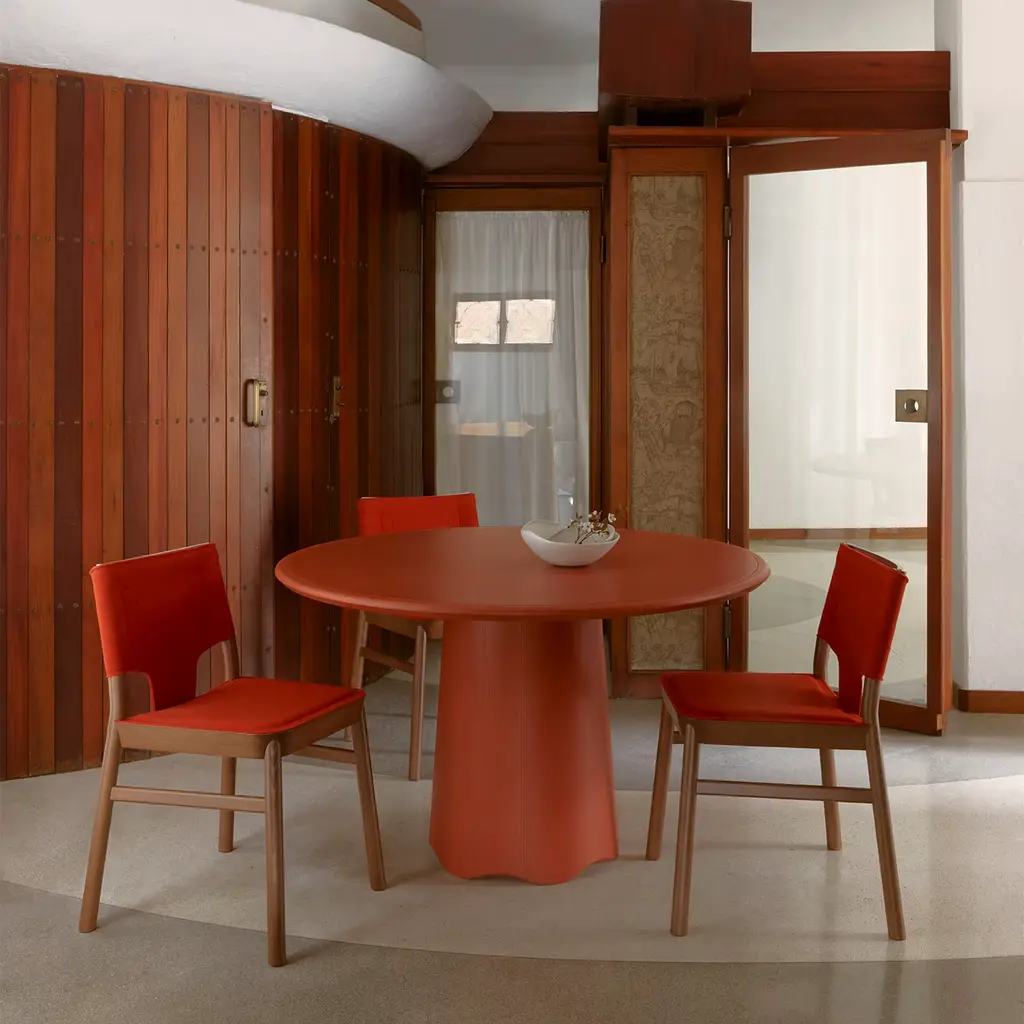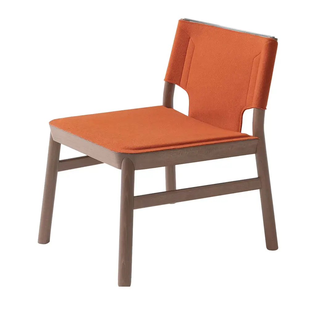 Crafted from exquisite walnut beech wood, this chair embodies a harmonious blend of elegance and modernity. Designed by Emilio Nanni, it features a striking orange felt seat that contrasts beautifully with the rich walnut legs. The chrome-satin finish metal handle adds a touch of sophistication, enhancing its refined aesthetic. This piece is a testament to exquisite craftsmanship and thoughtful design, promising to elevate any space with its graceful allure.
