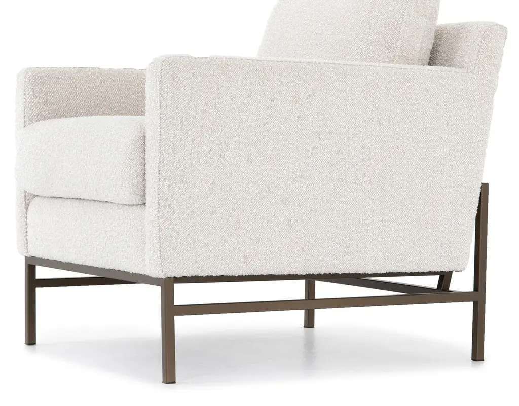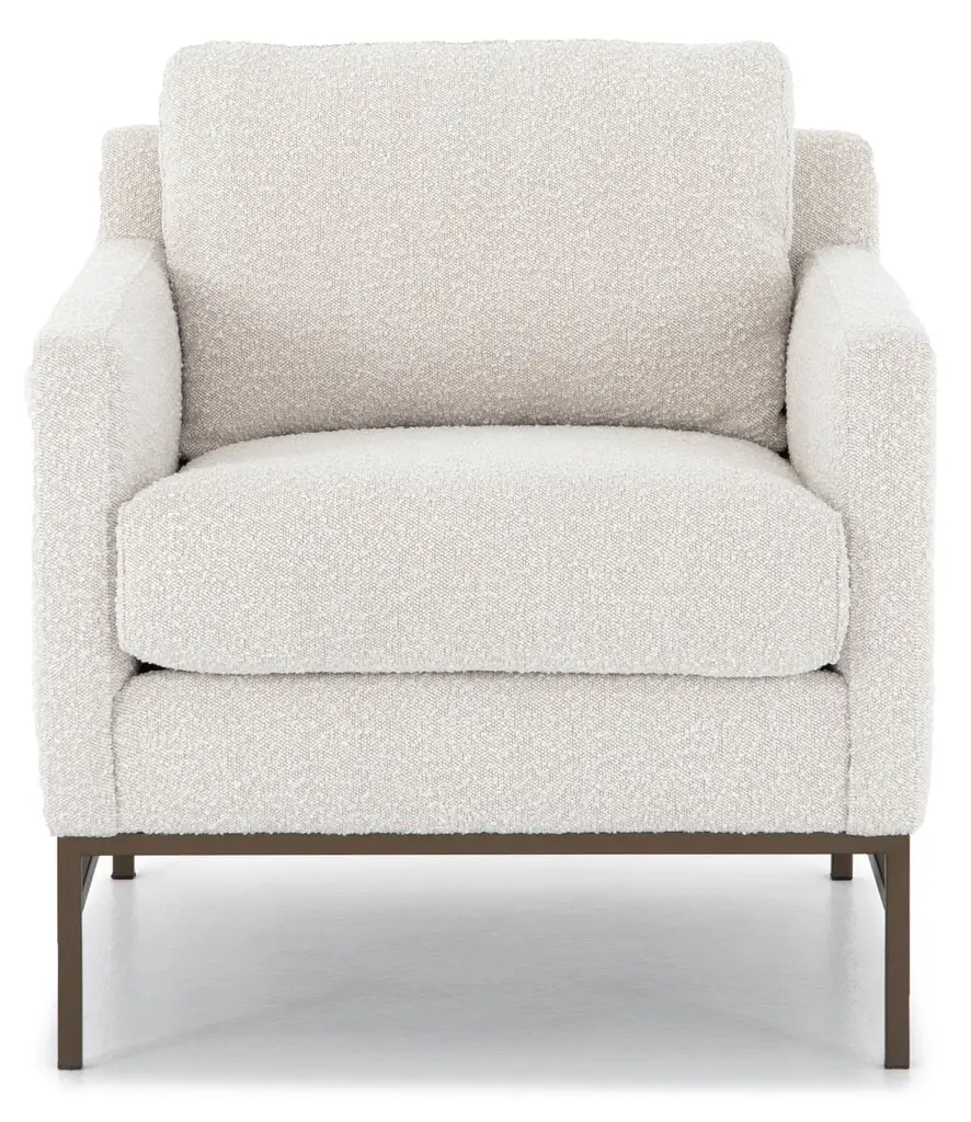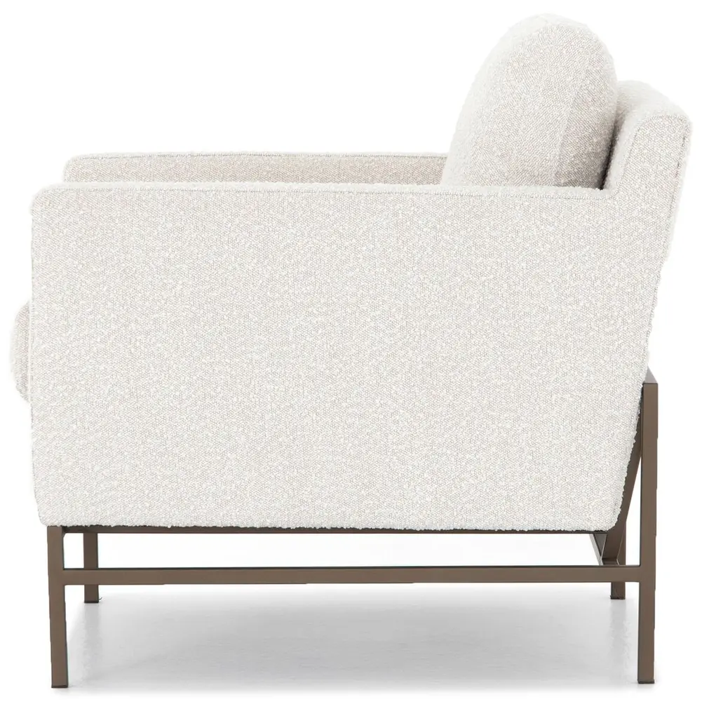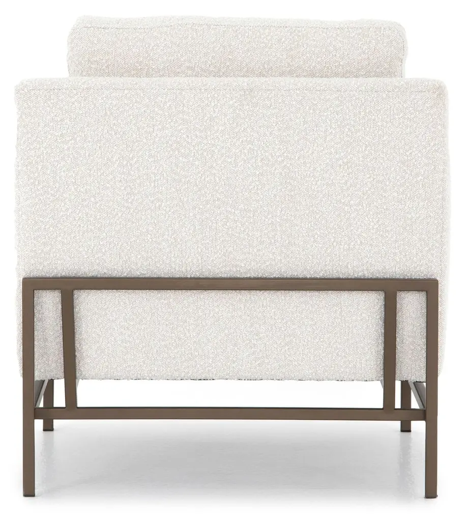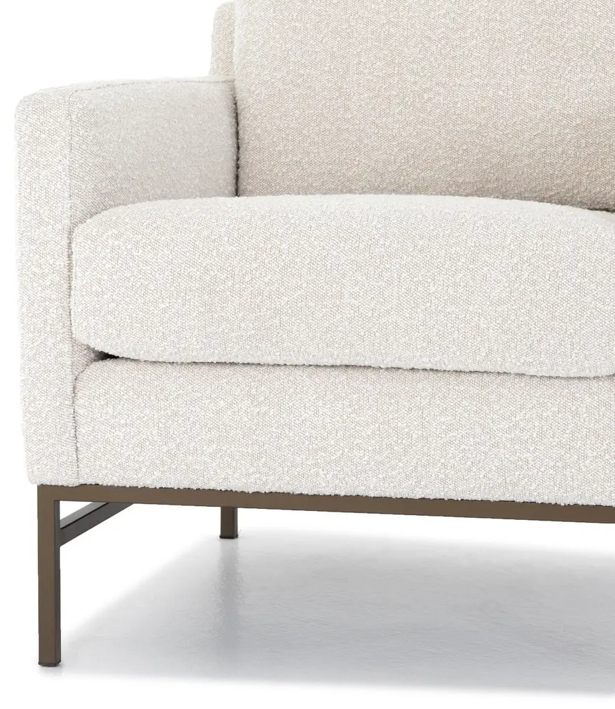 Plush and modern-minded. Atop an airy, bronze-finished iron base, thick, boucle-like upholstery features clean, angular track arms and comfy cushioning, for the best of both worlds.