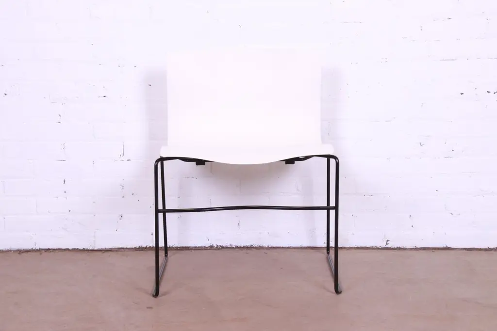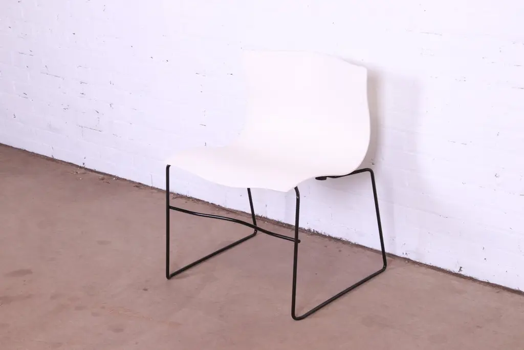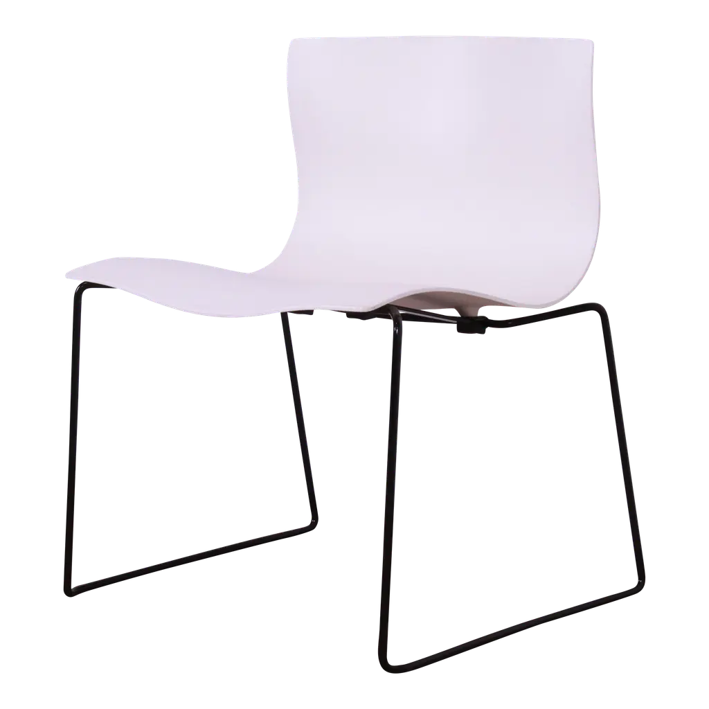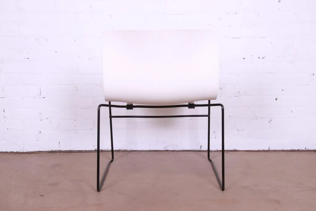 A stylish postmodern stacking "handkerchief" chairBy Massimo Vignelli for Knoll InternationalUSA, 1980sMolded fiberglass seat, with powder coated steel base.Measures: 23.5"W x 21"D x 28.75"H. Seat height 17.5".Newly professionally powder coated bases and power washed seats. Very good condition.Priced individually. 7 chairs available.