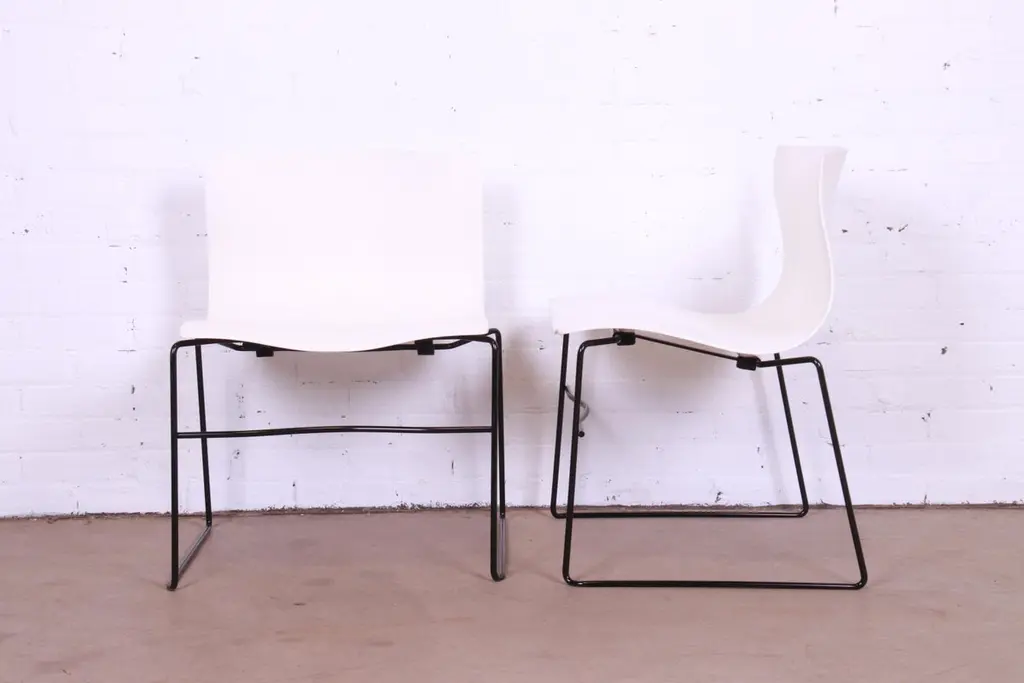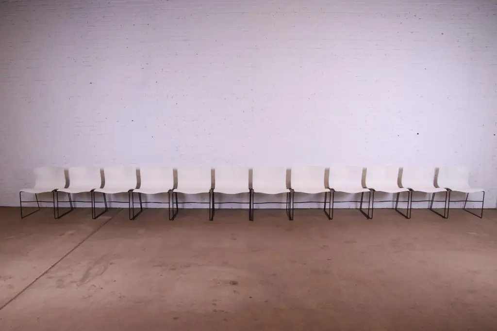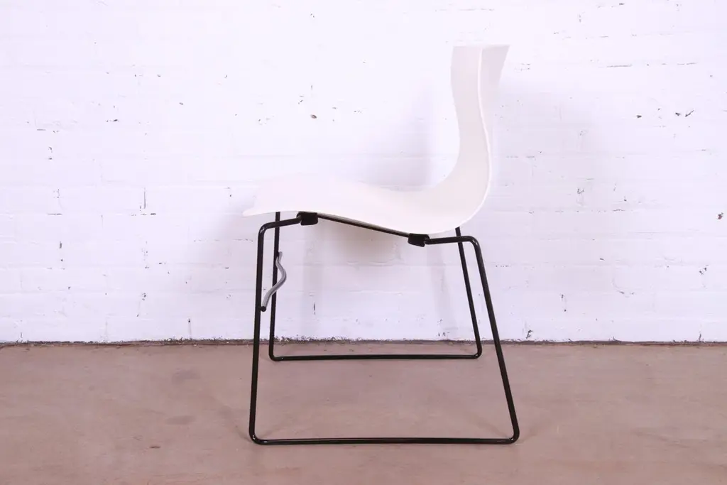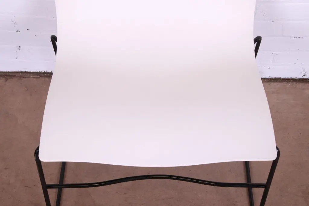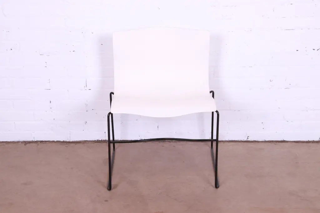 A stylish postmodern stacking "handkerchief" chairBy Massimo Vignelli for Knoll InternationalUSA, 1980sMolded fiberglass seat, with powder coated steel base.Measures: 23.5"W x 21"D x 28.75"H. Seat height 17.5".Newly professionally powder coated bases and power washed seats. Very good condition.Priced individually. 7 chairs available.