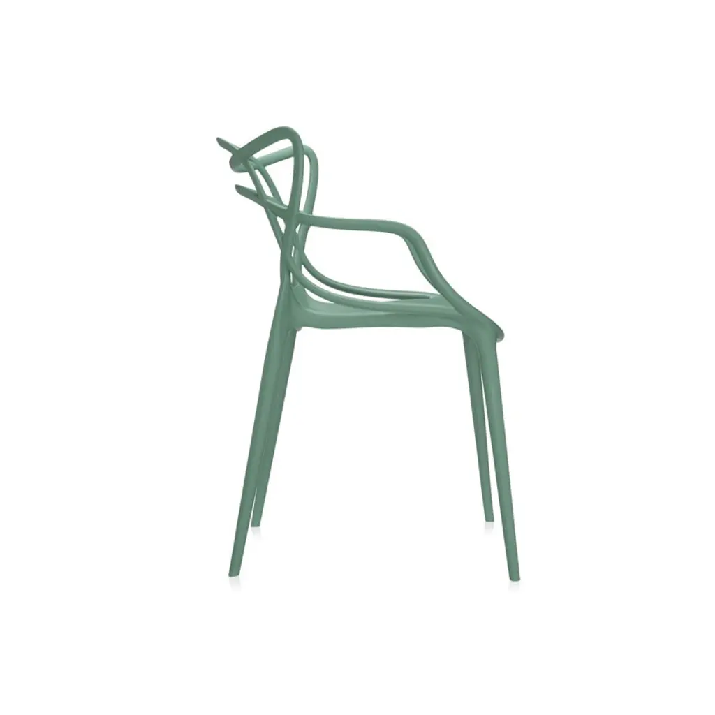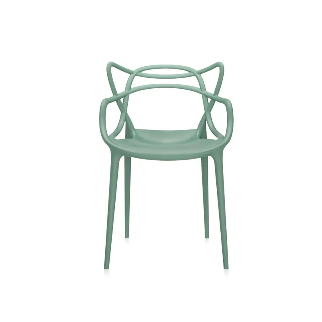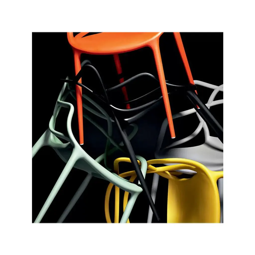 The Masters chair by Philippe Starck and Eugeni Quitllet is a tribute to three iconic chairs: the Series 7 by Arne Jacobsen, the Tulip armchair by Eero Saarinen and the DSR chair (or Eiffel chair) by Charles and Ray Eames. The silhouette of each classic can be found from the back rest of the Masters chair. The slim legs give the chair a slender figure. The Masters chair is light, stackable and suitable for outdoor use.