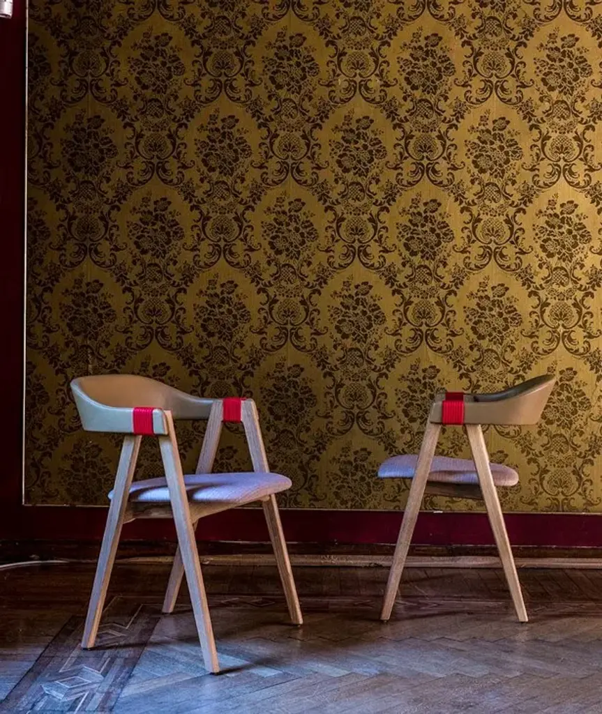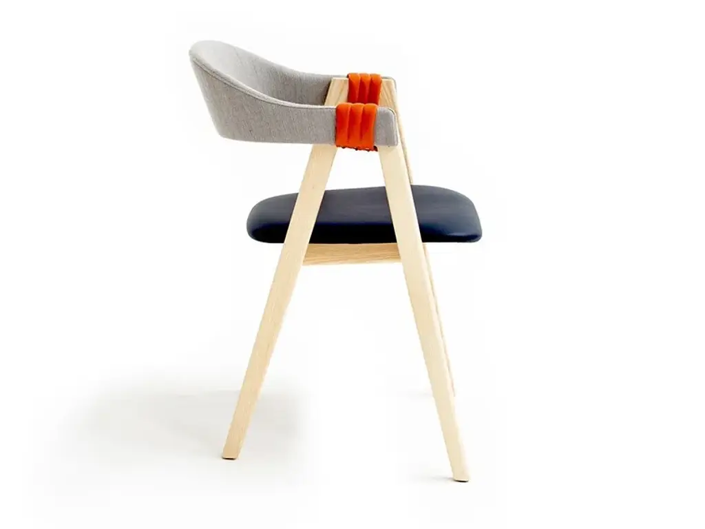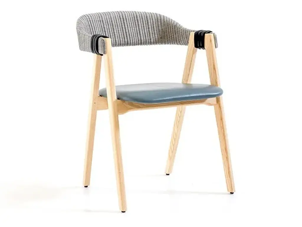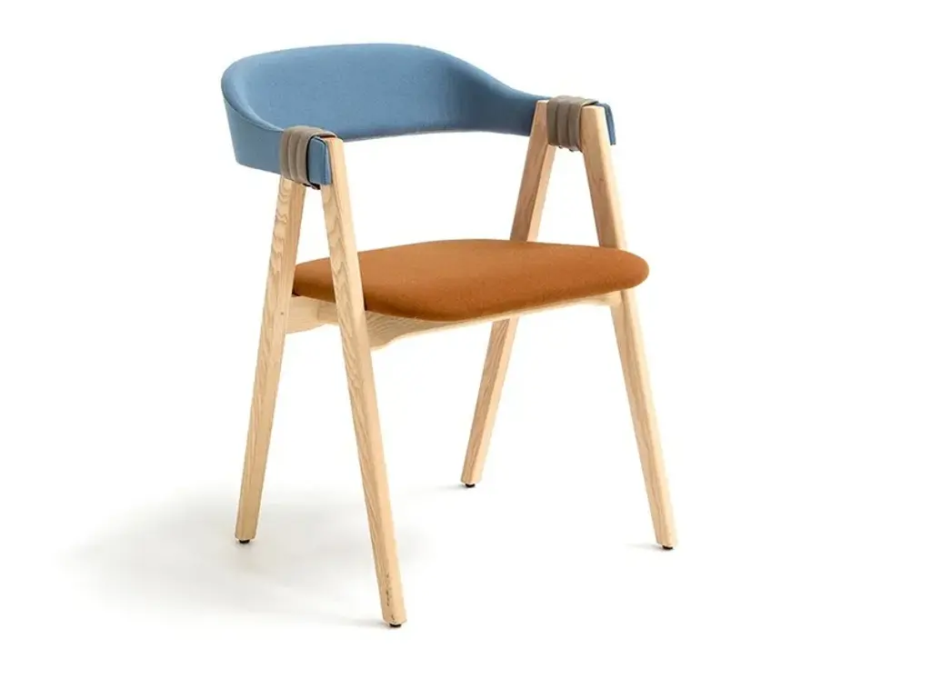 Mathilda's seat and upholstered back are flame-retardant, stress-resistant polyurethane foam in varied densities on ash frame; raffiawrapped back is also available. Arm and leg connection is covered with fabric or leather armbands; arms and legs are ash or oak in a range of finishes. Covers are not removable. The chair is stackable up to 3.An everyday object, an easily recognized shape from our collective memory, that is why it feels familiar, there is something of a resemblance. Mathilda is a modern design in the architectural sense, in the proportions between the whole and the detail. The concept is simple, perfect for its intended use: two trestles, which give solidity and affinity, hold the seat and act as a support for the backrest while also making the chairs stackable. Considered, careful intuition brings the design bang up-to-date to create a seating system which is coherent, practical and instantly recognizable.