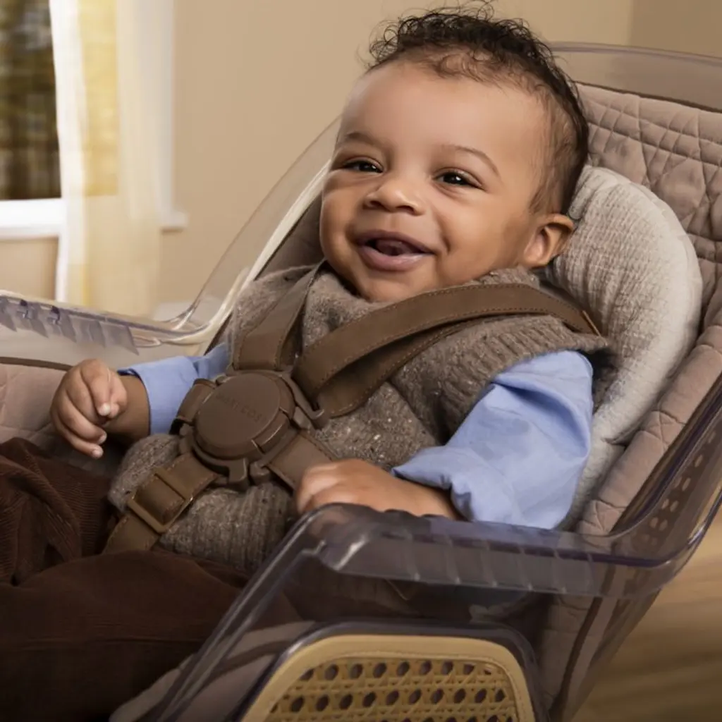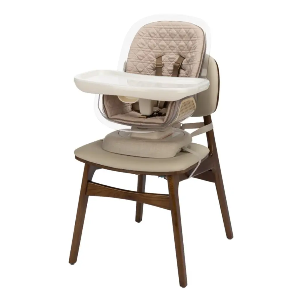 Quality-crafted with soft, breathable fabric and sturdy tapered ash wood legs, the stylish Maxi-Cosi® Kiskadee High Chair grows with them from babyhood all the way through the big-kid years. In high-chair modes, the seat rotates 360° in an upright position with the touch of a button (stopping at every 90°). This means it's easier than ever to feed and interact with your little one. With seven nifty modes in all, this ultra-adaptable design converts from an infant high chair to a booster seat to a big-kid stool. Not your typical high chair, the sturdy, clear acrylic seat features stylish embedded caning to complement your home's decor. And its smooth, molded bucket shape leaves no crevices for crumbs, making cleanup a breeze.Part of the Maxi-Cosi Kindred Collection, combining timeless design and premium materials for both comfort and style.