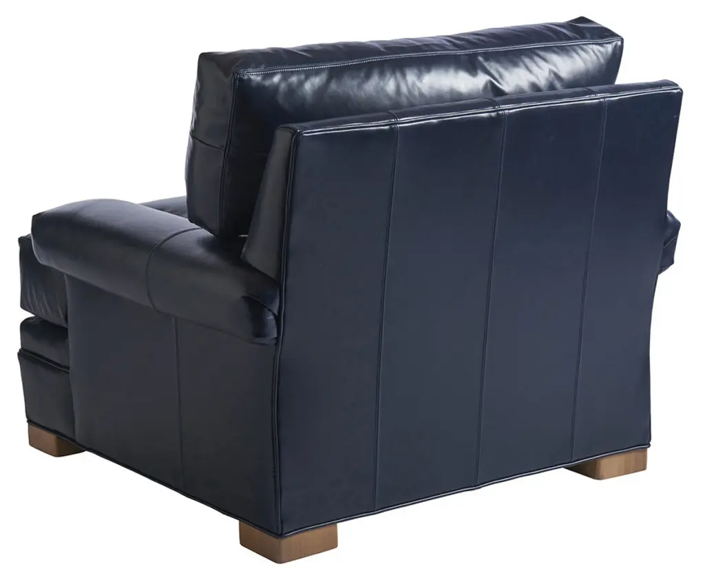 At home in a variety of decors, this club chair is designed with wide arms, contemporary block feet, and supple leather upholstery in a rich blue hue. An ample fill of foam, feathers, and down ensures long-lasting comfort and support. Made in the USA.