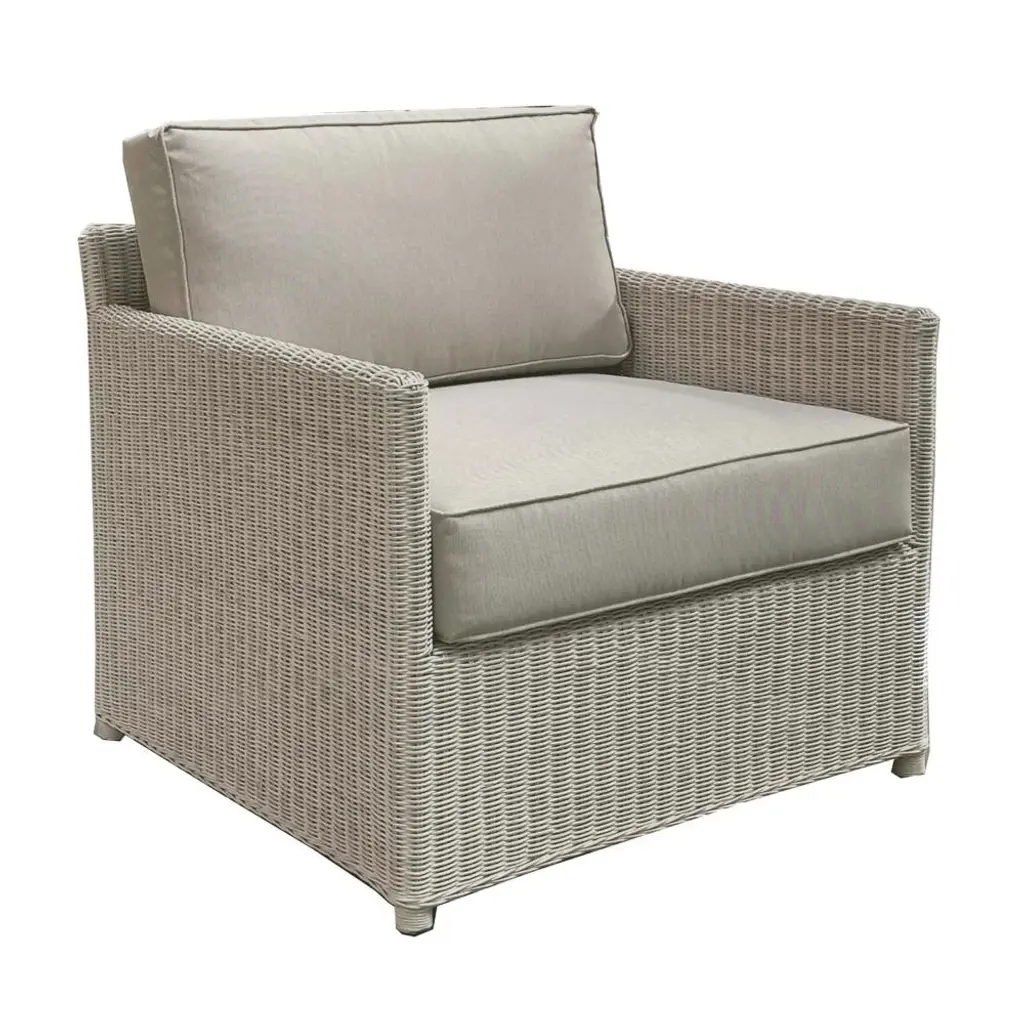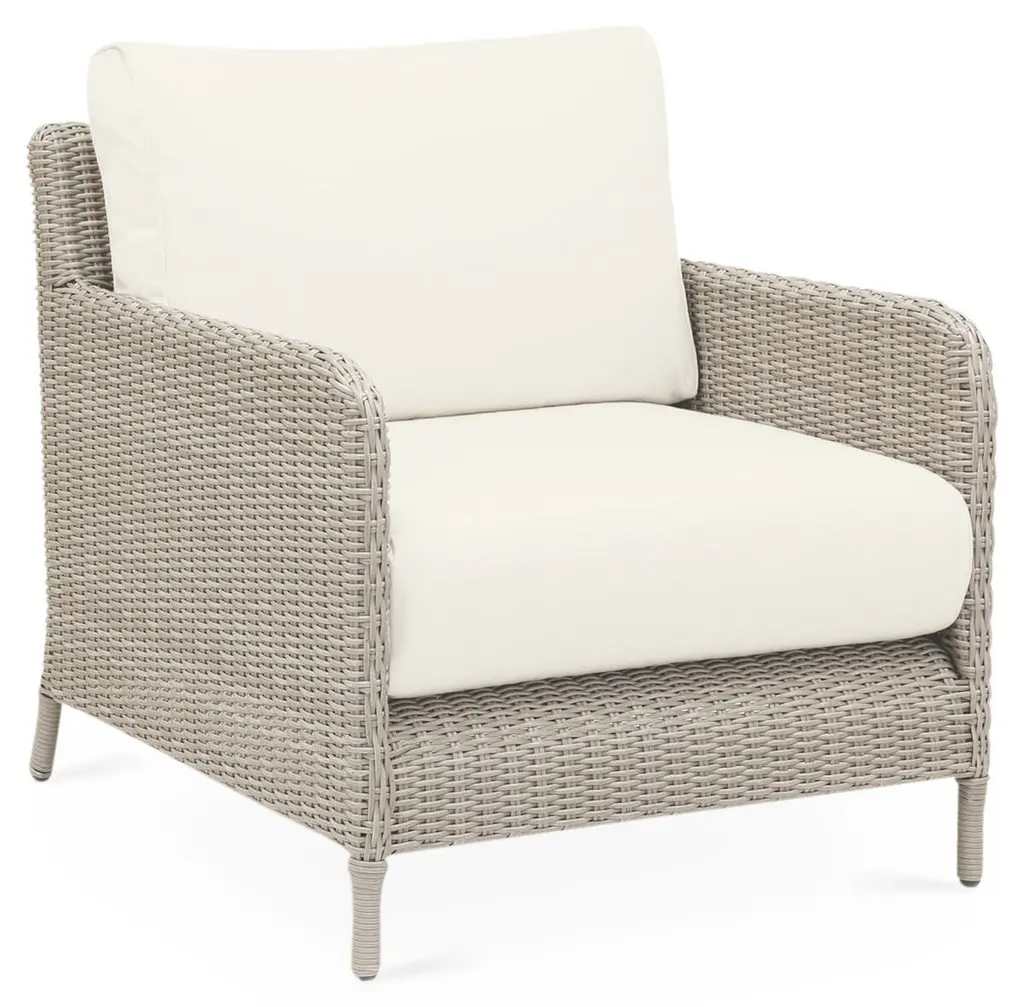 We love how a mix of robust, modern materials allows this outdoor club chair to stand up to the elements of nature without compromising on its aesthetic. Meticulously woven synthetic wicker elegantly anchors the design, while cushy Sunbrella-upholstered cushions ensure the best in comfort and support. Sunbrella is an easy-to-clean, solution-dyed acrylic fabric that is colorfast, mold-resistant, and soil-resistant, making it an ideal choice for outdoor furniture.
