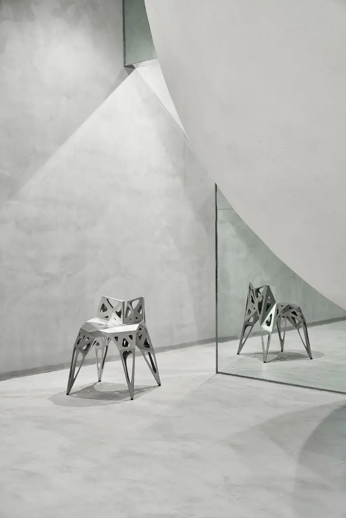 Outdoor and indoor3 official types chairs / availablesoliddotsframe2 colors official / available / finish in polish/mattblacksilverFurniture designer Zhoujie Zhang is known for the integration of automated digital design and elements of spontaneity and chance. “I believe that objects in the digital world will grow as nature does, in an organic way, but we just need to discover why and how that happens,” he once said. To produce his objects, Zhang inputs basic mathematical instructions into a computer and allows the program to generate their forms. The pieces are then cut, assembled, and polished by hand in his in-house workshop; consequently, they exist in highly limited edition sizes. In the future, he envisions using a method of production with the aid of artificial intelligence, in which he takes as little control as possible. Zhang received a degree in product design in China, and an MA in Industrial Design from Central Saint Martins in London.
