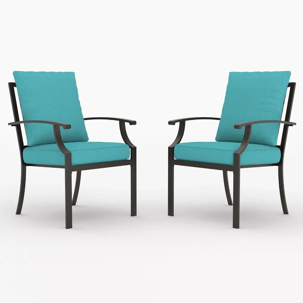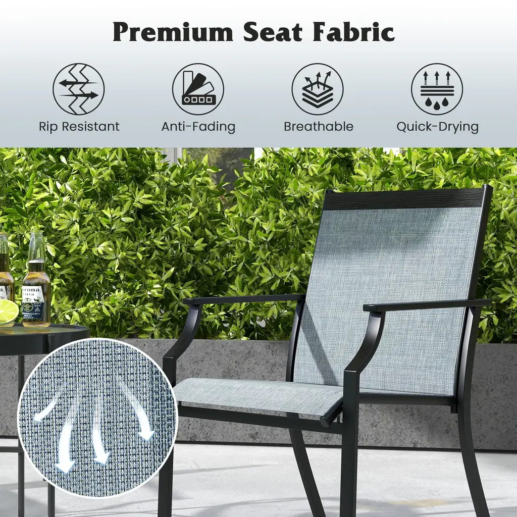 SpecificationsKey Features● Wide and Cozy Chairs: These patio chairs feature 20" wider seats for more comfort. Plus, the curved backrest and ergonomic seat effectively relieve your fatigue and make you more relaxed.● Premium Seat Fabric: Both the seat and back are made of rip-resistant and anti-fading fabric for long-term outdoor use. Moreover, the seat fabric is also breathable and quick-drying for more coziness and convenience.● Heavy-duty Metal Frame: Each chair is firmly supported by a solid metal frame that is rustproof, anti-deformation and high-strength. Also, the chairs are designed with curved hind legs for more stability.● Awesome Patio Addition: The wood-like metal surface on the back of chairs adds a piece of elegance to the surroundings. These solid and cozy patio chairs will be perfect for multiple outdoor places, such as the backyard, poolside and so on.● Hassle-free Assembly: The detailed instructions and complete accessories included in the package will highly improve the efficiency of assembly. Dimension of each chair: 26" x 24" x 35.5" (L x W x H).