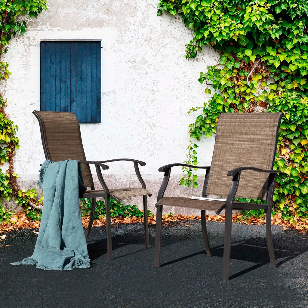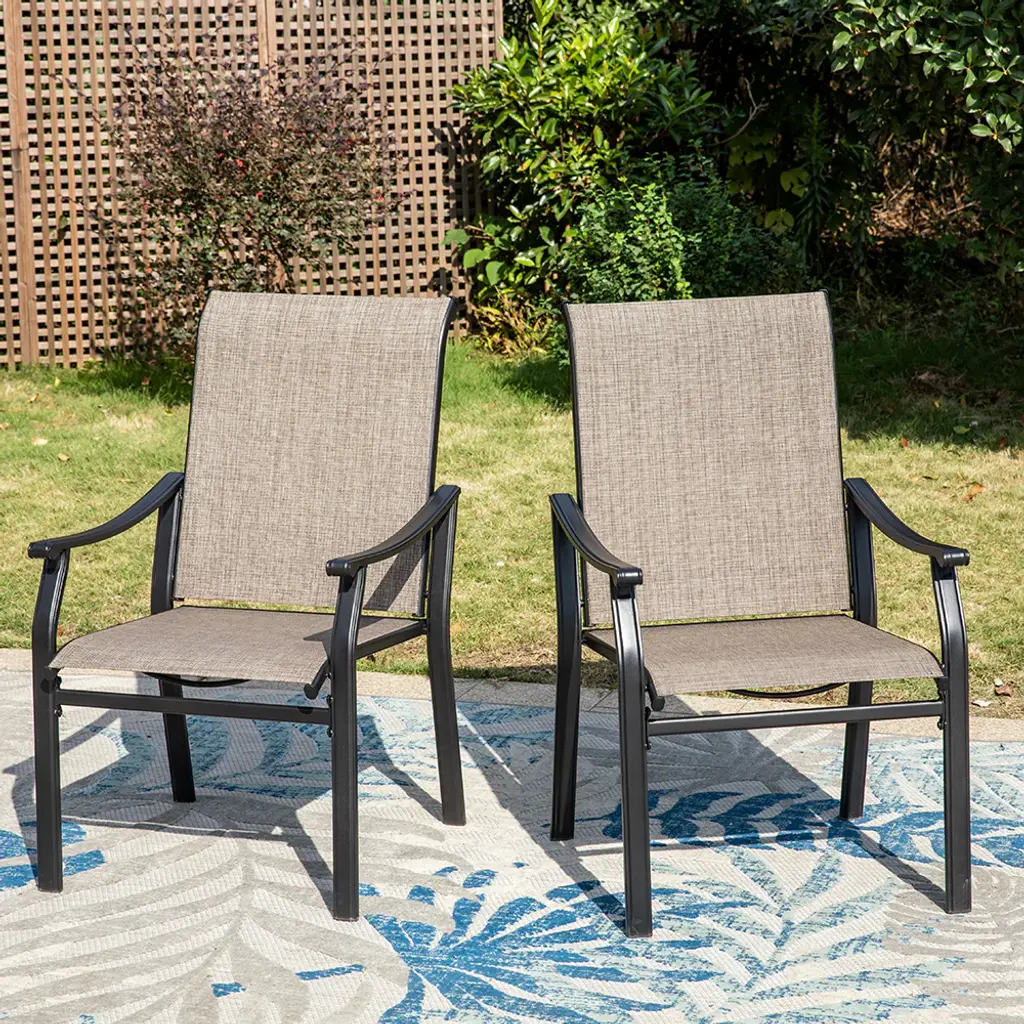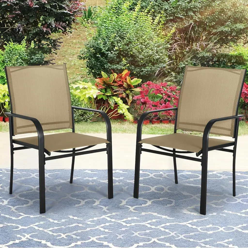 SpecificationsKey Features● Wide and Cozy Chairs: These patio chairs feature 20" wider seats for more comfort. Plus, the curved backrest and ergonomic seat effectively relieve your fatigue and make you more relaxed.● Premium Seat Fabric: Both the seat and back are made of rip-resistant and anti-fading fabric for long-term outdoor use. Moreover, the seat fabric is also breathable and quick-drying for more coziness and convenience.● Heavy-duty Metal Frame: Each chair is firmly supported by a solid metal frame that is rustproof, anti-deformation and high-strength. Also, the chairs are designed with curved hind legs for more stability.● Awesome Patio Addition: The wood-like metal surface on the back of chairs adds a piece of elegance to the surroundings. These solid and cozy patio chairs will be perfect for multiple outdoor places, such as the backyard, poolside and so on.● Hassle-free Assembly: The detailed instructions and complete accessories included in the package will highly improve the efficiency of assembly. Dimension of each chair: 26" x 24" x 35.5" (L x W x H).