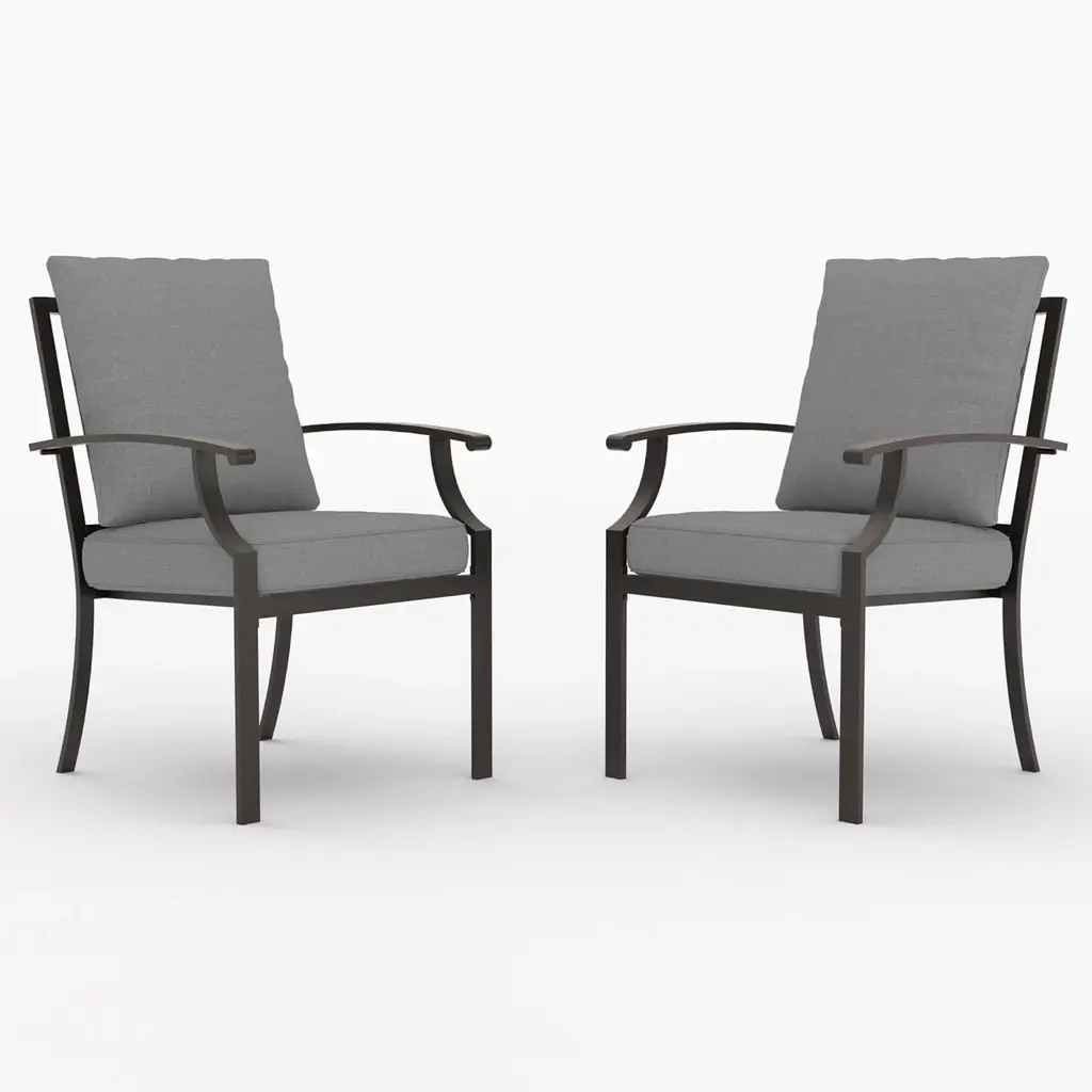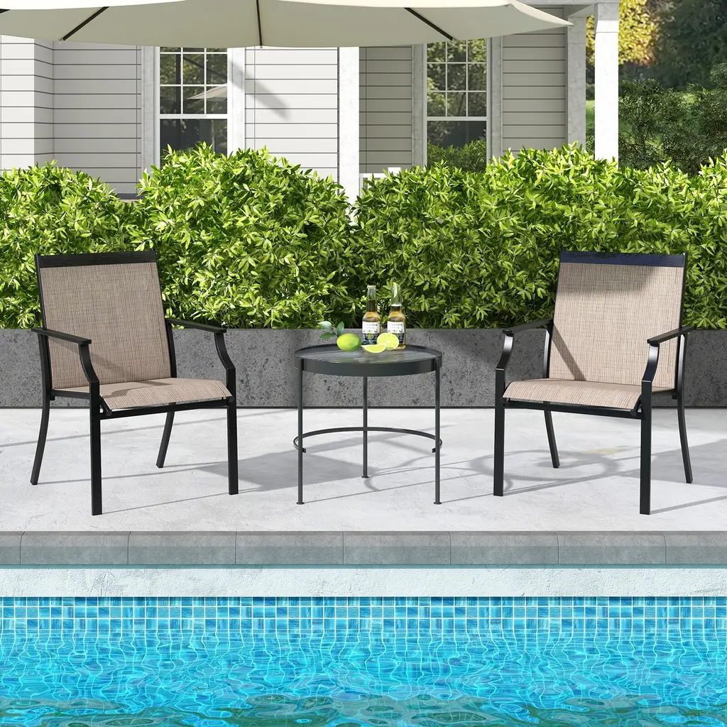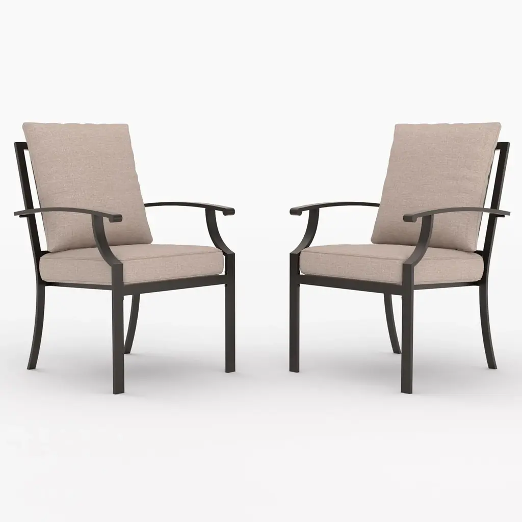 SpecificationsKey Features● Wide and Cozy Chairs: These patio chairs feature 20" wider seats for more comfort. Plus, the curved backrest and ergonomic seat effectively relieve your fatigue and make you more relaxed.● Premium Seat Fabric: Both the seat and back are made of rip-resistant and anti-fading fabric for long-term outdoor use. Moreover, the seat fabric is also breathable and quick-drying for more coziness and convenience.● Heavy-duty Metal Frame: Each chair is firmly supported by a solid metal frame that is rustproof, anti-deformation and high-strength. Also, the chairs are designed with curved hind legs for more stability.● Awesome Patio Addition: The wood-like metal surface on the back of chairs adds a piece of elegance to the surroundings. These solid and cozy patio chairs will be perfect for multiple outdoor places, such as the backyard, poolside and so on.● Hassle-free Assembly: The detailed instructions and complete accessories included in the package will highly improve the efficiency of assembly. Dimension of each chair: 26" x 24" x 35.5" (L x W x H).