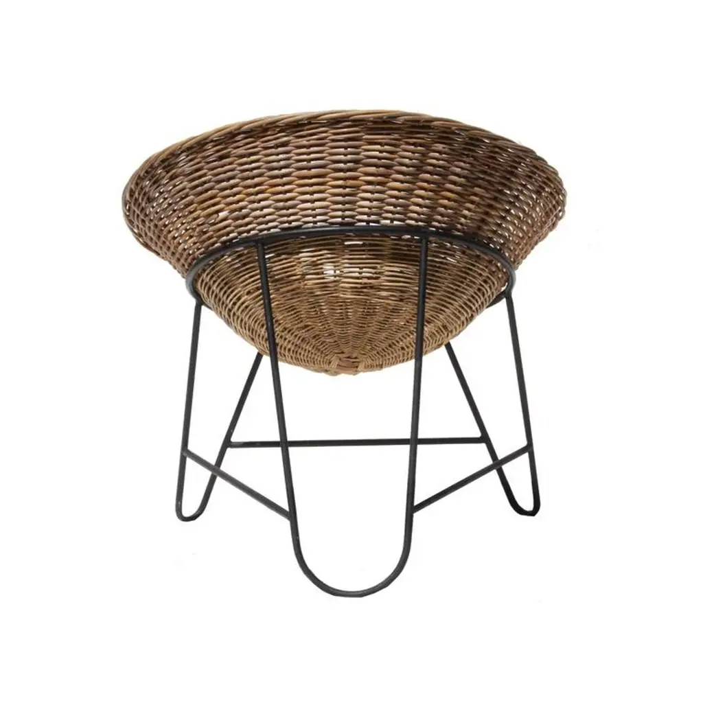 Wicker chair designed by Mathieu Matégot, featuring a black lacquered iron frame and a natural fiber seat. With its lightweight yet durable construction, this piece reflects Matégot’s signature fusion of industrial materials and organic forms. An iconic example of mid-century French design, ideal for refined, modern, or vintage-inspired interiors.16 Chairs available.