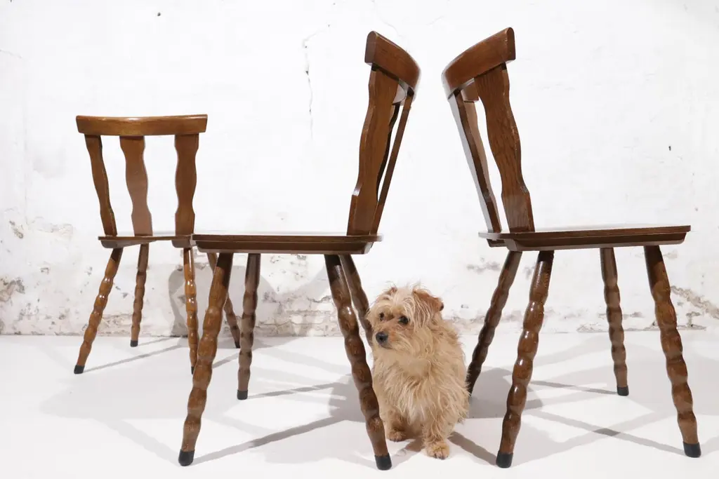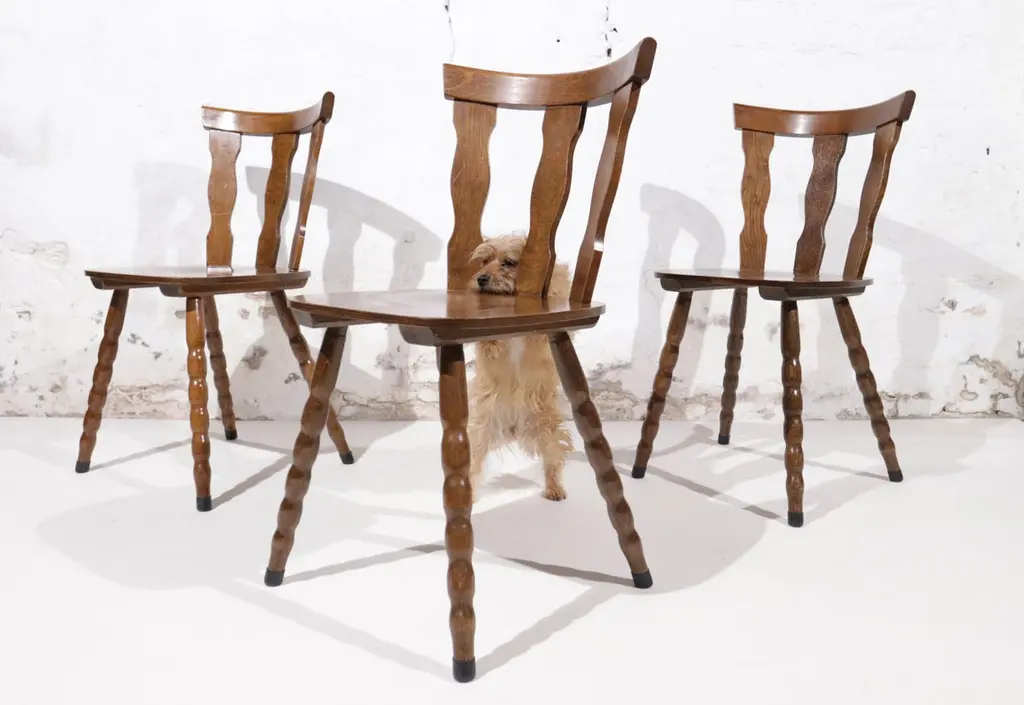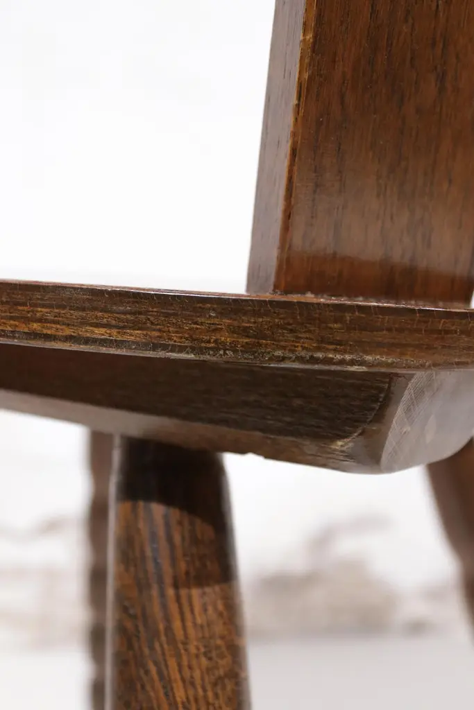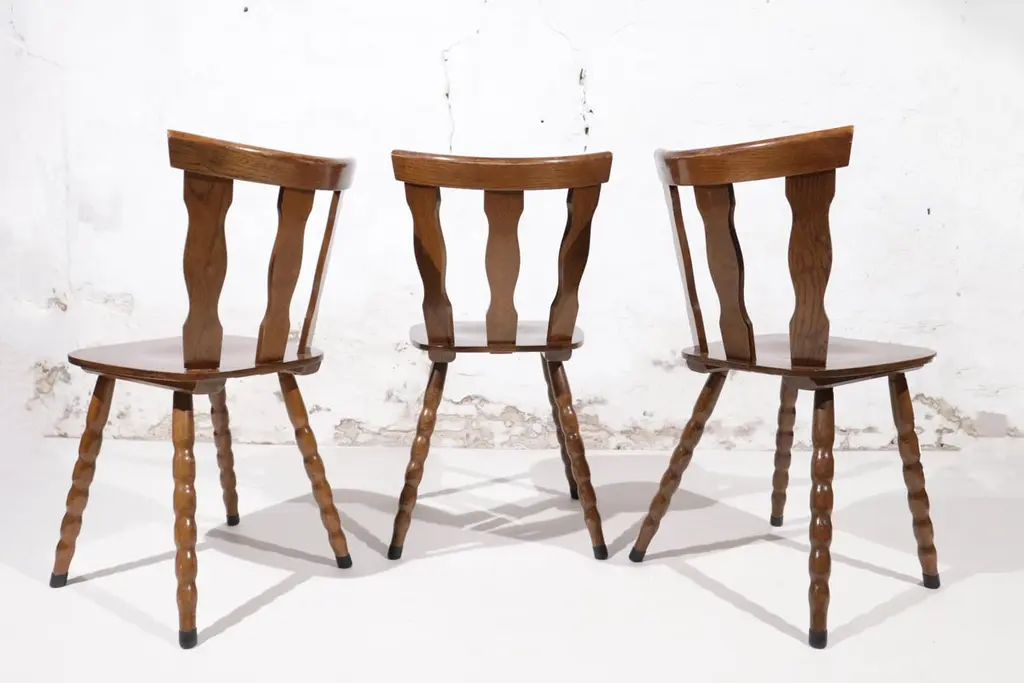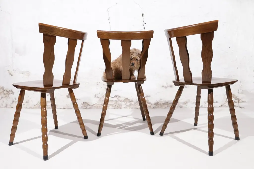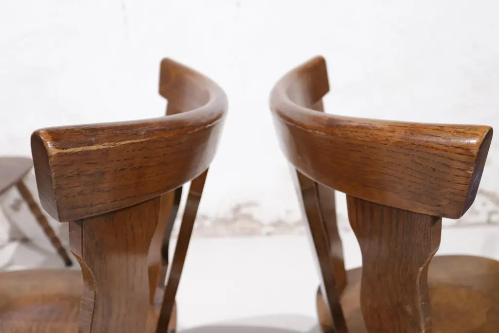 Beautiful Mid-Century Brutlist Chairs with Arch Cut-Outs and Bobbin LegsFit perfectly with the style of designers such as Axel Einar Hjorth, Charlotte Perriand, Jean Touret and Charles Dudouyt.The chairs are comfortable and the use of only natural materials gives them a warm appearance.The chairs fit in a Brutalism, Wabi Sabi, Rural or Modern interior In original condition with minimal wear.