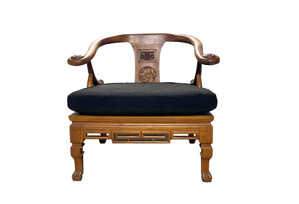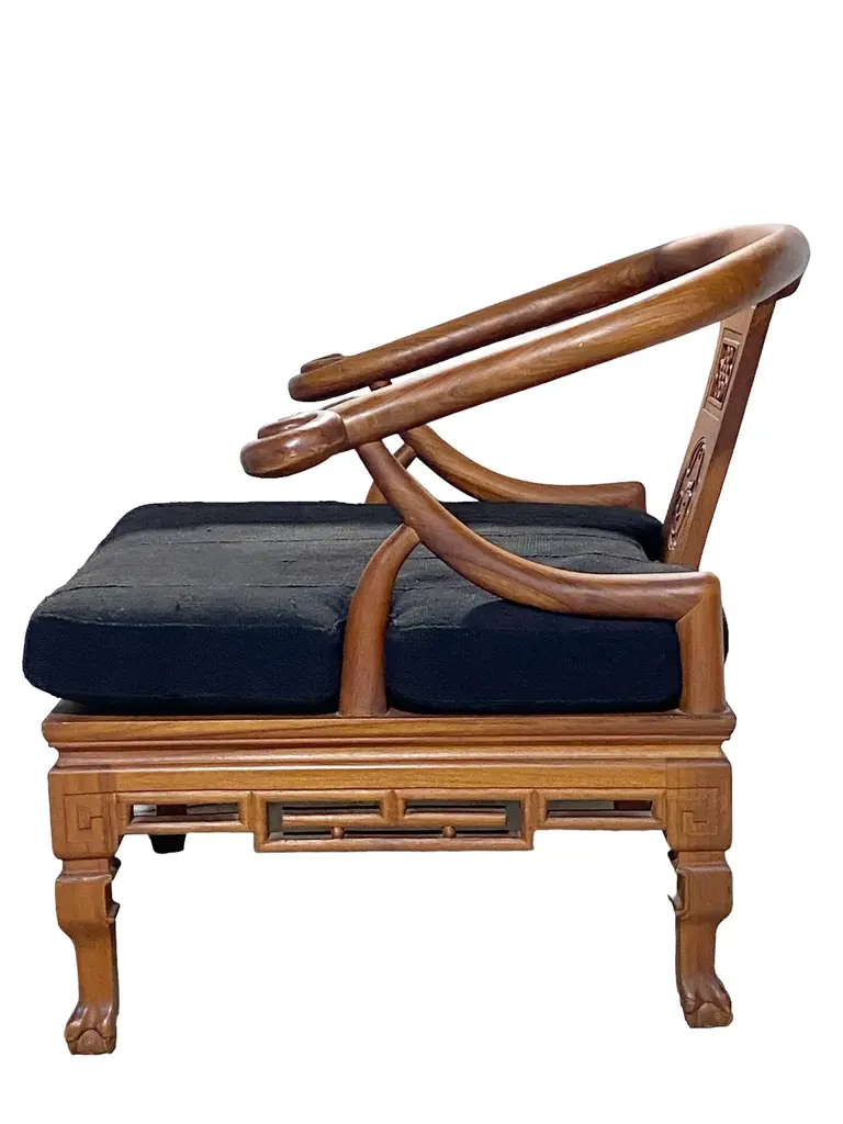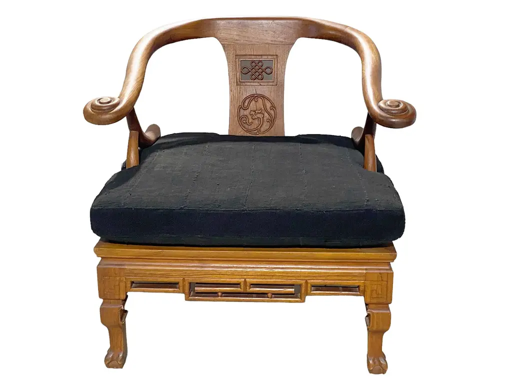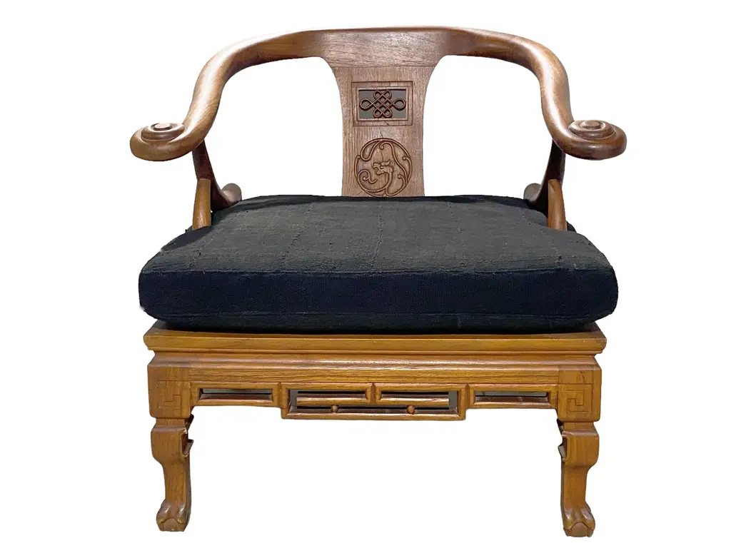 This Mid Century Chinese Style Horseshoe Back Chair boasts elegant design with natural solid wood and vintage African Black Mud cloth upholstery. The chair is in excellent condition and measures 27" in height, 25" in width, 27" in depth, with a seat height of 15".