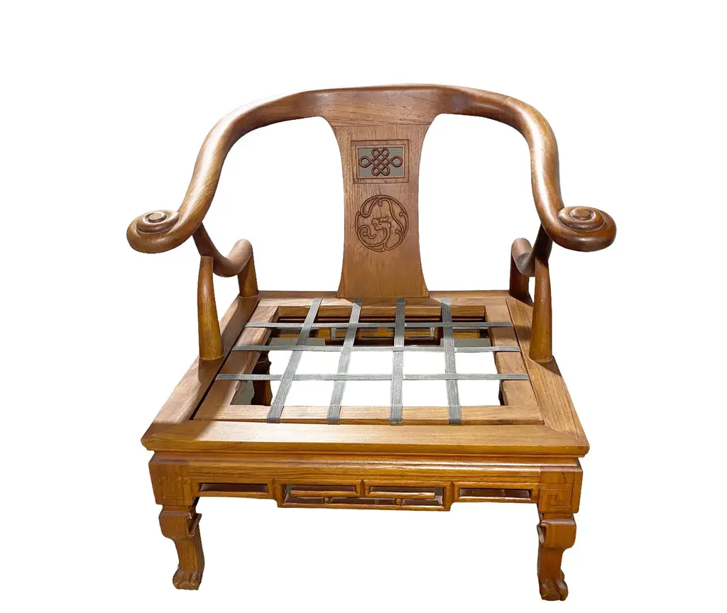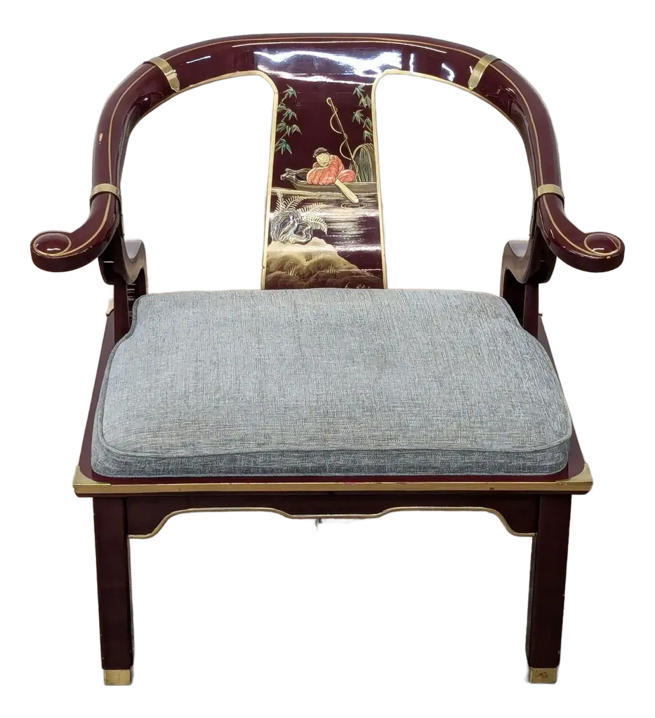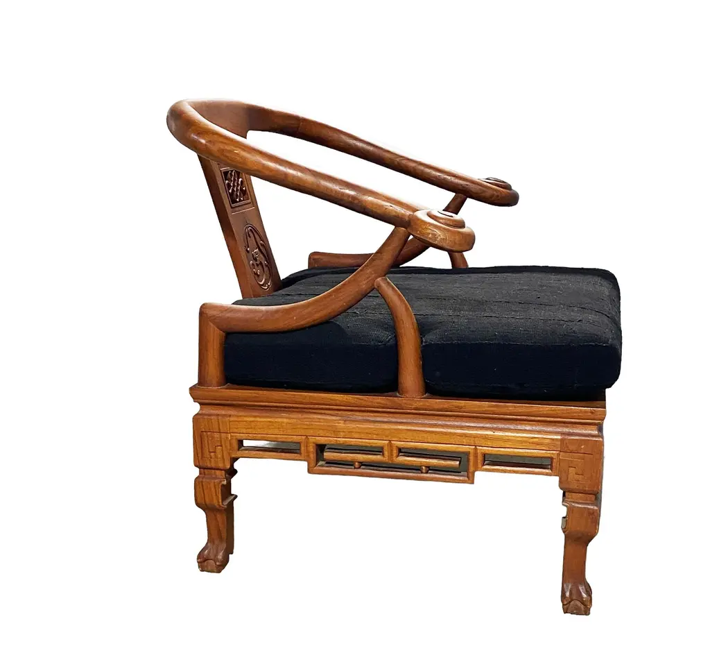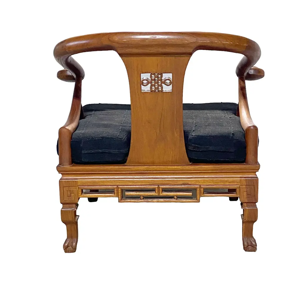 This Mid Century Chinese Style Horseshoe Back Chair boasts elegant design with natural solid wood and vintage African Black Mud cloth upholstery. The chair is in excellent condition and measures 27" in height, 25" in width, 27" in depth, with a seat height of 15".