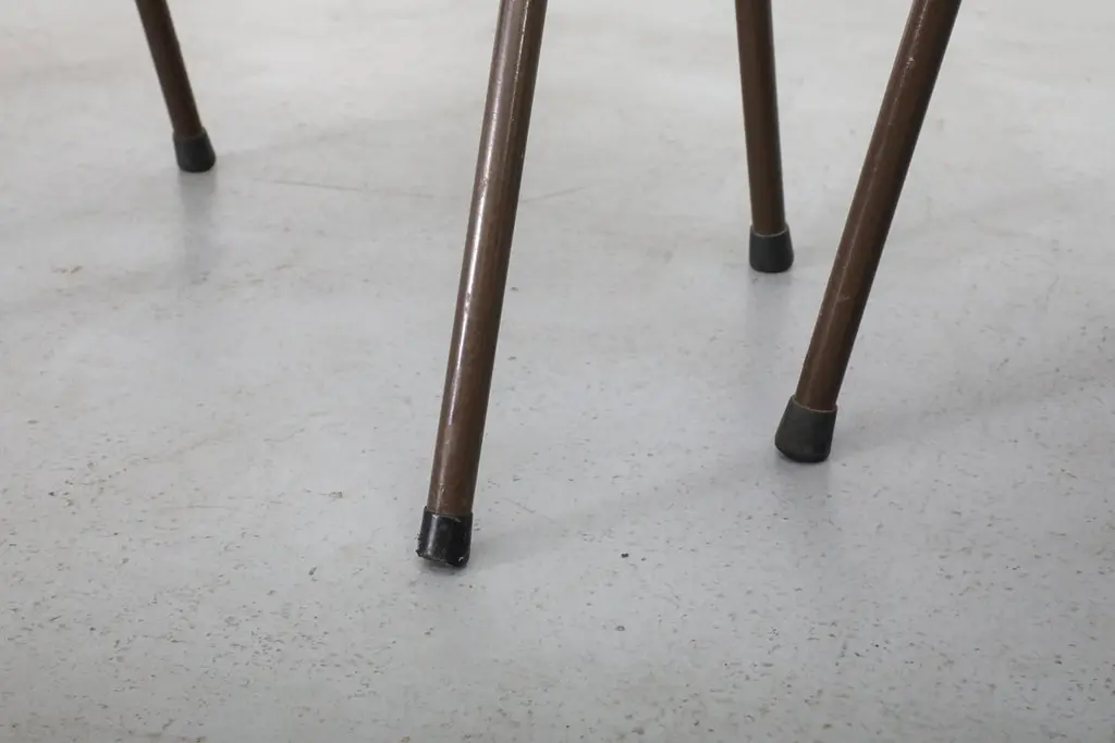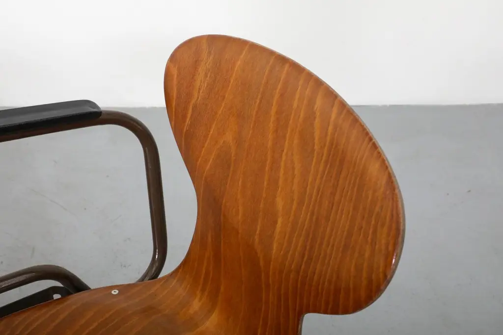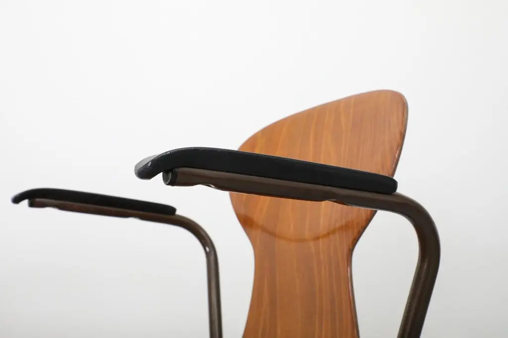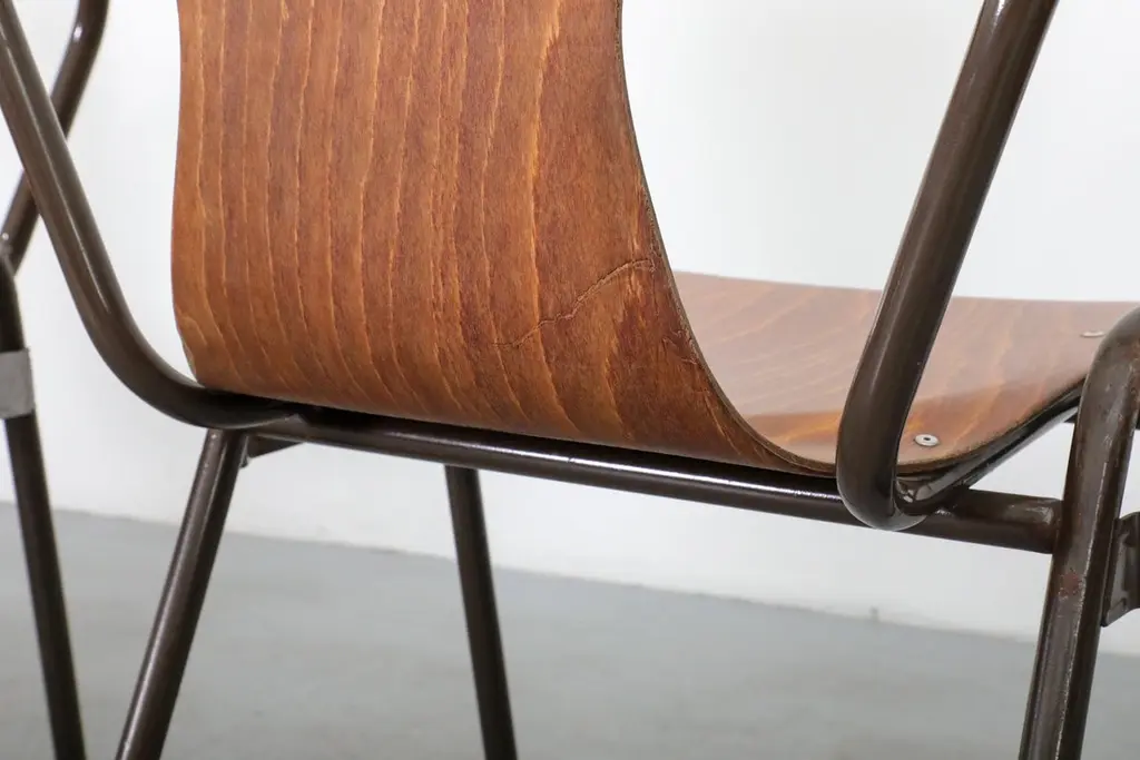 Mid-Century, Fritz Hansen style auditorium chairs. This lot was originally used in a Dutch church. Design features single shell, pressed and bent teak slipper seats atop of a brown enameled metal tubular frame. Comes in two styles: With and without armrests, armrests are 27.75 inches high. Chairs without armrests listed separately (LU92248405033). Chairs are in good original condition with age appropriate wear and have a lead time of 10 days.