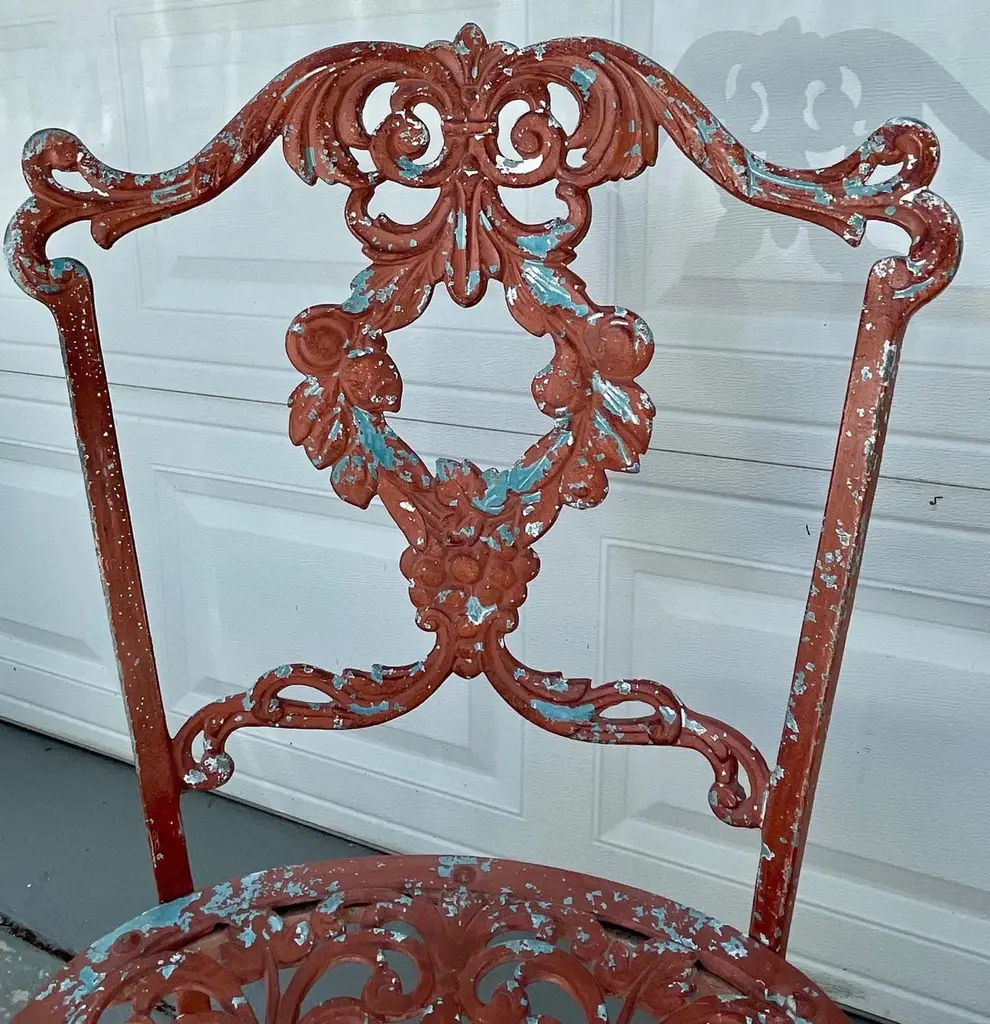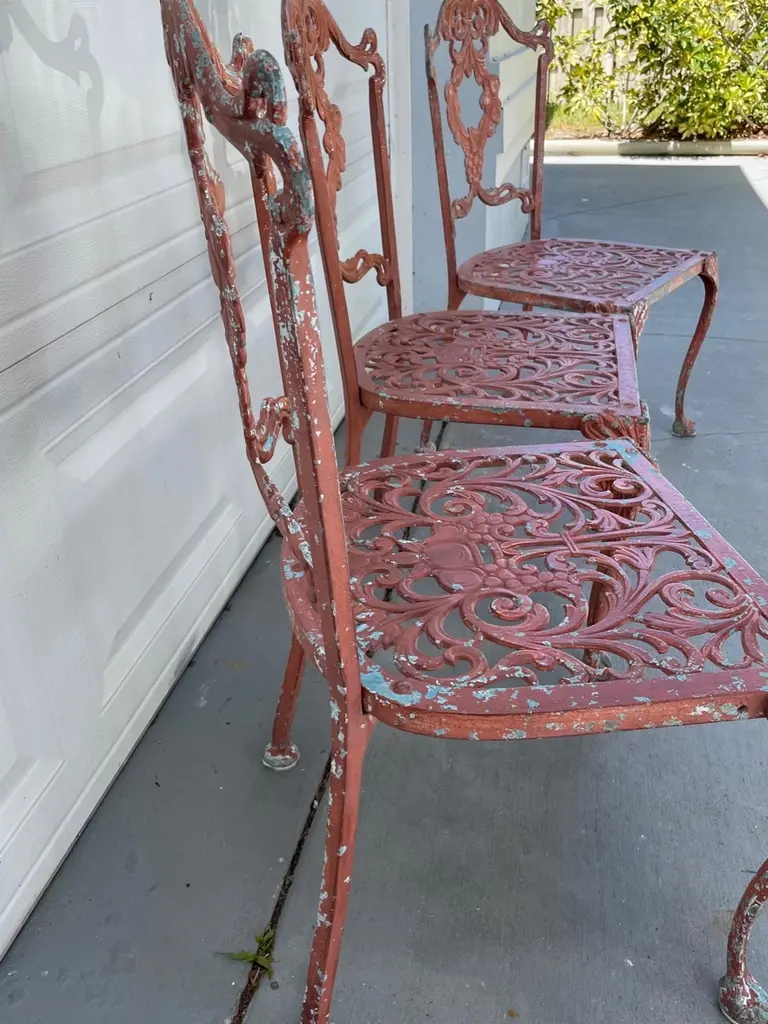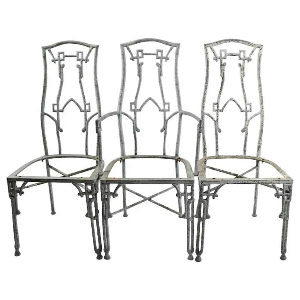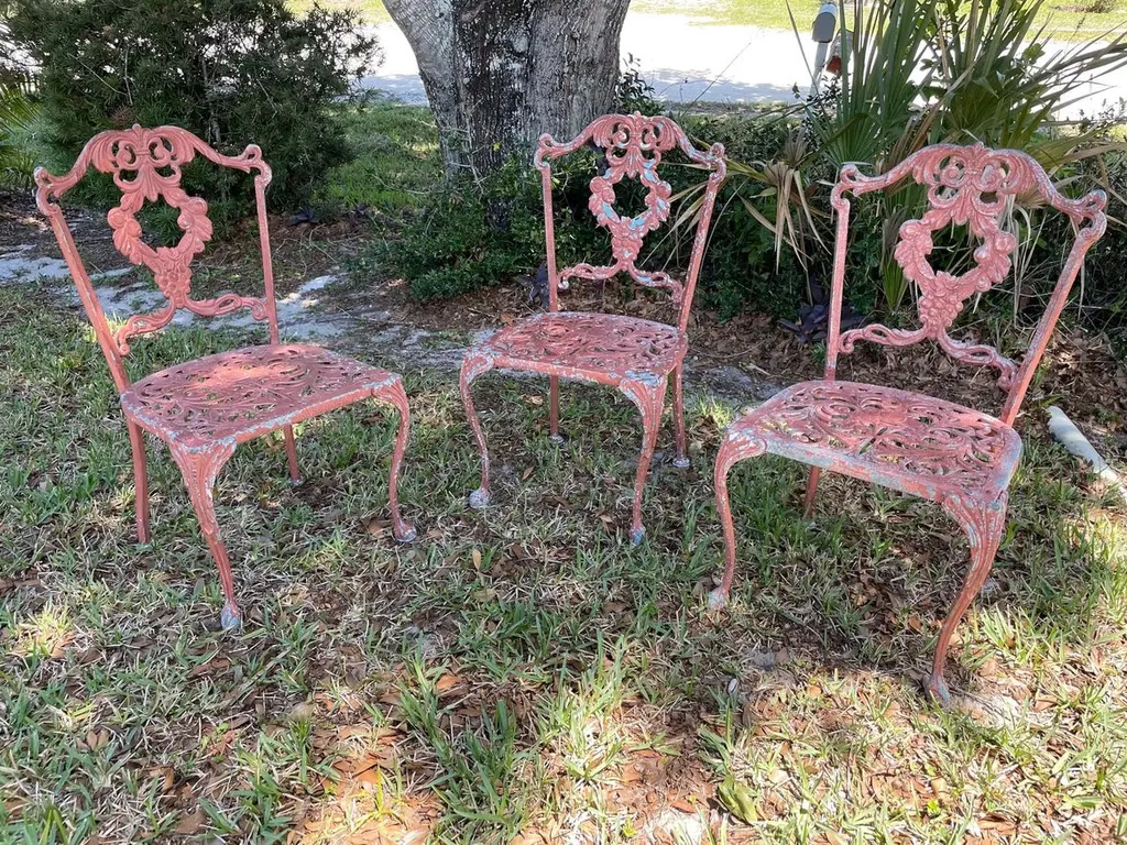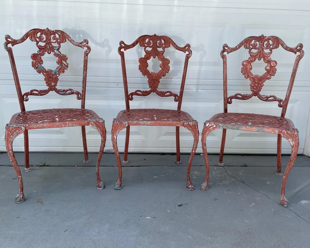 Mid-Century Hollywood Regency MOLLA Company Patio, outdoor, garden chairsThis set of 3 matching, vintage, chipped paint patio chairs by MOLLA Company are created in the mid-century, Hollywood Regency. The MOLLA Company of the 1950s created glamorous patio furniture in finely cast aluminum. The quality garden furniture, which has become quite rare and sought after, is therefore resistant to rust and corrosion. The superb design of these chairs features detailed flowers, grapes and scroll patterns. They are supported by elongated s-shaped legs that end in claw and ball feet. Three cushions are included with the garden chairs.Condition: Chairs are repainted. The paint is chipped. Measurements: H 35” x W 19” x D 19”Seat - H 16.5” x W 18” x D 16.5”Weight: 15 lbs. each.