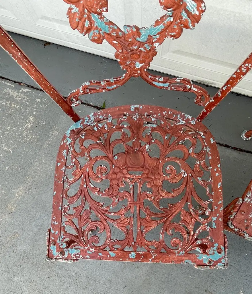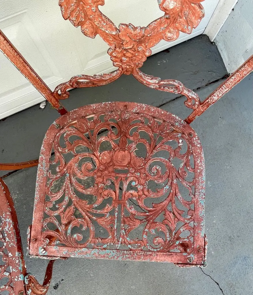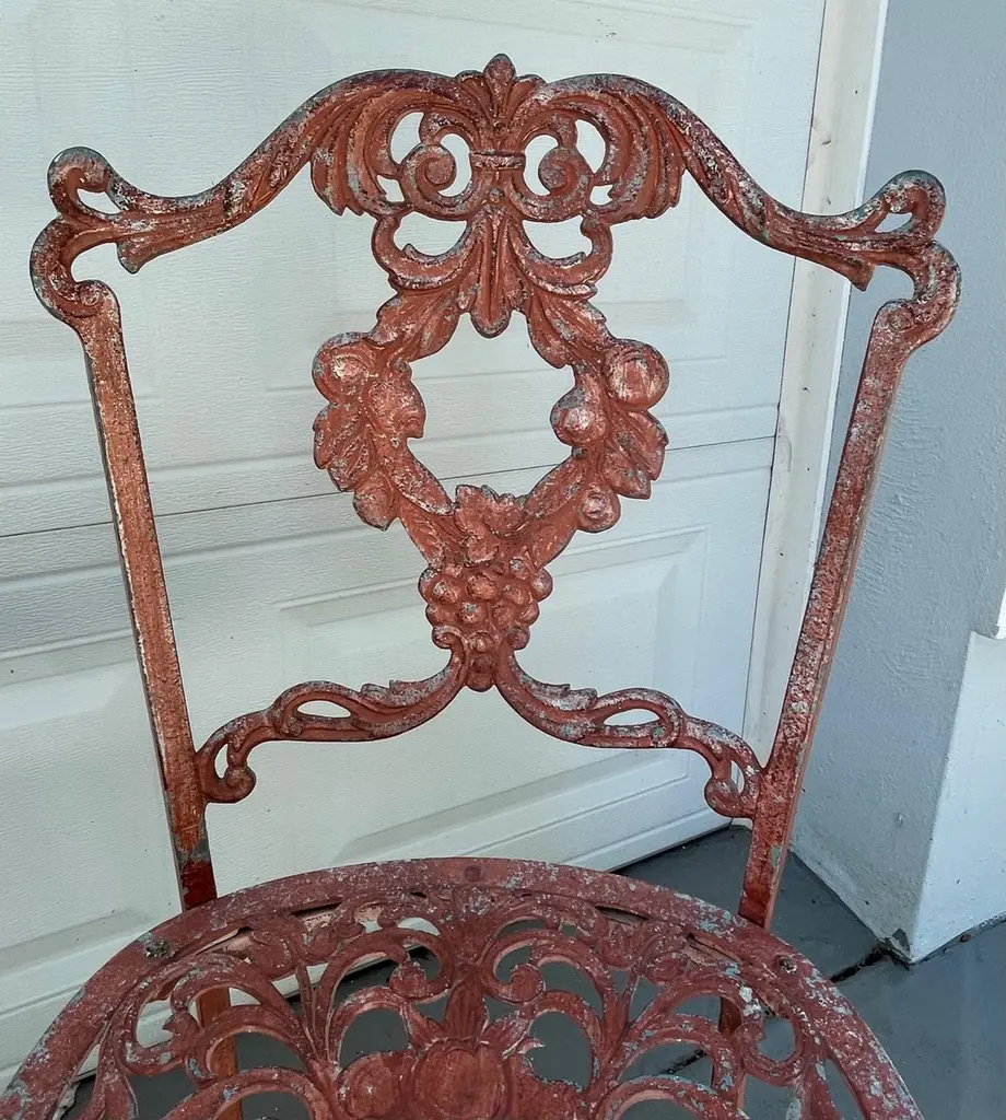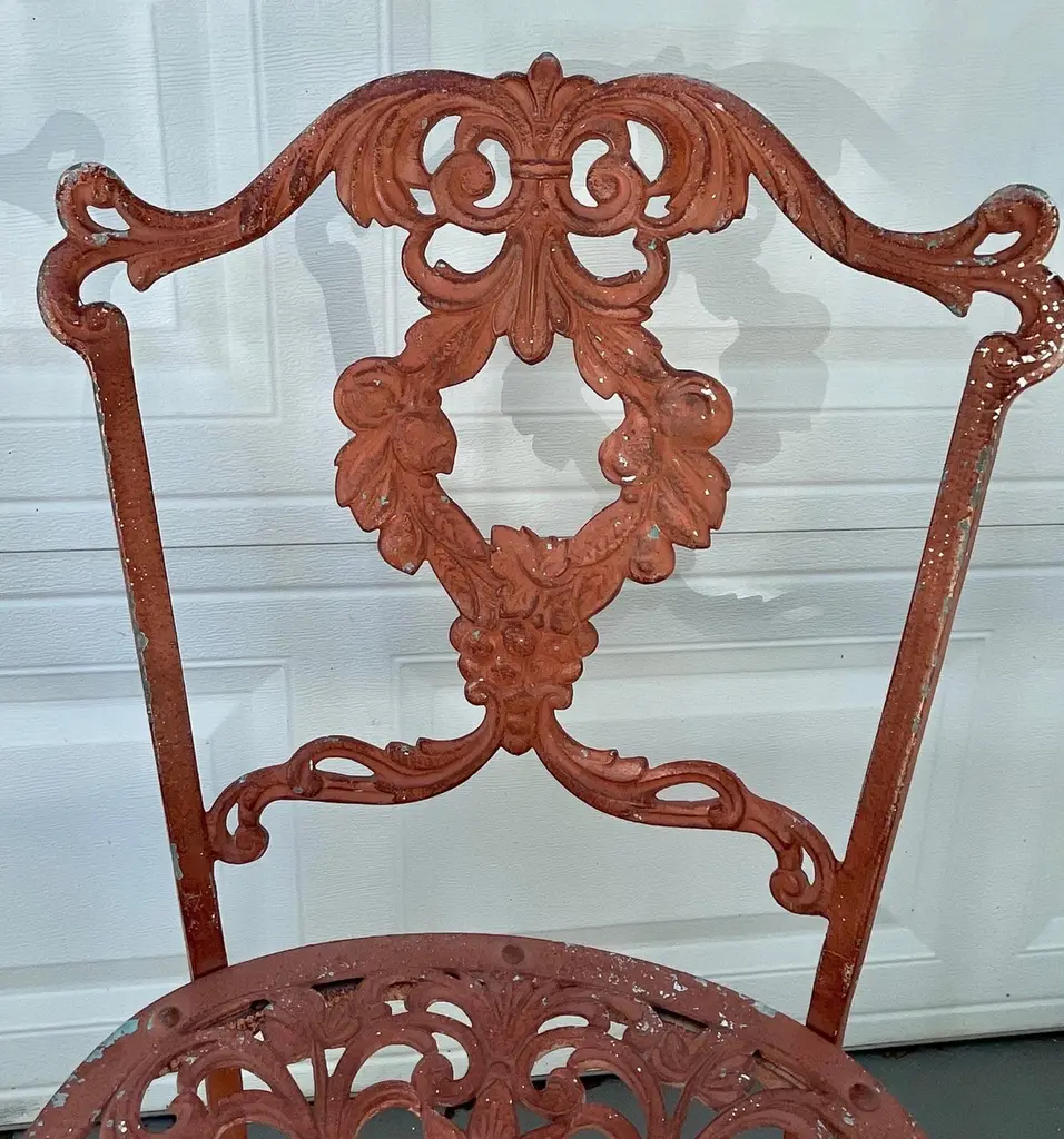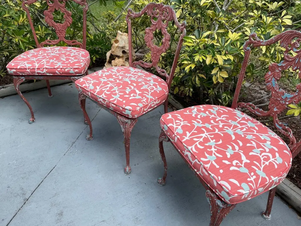 Mid-Century Hollywood Regency MOLLA Company Patio, outdoor, garden chairsThis set of 3 matching, vintage, chipped paint patio chairs by MOLLA Company are created in the mid-century, Hollywood Regency. The MOLLA Company of the 1950s created glamorous patio furniture in finely cast aluminum. The quality garden furniture, which has become quite rare and sought after, is therefore resistant to rust and corrosion. The superb design of these chairs features detailed flowers, grapes and scroll patterns. They are supported by elongated s-shaped legs that end in claw and ball feet. Three cushions are included with the garden chairs.Condition: Chairs are repainted. The paint is chipped. Measurements: H 35” x W 19” x D 19”Seat - H 16.5” x W 18” x D 16.5”Weight: 15 lbs. each.