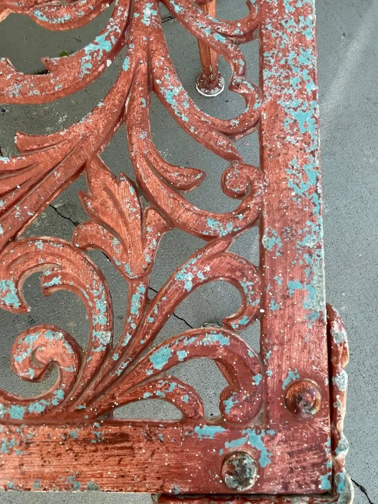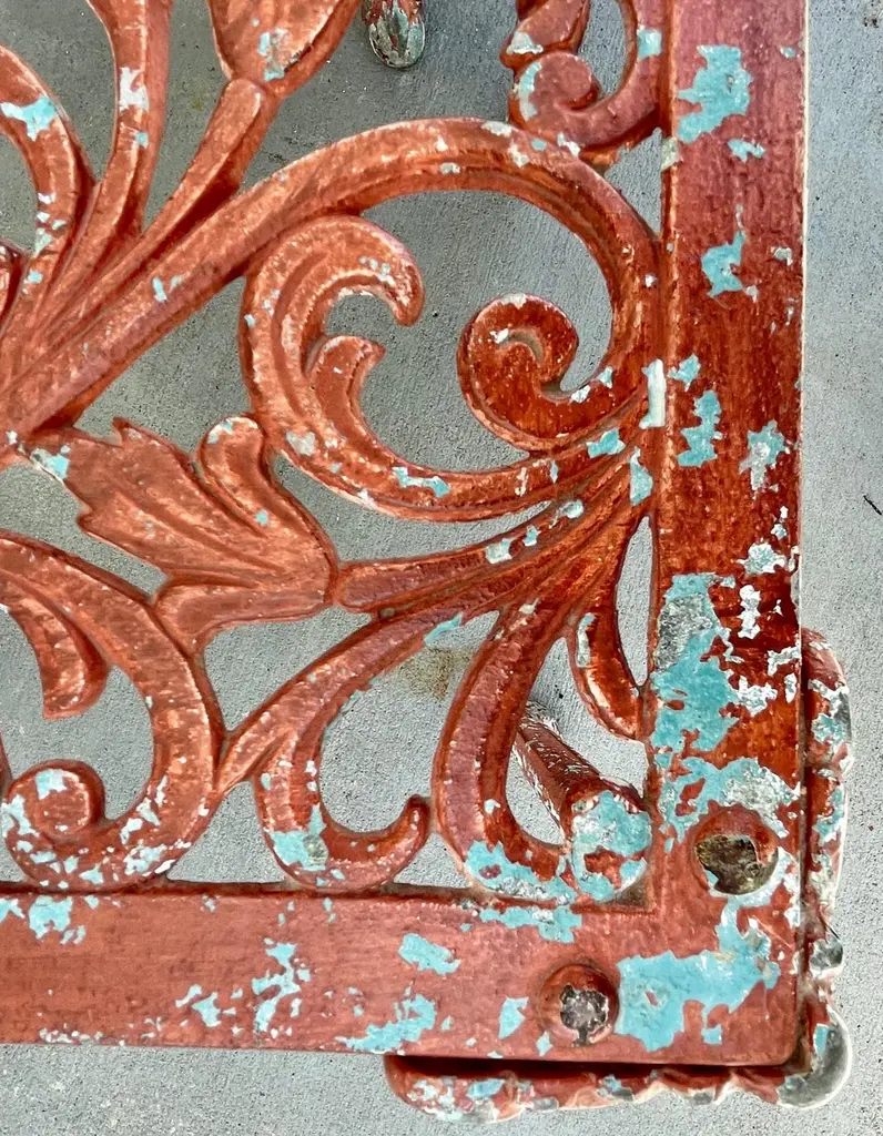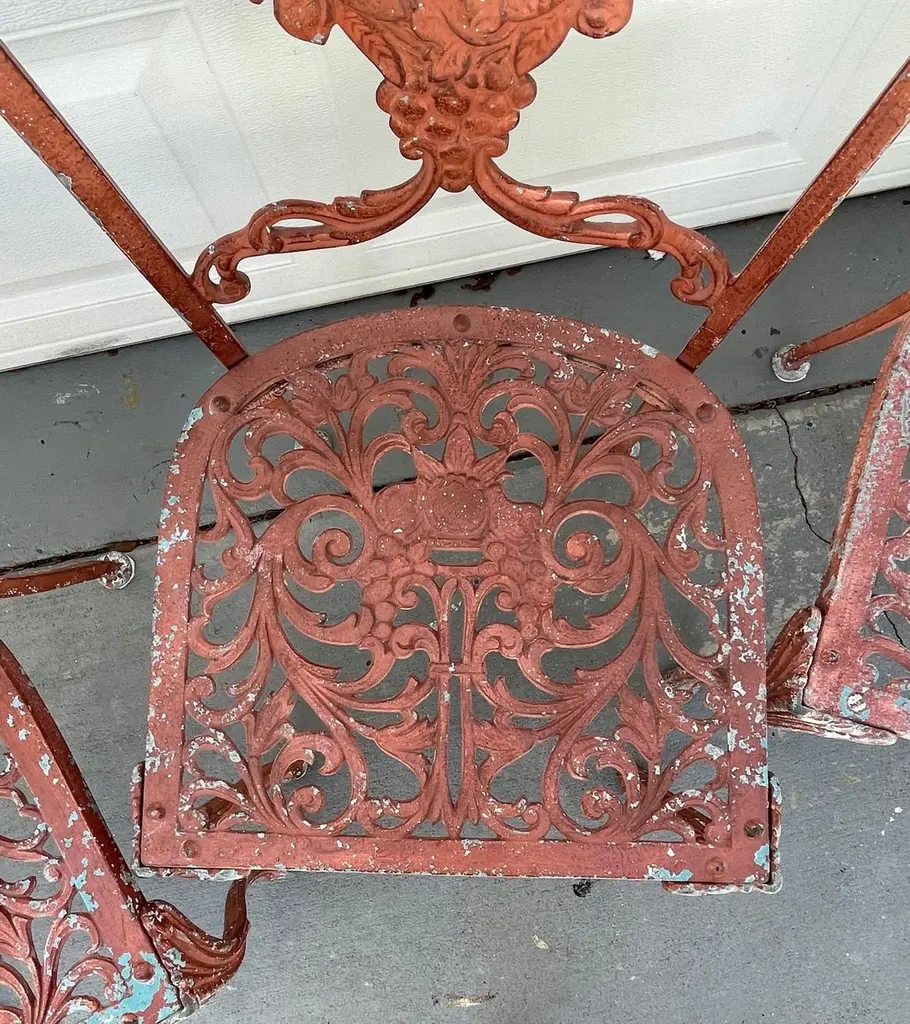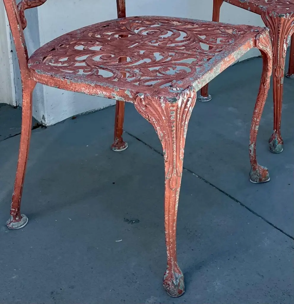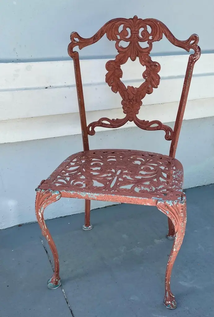 Mid-Century Hollywood Regency MOLLA Company Patio, outdoor, garden chairsThis set of 3 matching, vintage, chipped paint patio chairs by MOLLA Company are created in the mid-century, Hollywood Regency. The MOLLA Company of the 1950s created glamorous patio furniture in finely cast aluminum. The quality garden furniture, which has become quite rare and sought after, is therefore resistant to rust and corrosion. The superb design of these chairs features detailed flowers, grapes and scroll patterns. They are supported by elongated s-shaped legs that end in claw and ball feet. Three cushions are included with the garden chairs.Condition: Chairs are repainted. The paint is chipped. Measurements: H 35” x W 19” x D 19”Seat - H 16.5” x W 18” x D 16.5”Weight: 15 lbs. each.