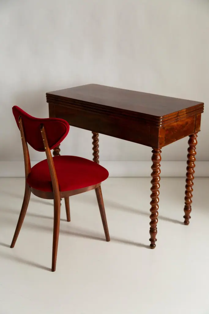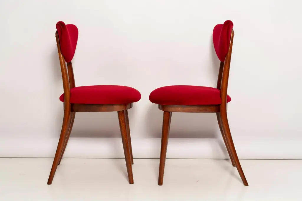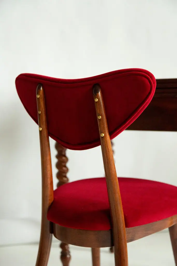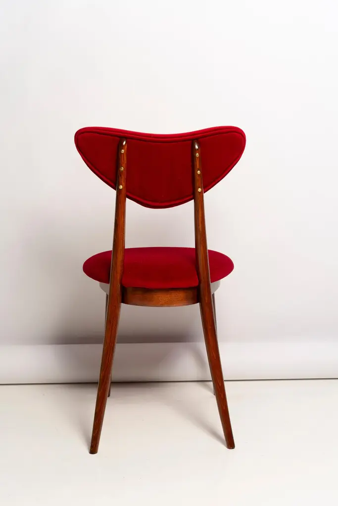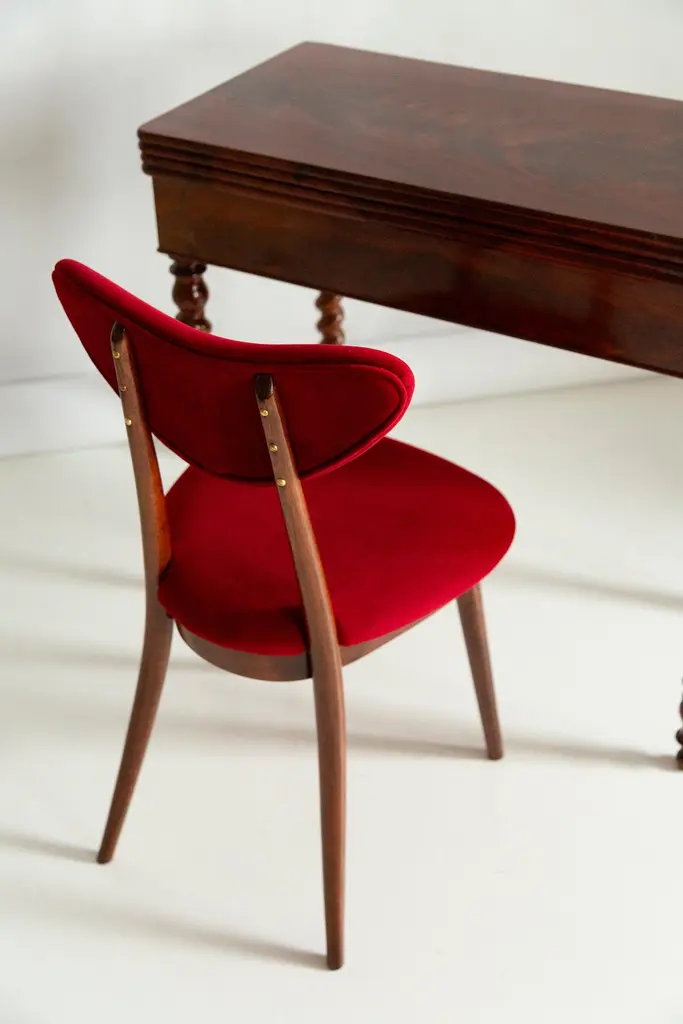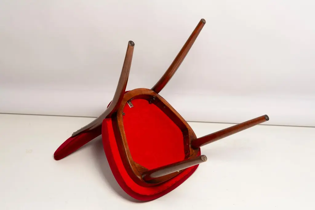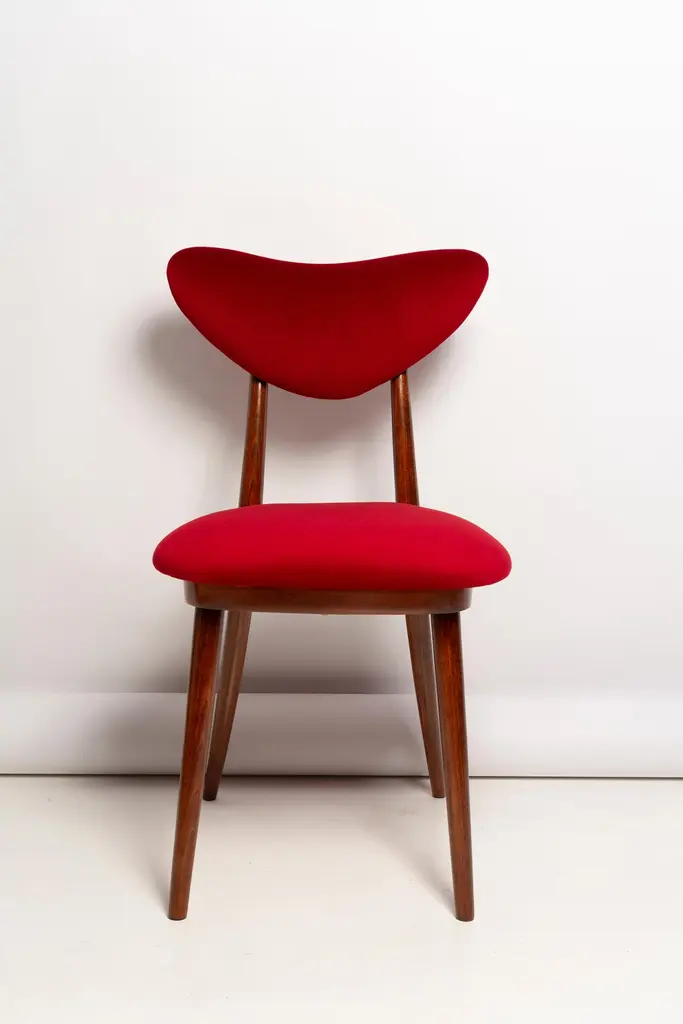 Chair type A5828. Colloquially called "heart". The furniture was designed by Helena and Jerzy Kurmanowicz. They were produced in Radomsko Woodworking Factory and we thoroughly renovated them. The construction is made of beech wood dyed with water stain brown. The chairs are protected with acrylic varnish with a satin glow. The upholstery fabric was produced in the Clean boo technology and has water-repellent properties. This means that the fabric limits the absorption of liquids. Spilled liquid on the surface will form balls. The chairs have undergone a complete carpentry and upholstery renovation. Seats covered with high-quality red velvet (color 2232). ABRASION RESISTANCE Category A (60,000 cycles). We can prepare also bigger sets 4, 6, 8 or more chairs in different wood and velvet color.