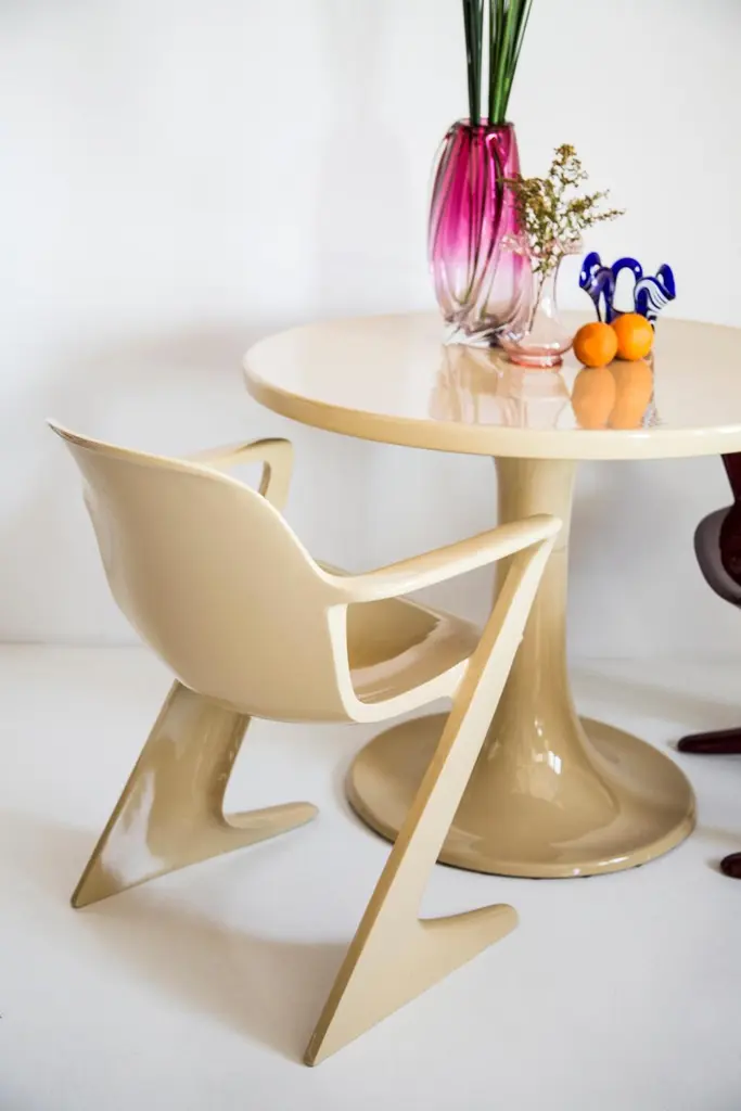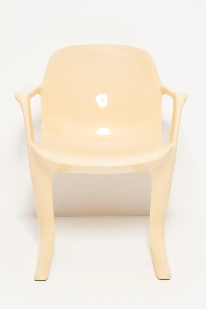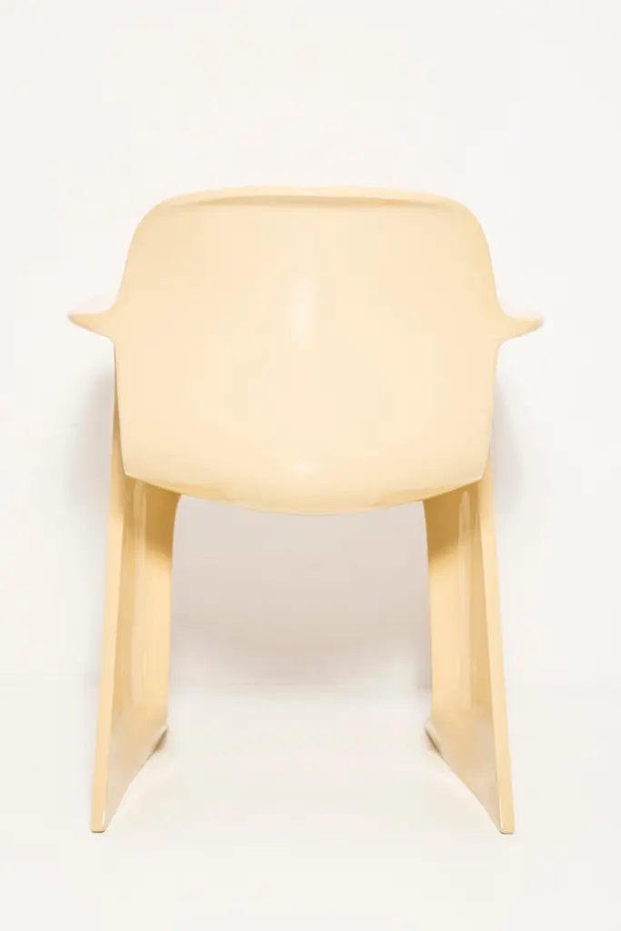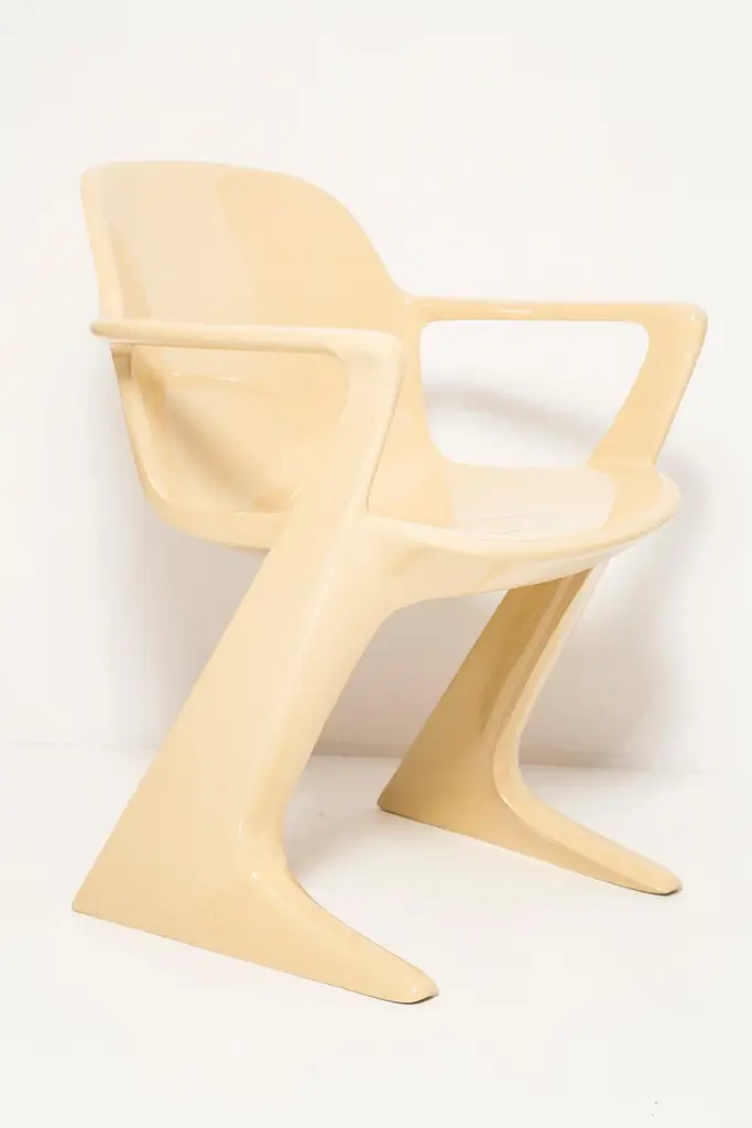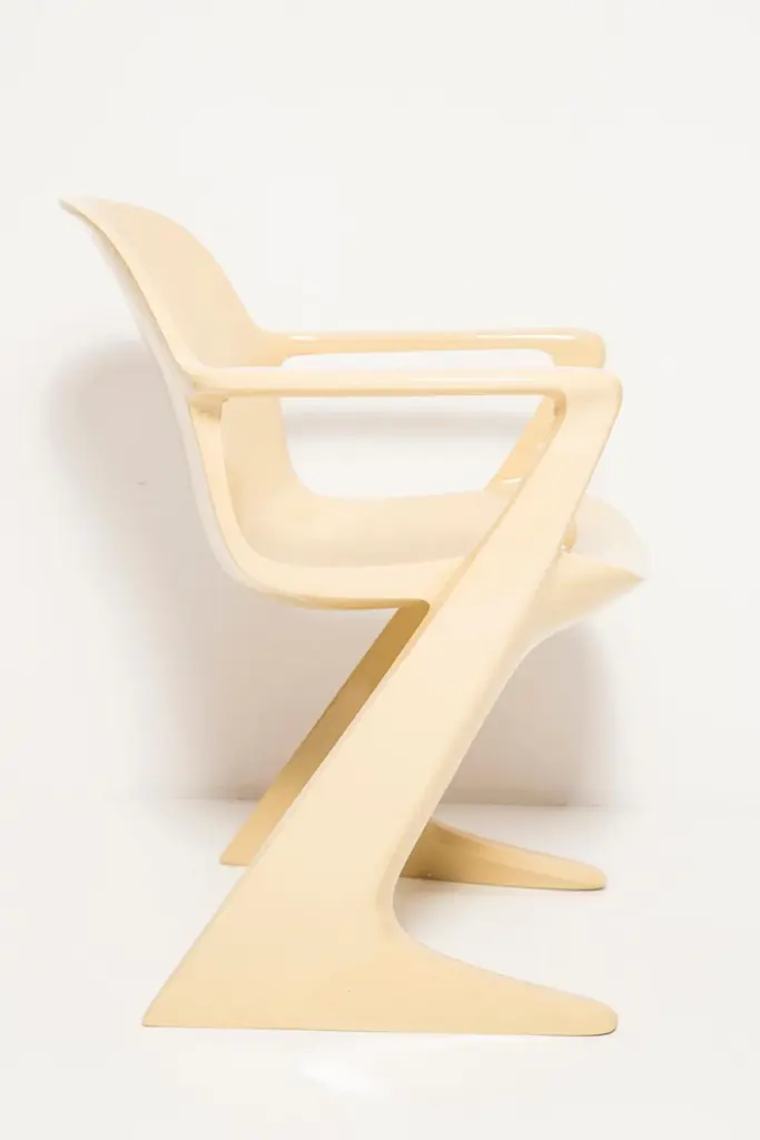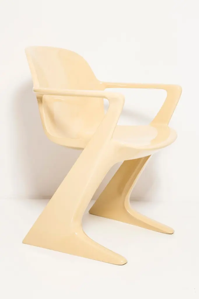 This model is called Z-chair. Designed in 1968 in the GDR by Ernst Moeckl and Siegfried Mehl, German Version of the Panton chair. Also called kangaroo chair or variopur chair. Produced in eastern Germany.The z.stuhl, designed by Ernst Moeckl (1931-2013) in the 1970s, is a cantilever chair made of polyurethane, which is available with and without armrests. In the vernacular, the chair is known by its geometry-related names such as "squatting man", "kangaroo" and "Z-chair".Chair is after full renovation, glossy beige color lacquer. The chair is extremely comfortable! Beautiful organic shape make them timeless and fits to every interior. We can prepare also set of 2, 4 or 6 or more, also in another RAL/Pantone color.