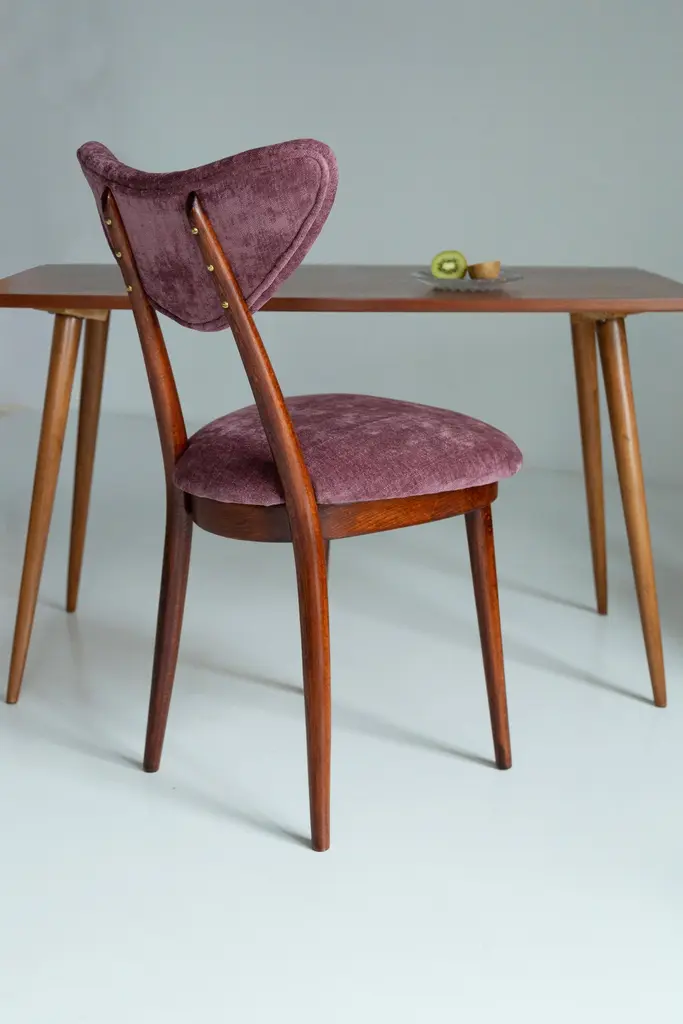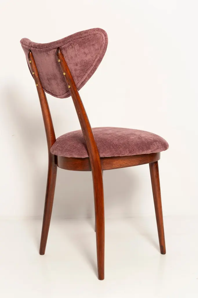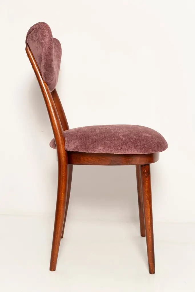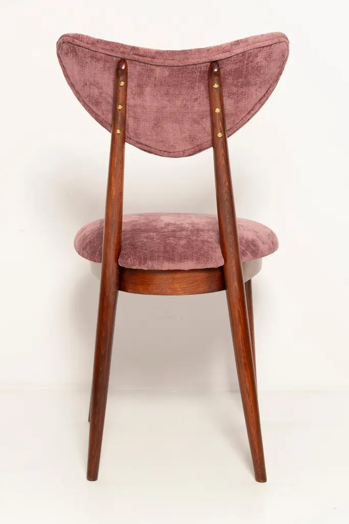 Chair type A5828. Colloquially called "heart". The furniture was designed by Helena and Jerzy Kurmanowicz. They were produced in Radomsko Woodworking Factory and we thoroughly renovated them.The construction is made of beechwood dyed with water stain brown. The chairs are protected with acrylic varnish with a satin glow. The upholstery fabric was produced in the Clean boo technology and has water-repellent properties. This means that the fabric limits the absorption of liquids. Spilled liquid on the surface will form balls. The chairs have undergone a complete carpentry and upholstery renovation. Seats covered with high-quality pink cotton-velvet fabric. ABRASION RESISTANCE Category A (50,000 cycles). This velvet is recommended for public buildings and private interiors. It has Oekotex. We confirm the flame retardancy of the fabric according to the French standard NF P 92-507, classified as M1.We can prepare also smaller or bigger sets of 2, 6, 8, 10 or more chairs in different wood and velvet color.