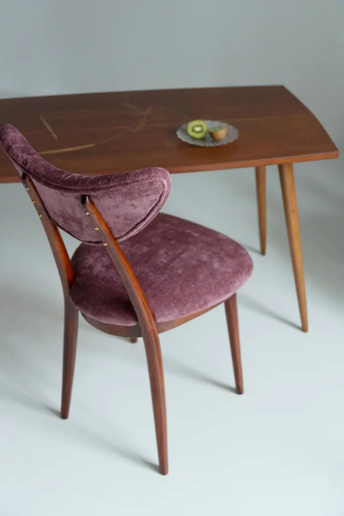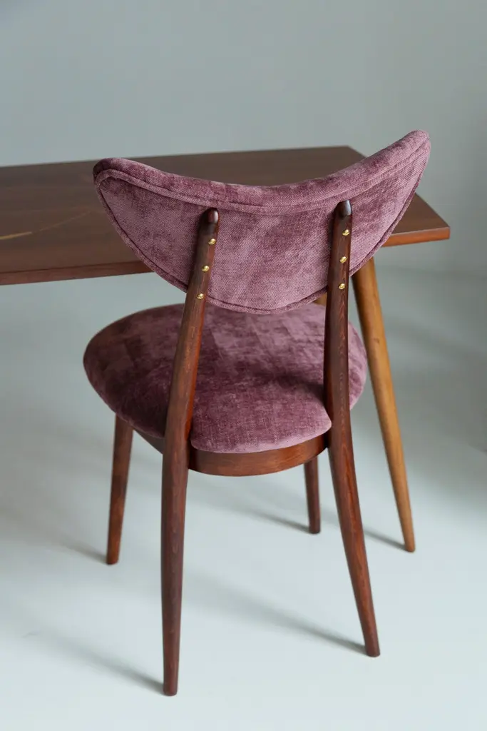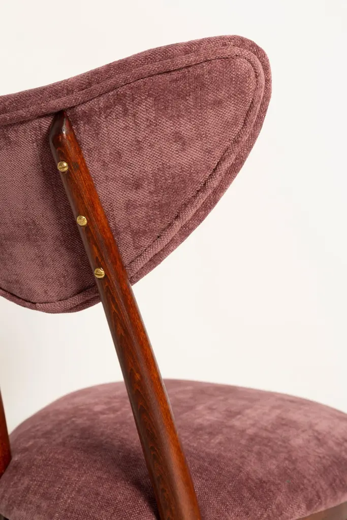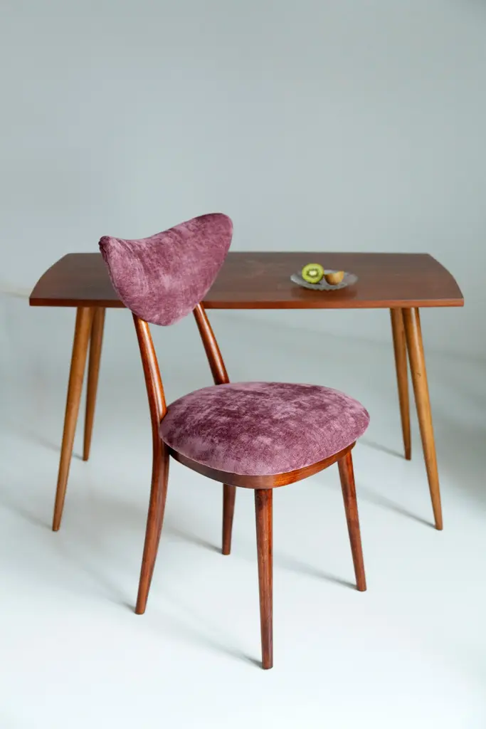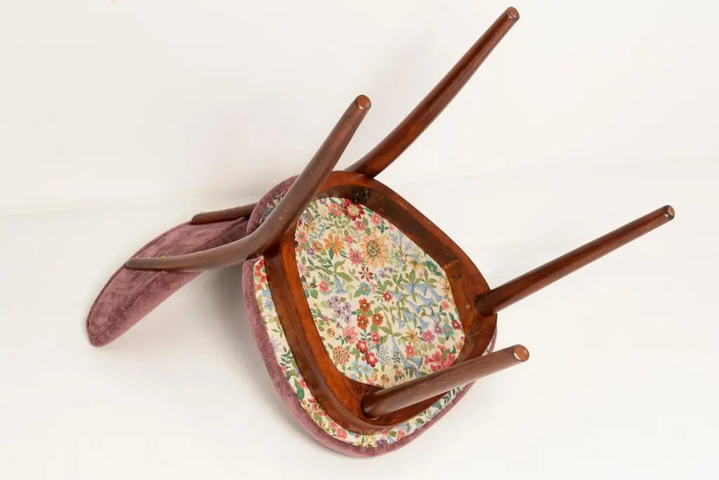 Chair type A5828. Colloquially called "heart". The furniture was designed by Helena and Jerzy Kurmanowicz. They were produced in Radomsko Woodworking Factory and we thoroughly renovated them.The construction is made of beechwood dyed with water stain brown. The chairs are protected with acrylic varnish with a satin glow. The upholstery fabric was produced in the Clean boo technology and has water-repellent properties. This means that the fabric limits the absorption of liquids. Spilled liquid on the surface will form balls. The chairs have undergone a complete carpentry and upholstery renovation. Seats covered with high-quality pink cotton-velvet fabric. ABRASION RESISTANCE Category A (50,000 cycles). This velvet is recommended for public buildings and private interiors. It has Oekotex. We confirm the flame retardancy of the fabric according to the French standard NF P 92-507, classified as M1.We can prepare also smaller or bigger sets of 2, 6, 8, 10 or more chairs in different wood and velvet color.