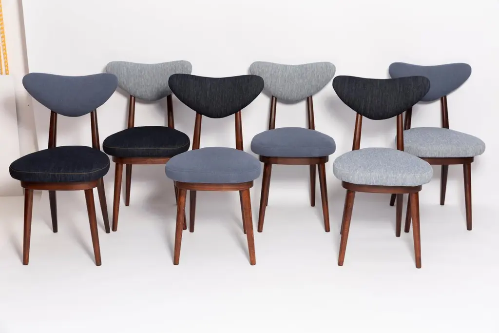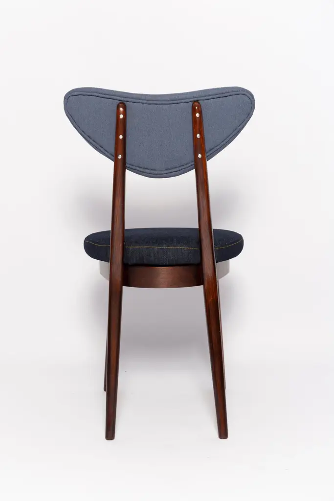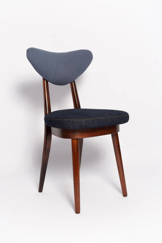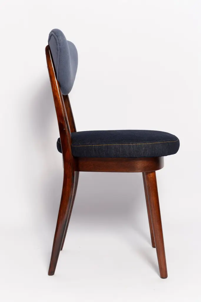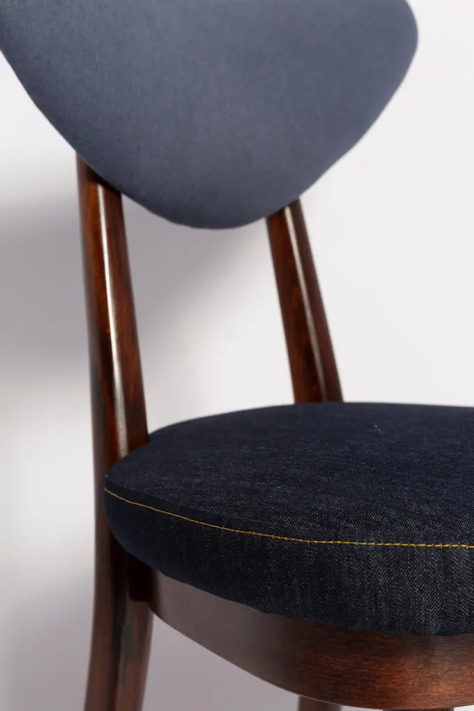 Chair type A5828. Colloquially called "heart". The furniture was designed by Helena and Jerzy Kurmanowicz. They were produced in Radomsko Woodworking Factory in 1960s and we thoroughly renovated them.The construction is made of beechwood dyed with water stain brown. The chairs are protected with acrylic varnish with a satin glow. The upholstery fabric was produced in the Clean boo technology and has water-repellent properties. This means that the fabric limits the absorption of liquids. Spilled liquid on the surface will form balls. The chairs have undergone a complete carpentry and upholstery renovation. Seats covered with high-quality denim fabric. Mixed colors available. We have 6 options to choose. This denim is recommended for public buildings and private interiors. It has Oekotex. We confirm the flame retardancy of the fabric according to the French standard NF P 92-507, classified as M1.Please check the last pictures with denim option samples.