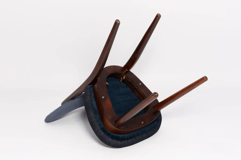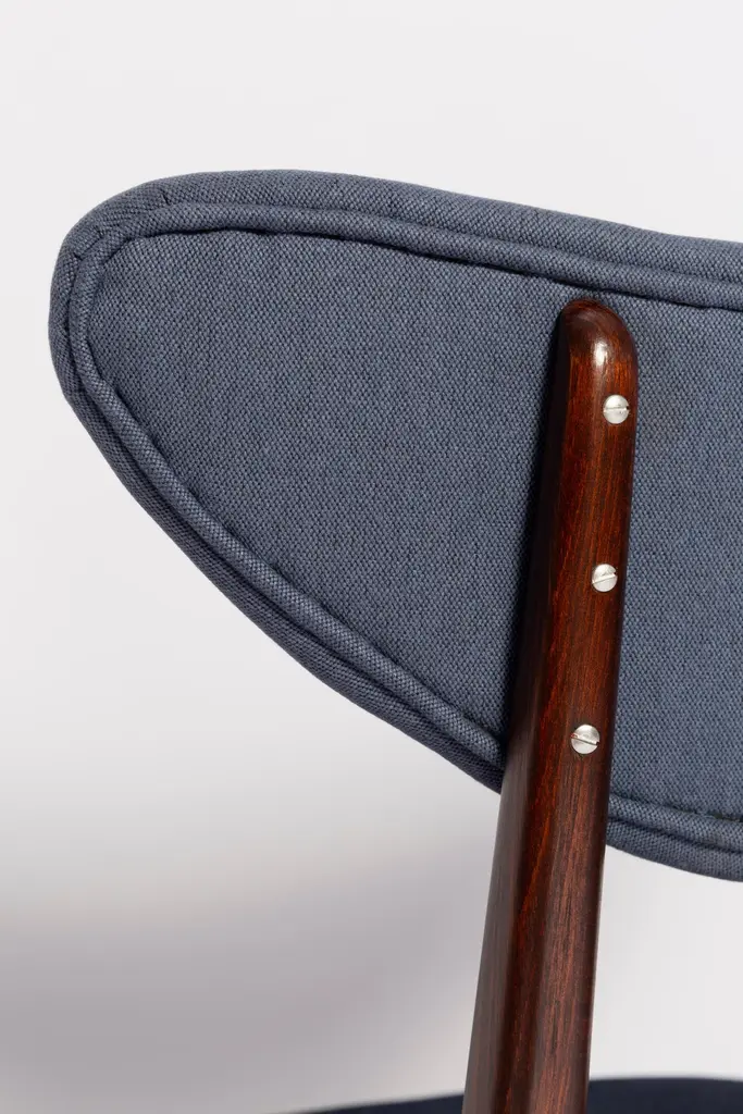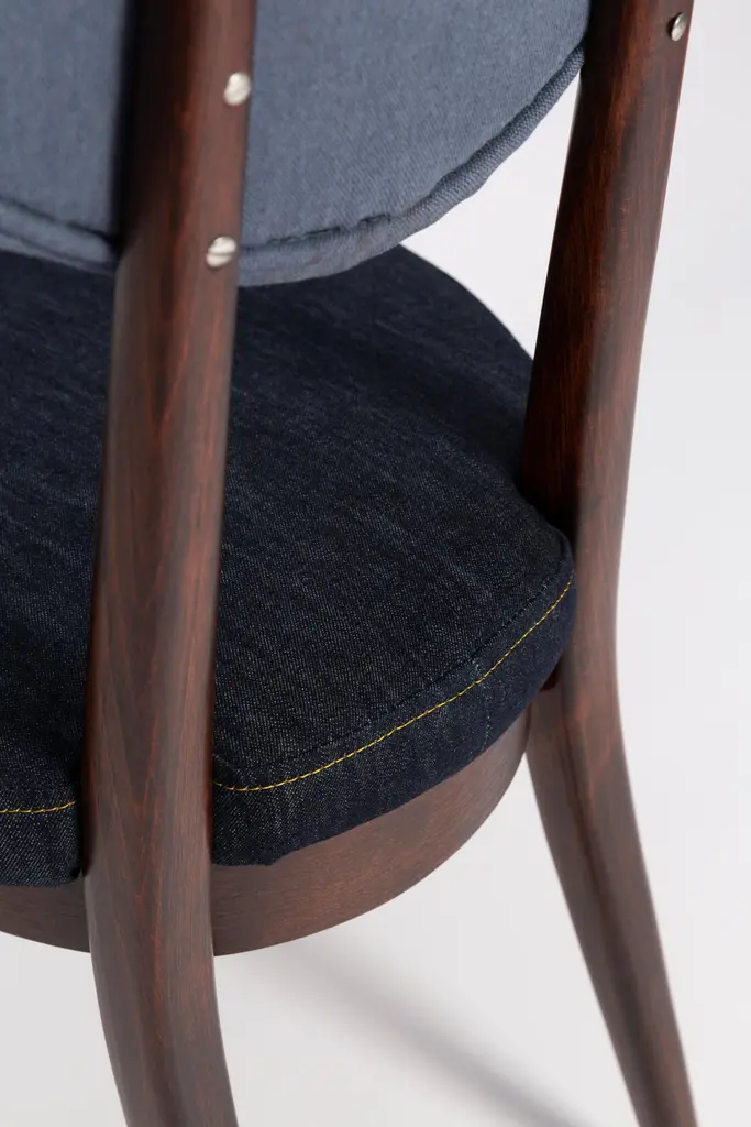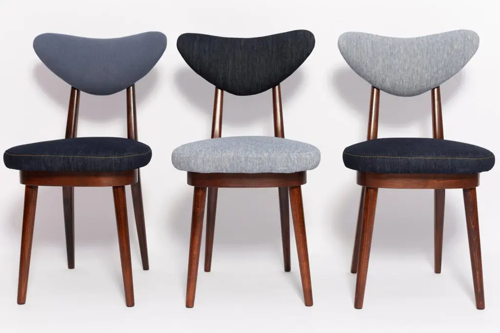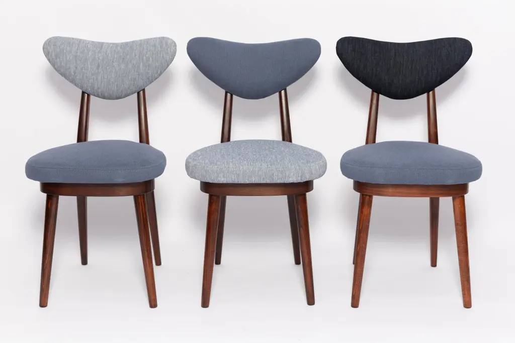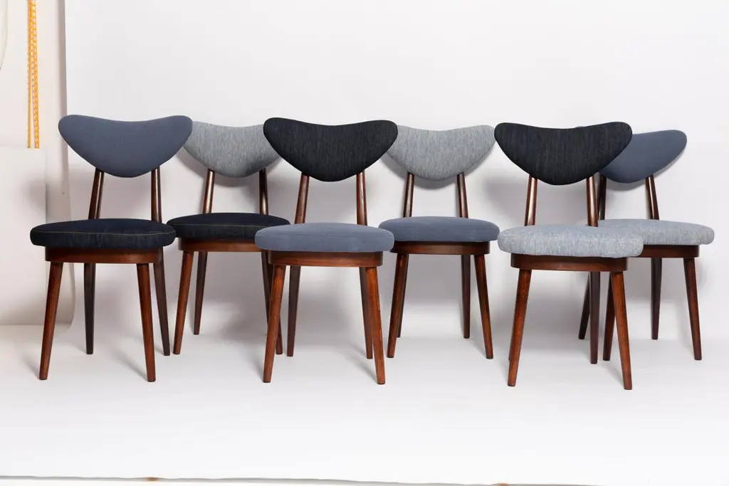 Chair type A5828. Colloquially called "heart". The furniture was designed by Helena and Jerzy Kurmanowicz. They were produced in Radomsko Woodworking Factory in 1960s and we thoroughly renovated them.The construction is made of beechwood dyed with water stain brown. The chairs are protected with acrylic varnish with a satin glow. The upholstery fabric was produced in the Clean boo technology and has water-repellent properties. This means that the fabric limits the absorption of liquids. Spilled liquid on the surface will form balls. The chairs have undergone a complete carpentry and upholstery renovation. Seats covered with high-quality denim fabric. Mixed colors available. We have 6 options to choose. This denim is recommended for public buildings and private interiors. It has Oekotex. We confirm the flame retardancy of the fabric according to the French standard NF P 92-507, classified as M1.Please check the last pictures with denim option samples.